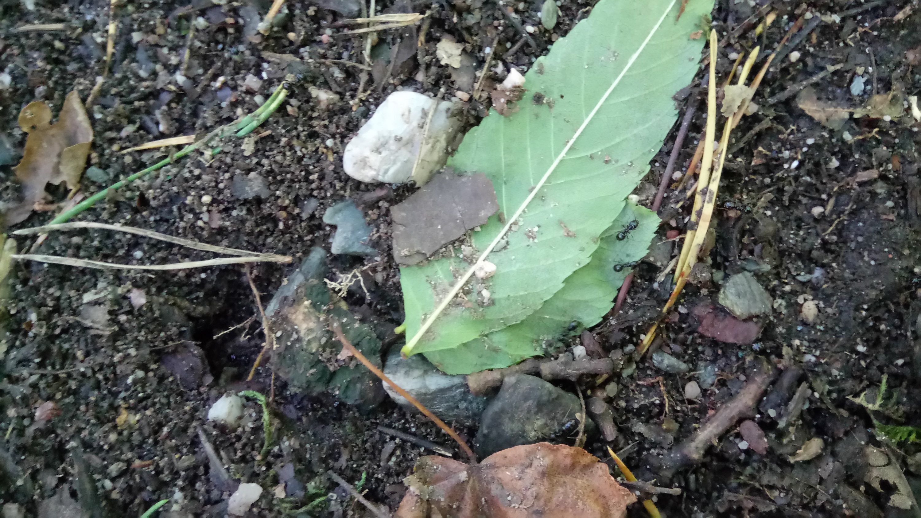Zu dieser Kolonie kann ich noch sagen, dass ich an einer Stelle mit etwas Einblick in das Nest hatte und Geschlechtstiere sehen konnte. Die Jungköniginnen waren ungefĂ€hr einen Zentimeter groĂ (ich tendiere zu etwas kleiner) und die MĂ€nnchen kaum gröĂer als die Arbeiterinnen, beide Geschlechtstiere waren sehr dunkel (ich wĂŒrde meinen schwarz, aber es war schlecht beleuchtet).