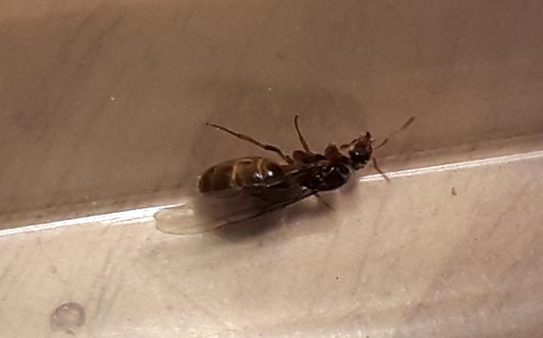Tatsächlich war es eine Königin, die noch mit einem Männchen in Paarung befindlich war. Sie hingen noch zusammen, sind dann aber weggeflogen.
