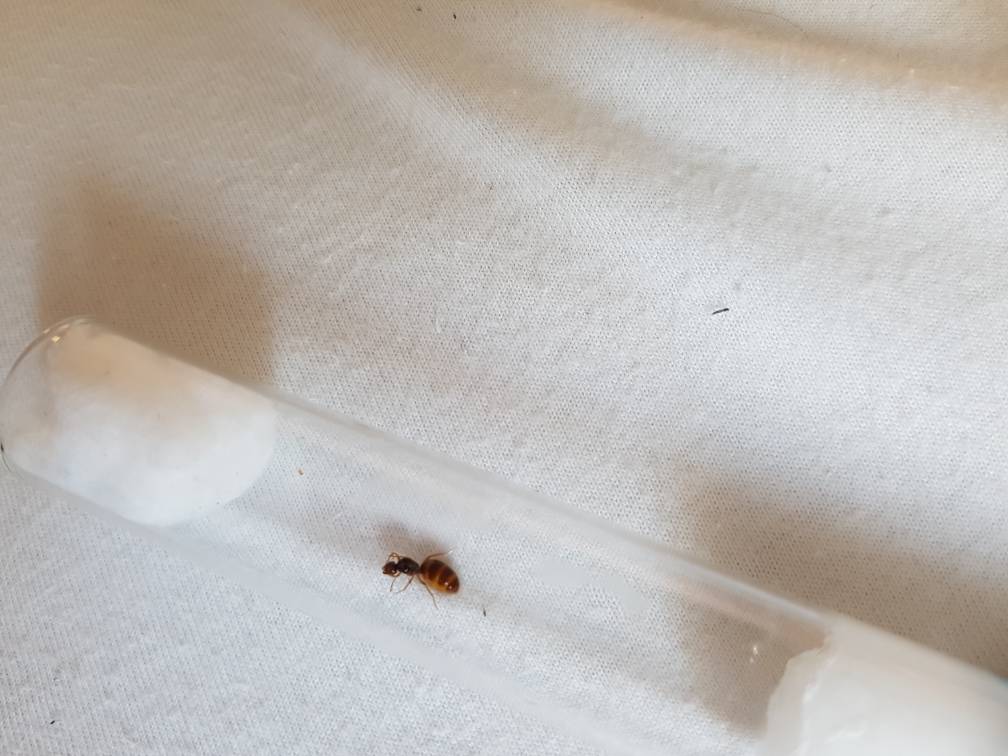 Königin gefunden. 16.07.2018, 17:30 - 18:30 auf einem Asphaltweg zwischen den Feldern. Sie hatte bereits keine Flügel und war schon auf der Suche. Sie ist ca. 9 mm lang und wirkt im richtigen Licht gelblich.