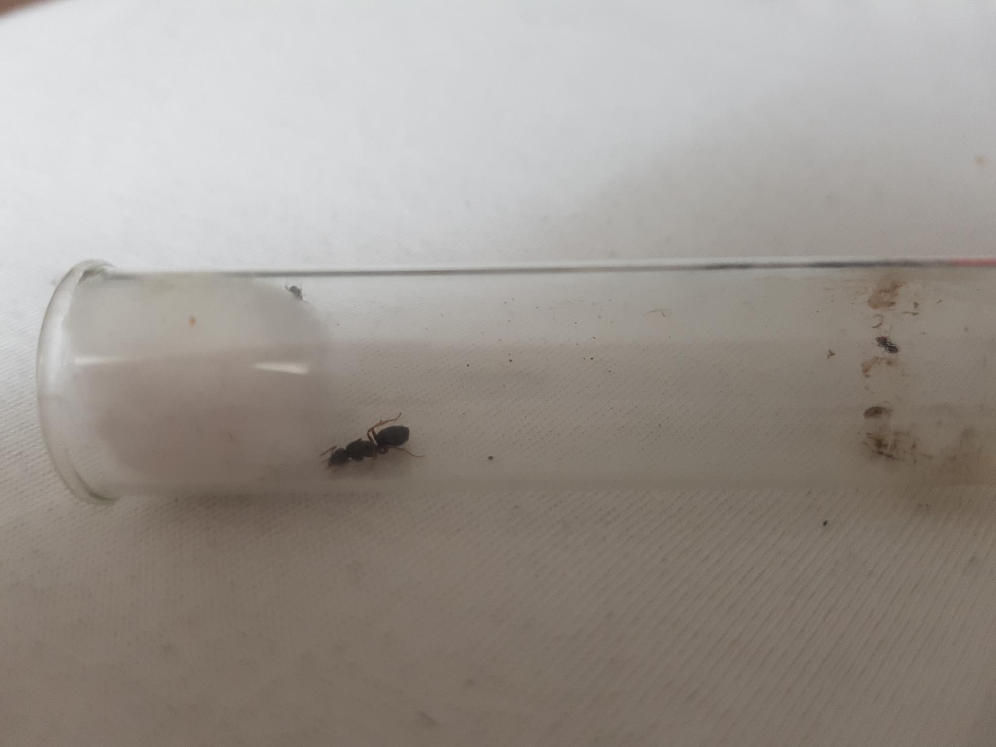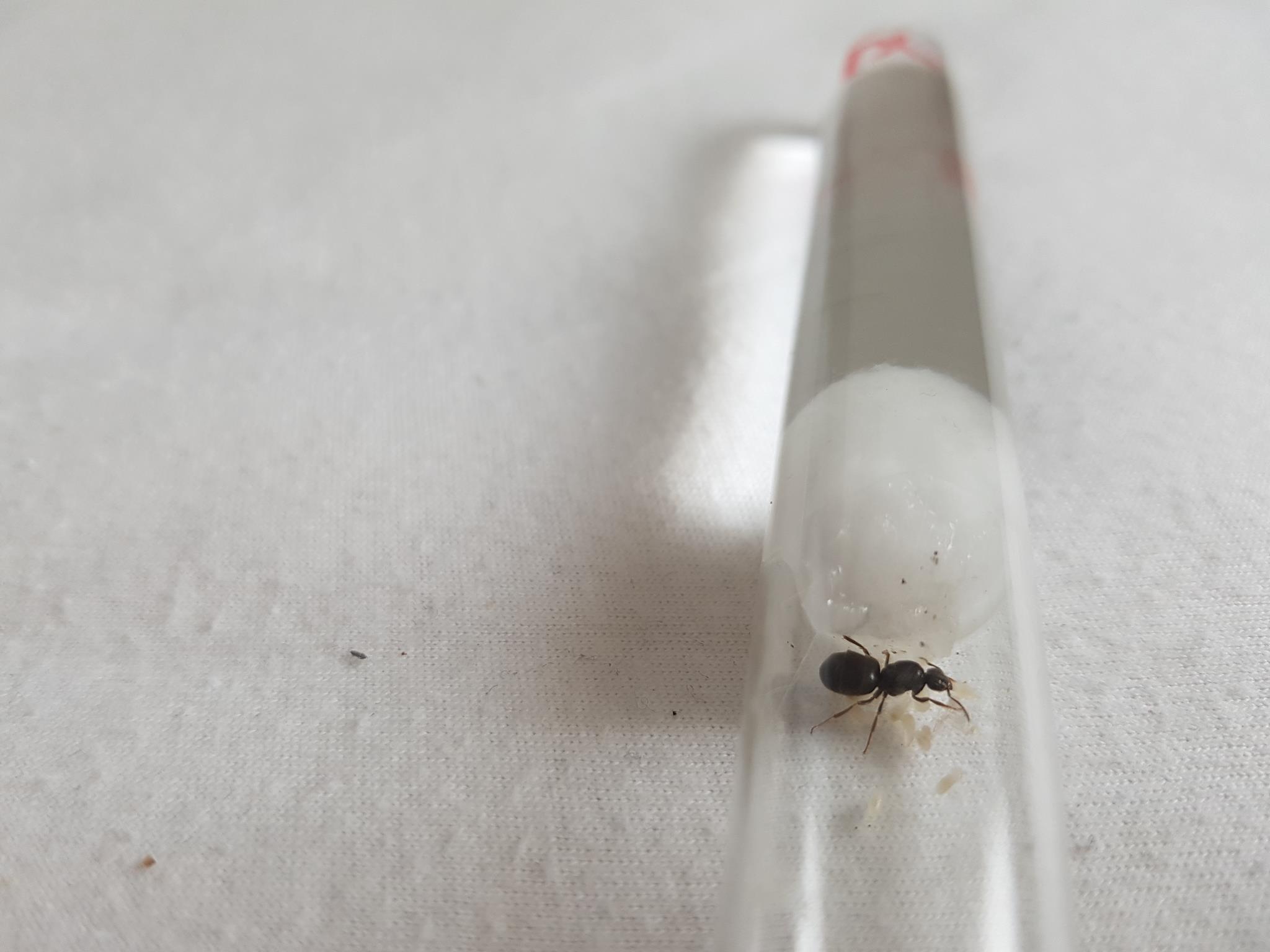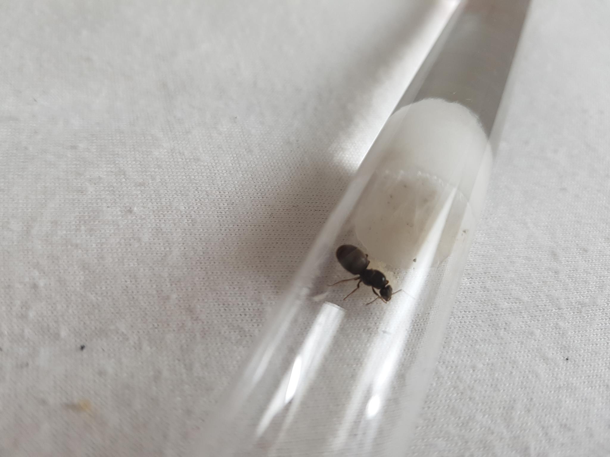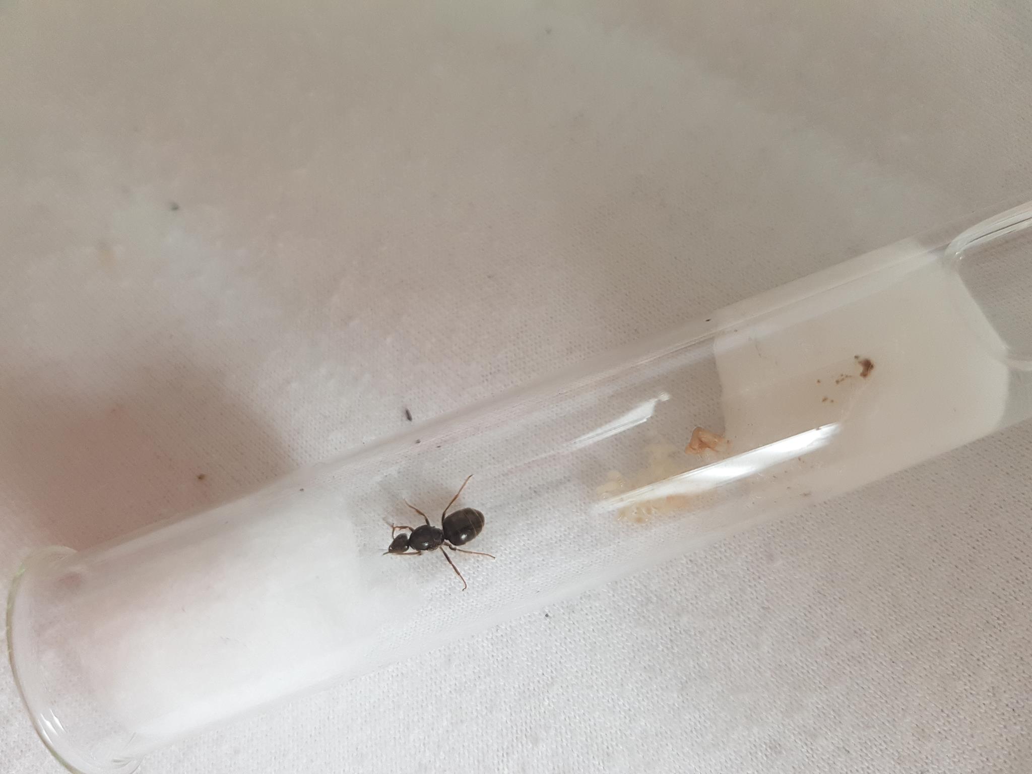 Glas Nr. 2 (ca. 12 mm, schwarz, Verhalten unaufällig). Glas Nr. 1 ist meine eigene Lasius cf. flavus. Nur zur Erläuterung, dass sich keiner wundert, warum ich mit Glas Nr. 2 anfange.