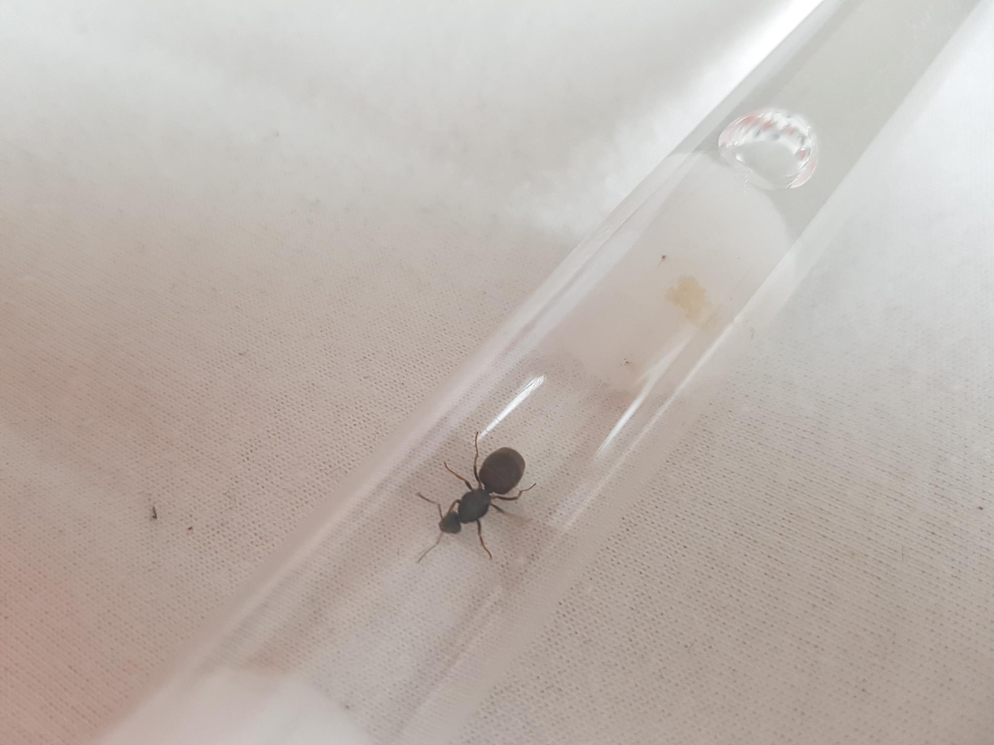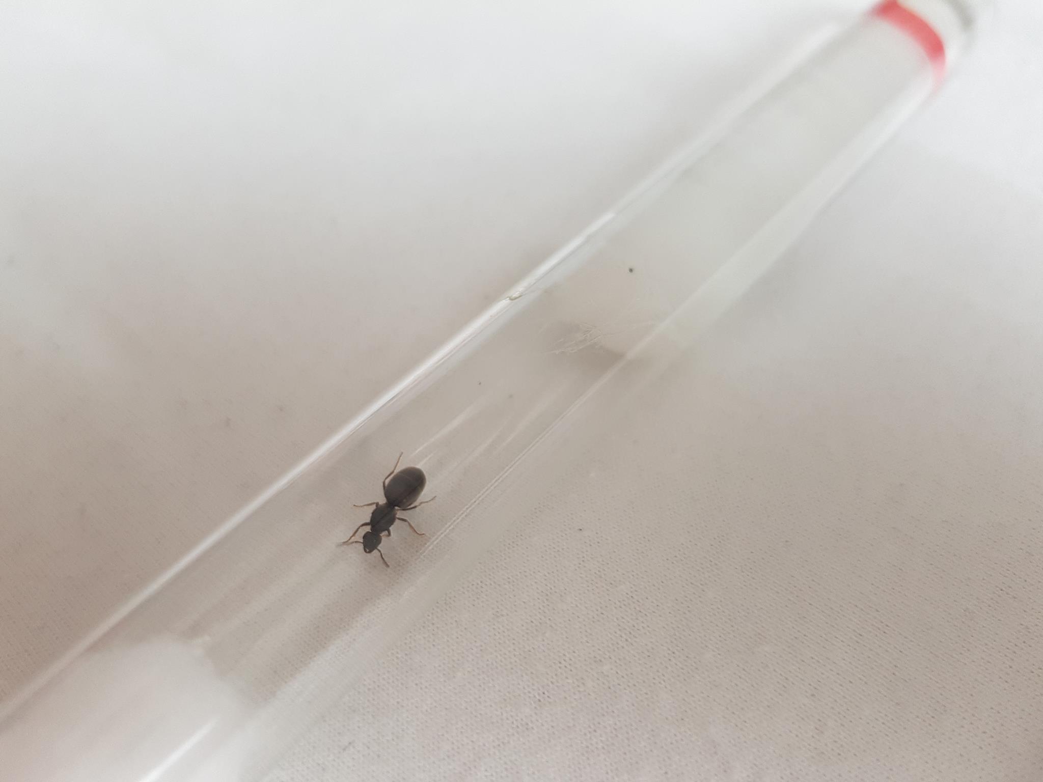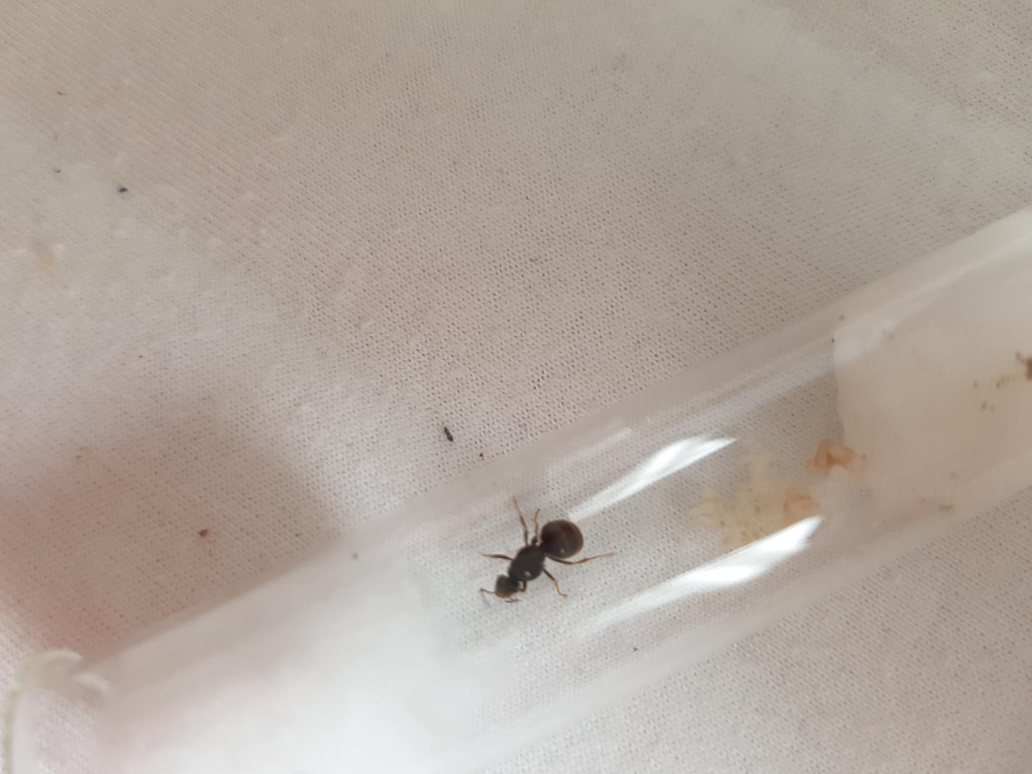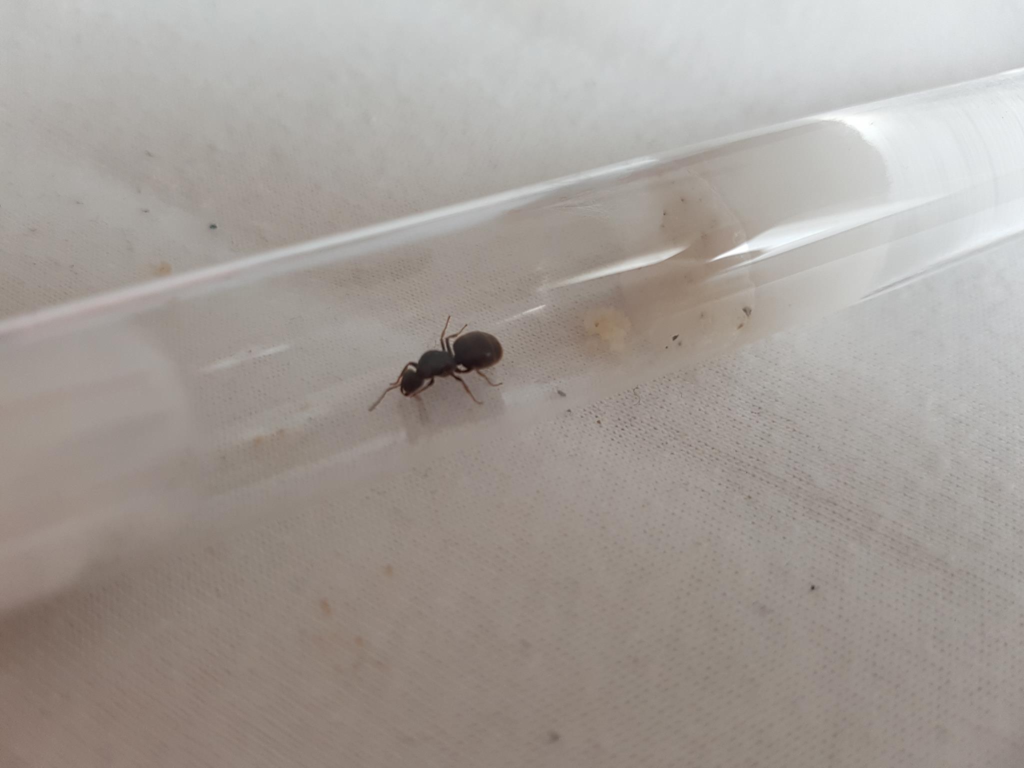 Glas Nr. 2 (ca. 12 mm, schwarz, Verhalten unaufällig). Glas Nr. 1 ist meine eigene Lasius cf. flavus. Nur zur Erläuterung, dass sich keiner wundert, warum ich mit Glas Nr. 2 anfange.