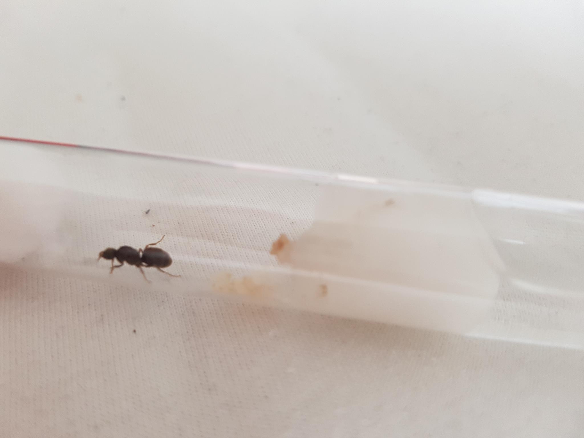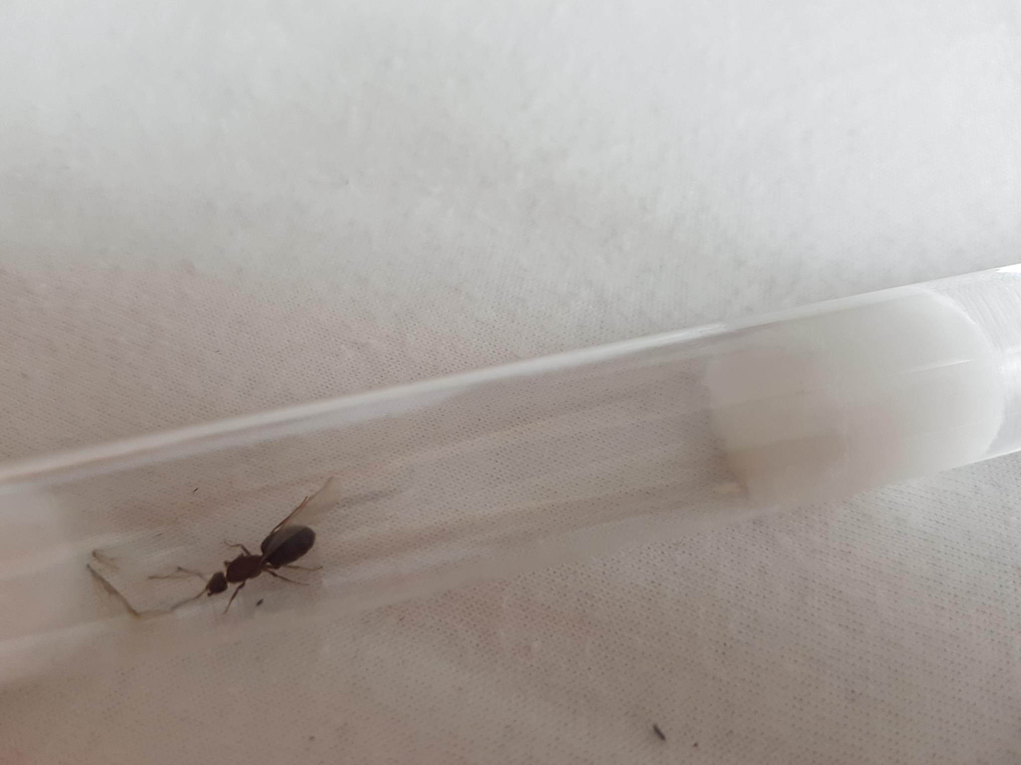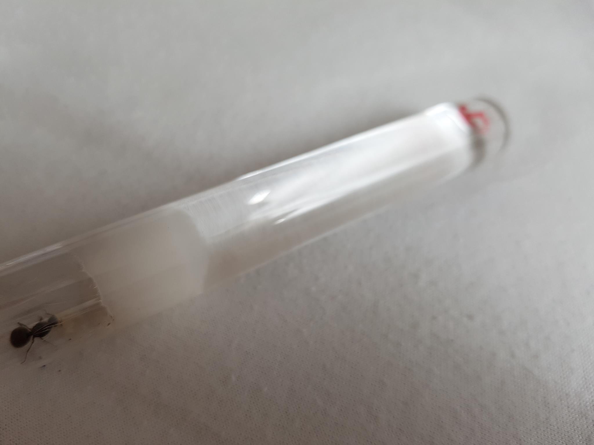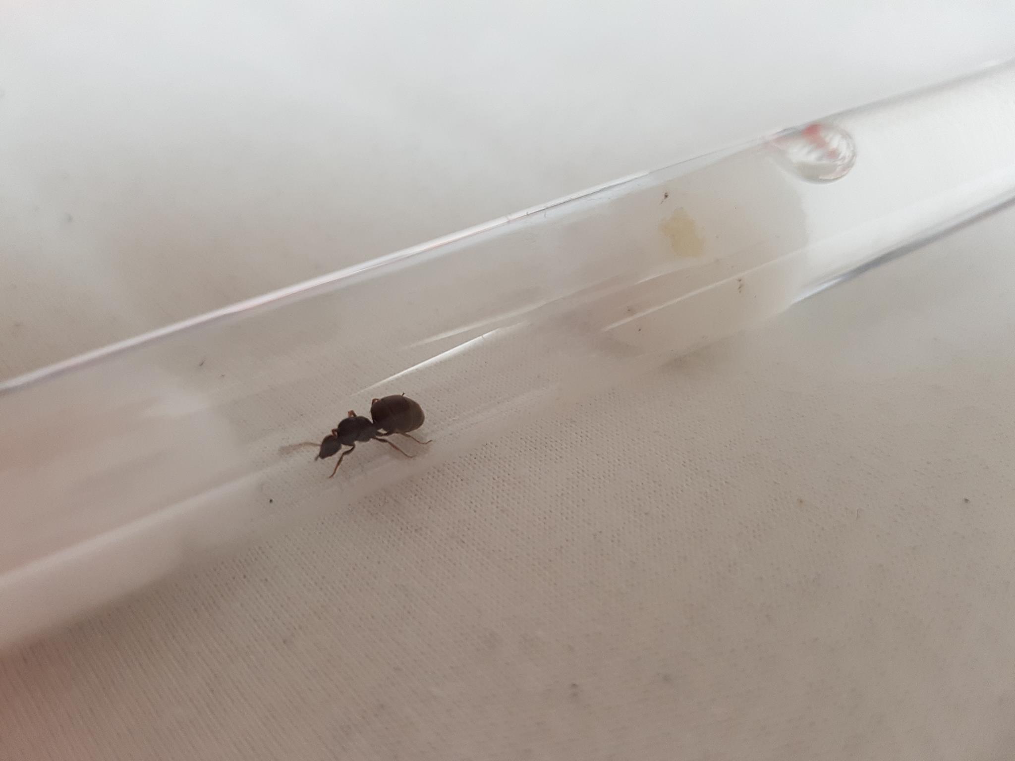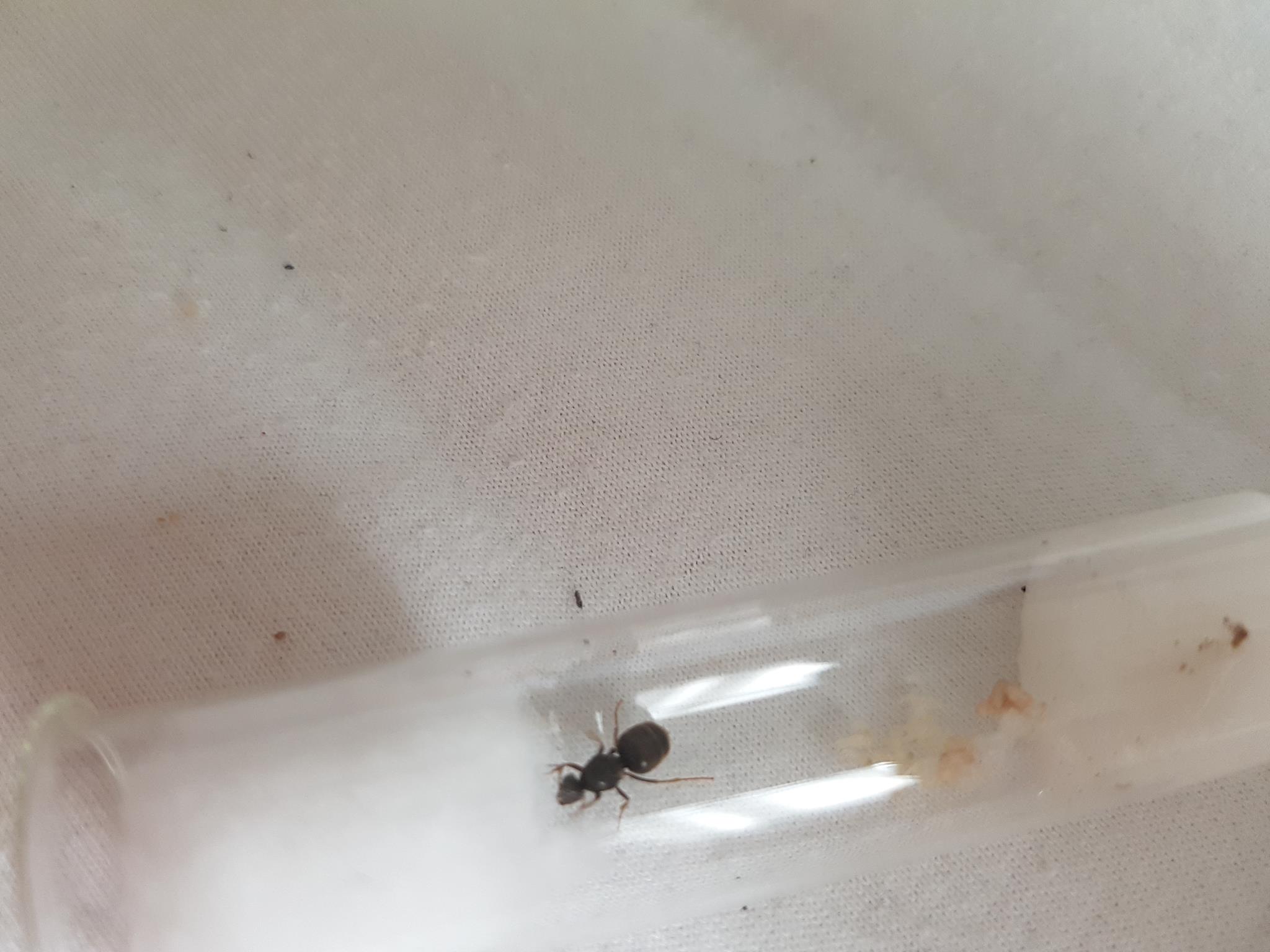 Glas Nr. 2 (ca. 12 mm, schwarz, Verhalten unaufällig). Glas Nr. 1 ist meine eigene Lasius cf. flavus. Nur zur Erläuterung, dass sich keiner wundert, warum ich mit Glas Nr. 2 anfange.