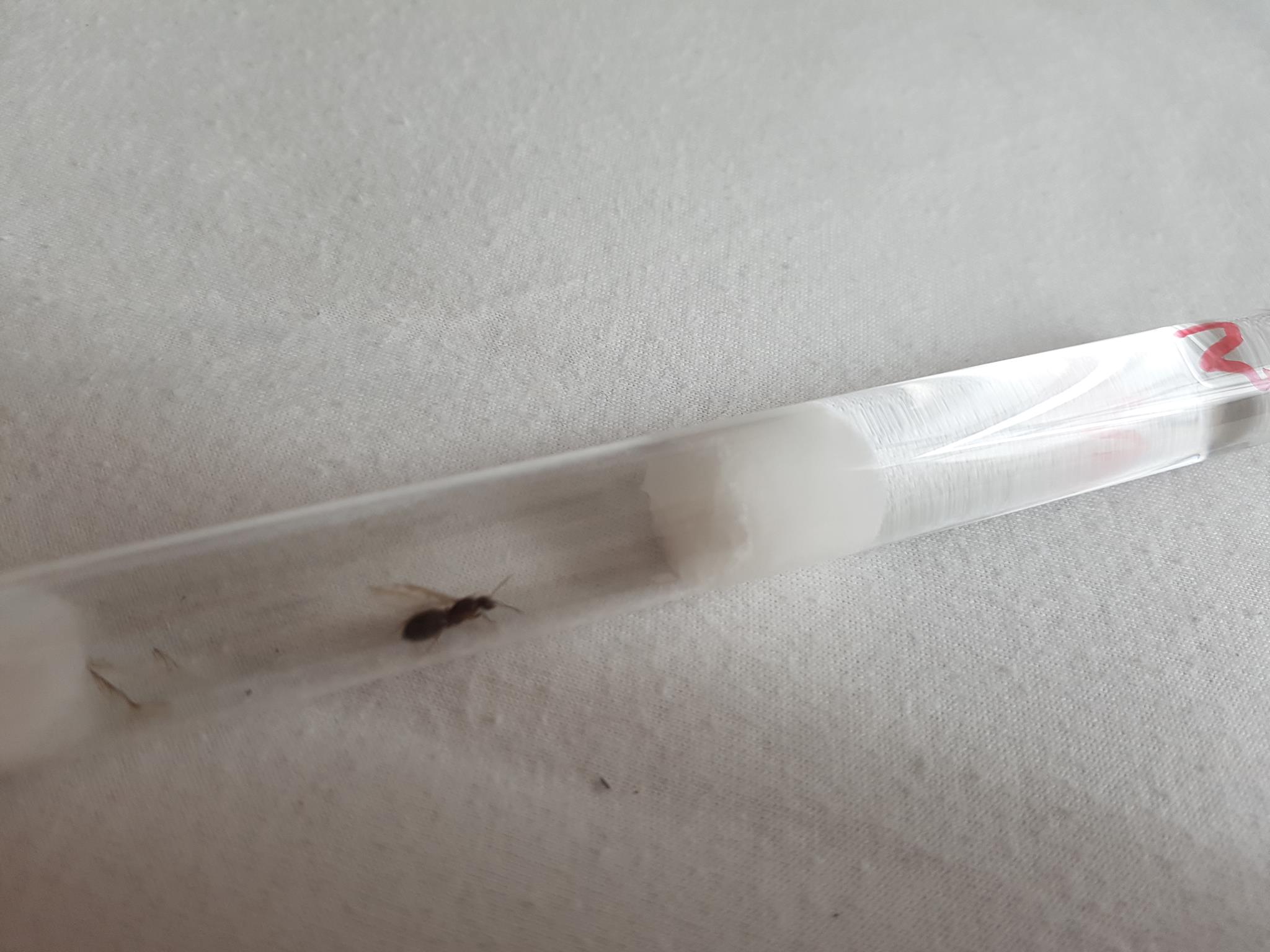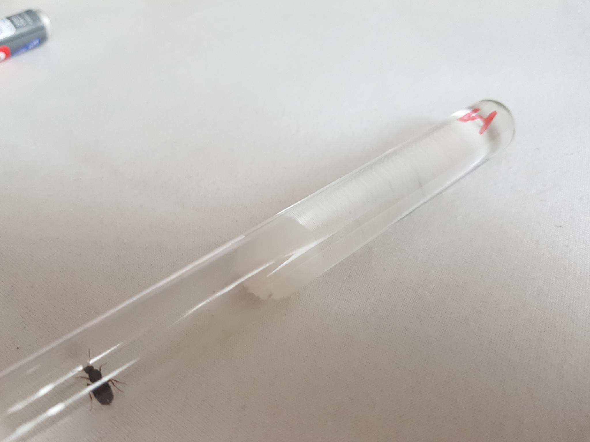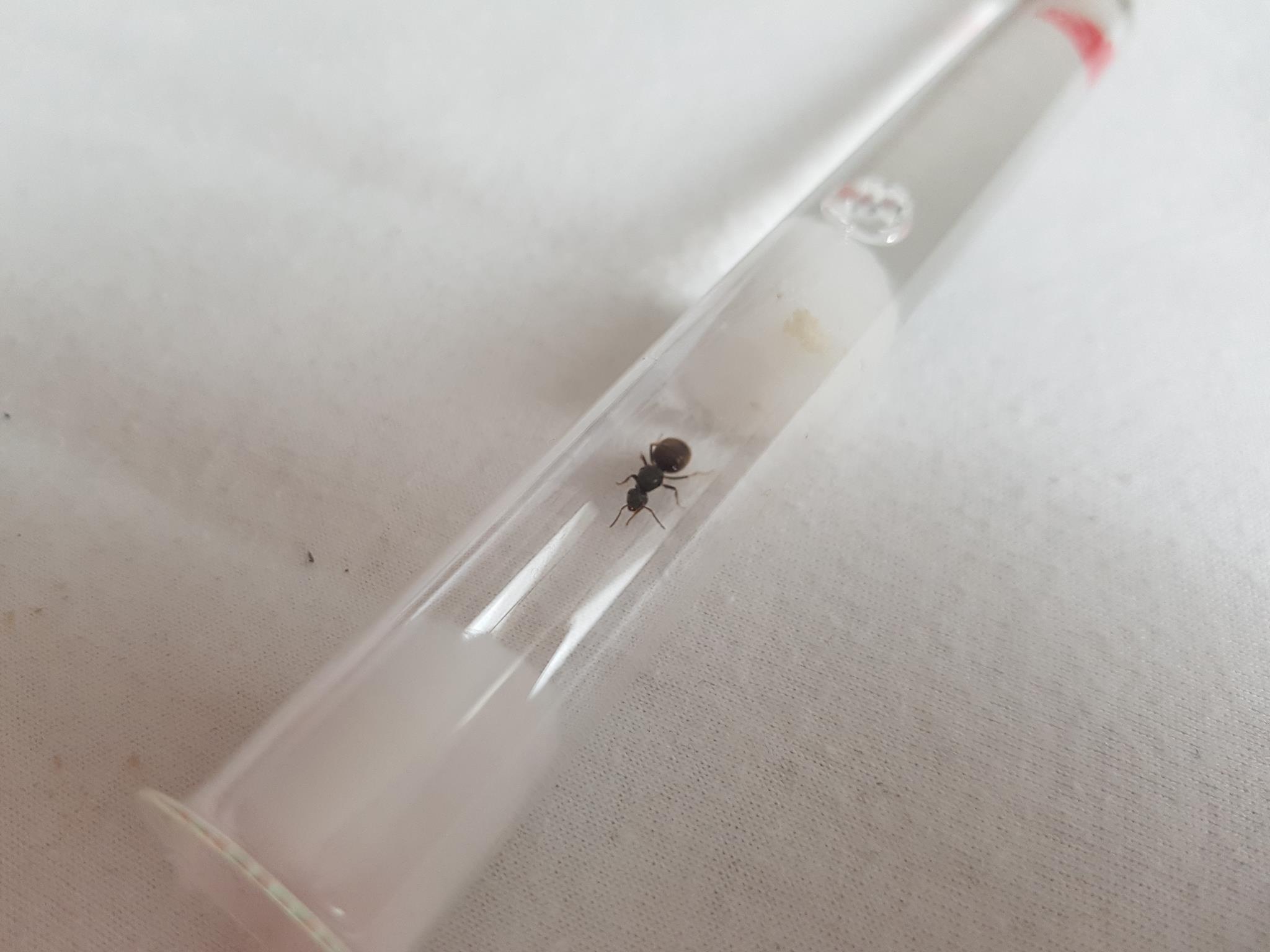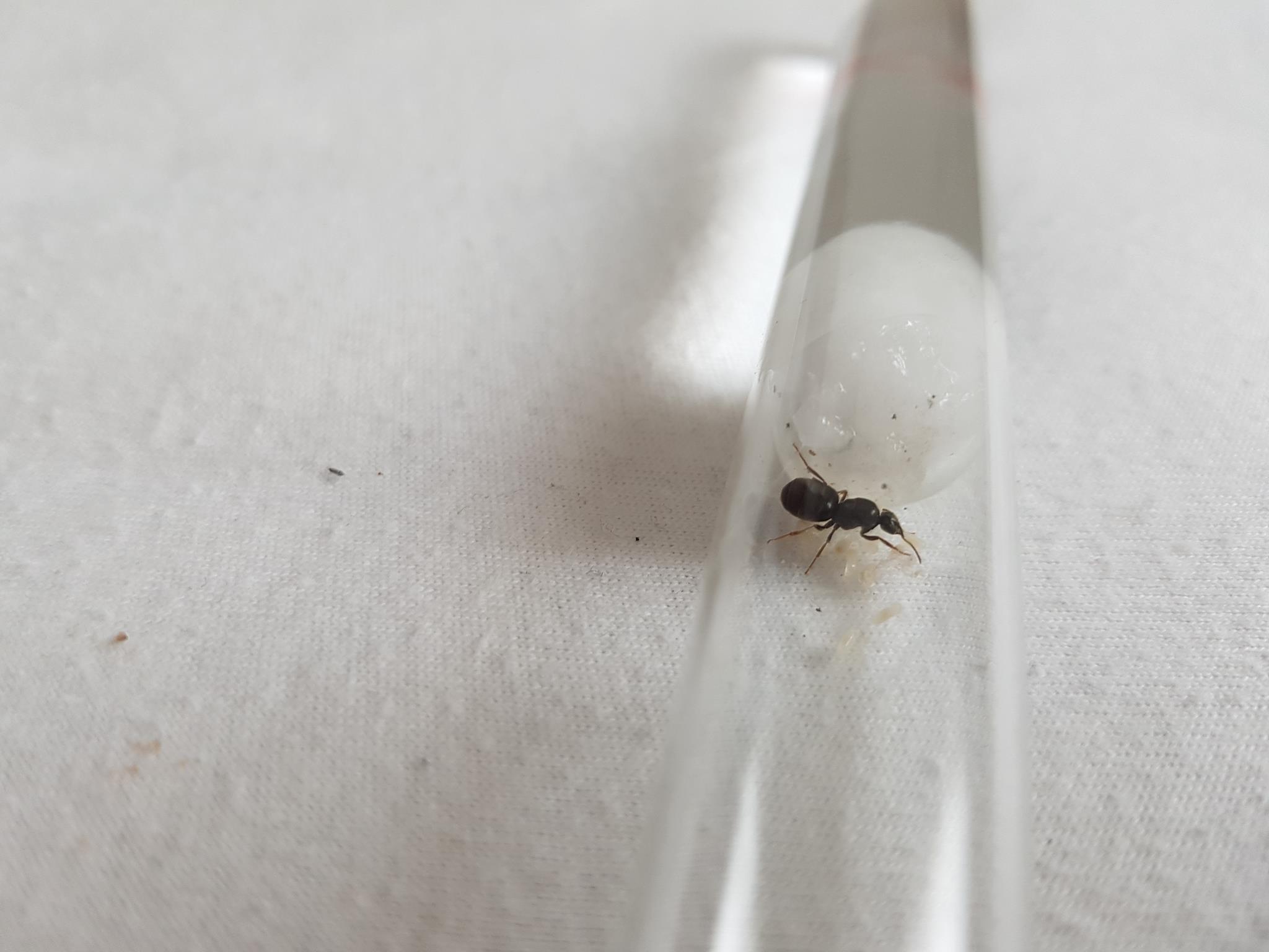 Glas Nr. 2 (ca. 12 mm, schwarz, Verhalten unaufällig). Glas Nr. 1 ist meine eigene Lasius cf. flavus. Nur zur Erläuterung, dass sich keiner wundert, warum ich mit Glas Nr. 2 anfange.