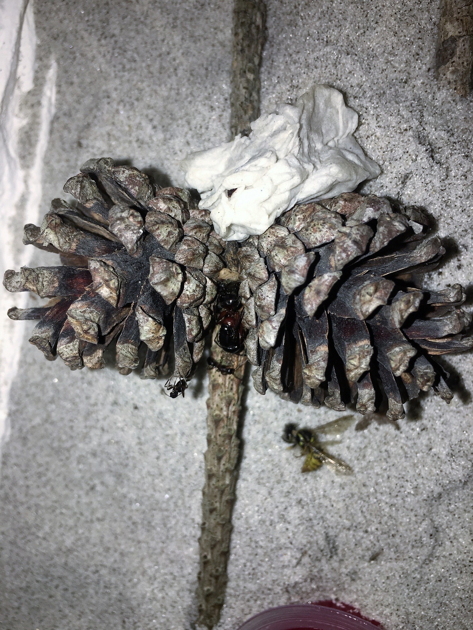 Die Königin sitzt immer noch in dem Tannenzapfen.zuerst war sie im Schlauchadapter ,danach wanderte sie in den Zapfen.