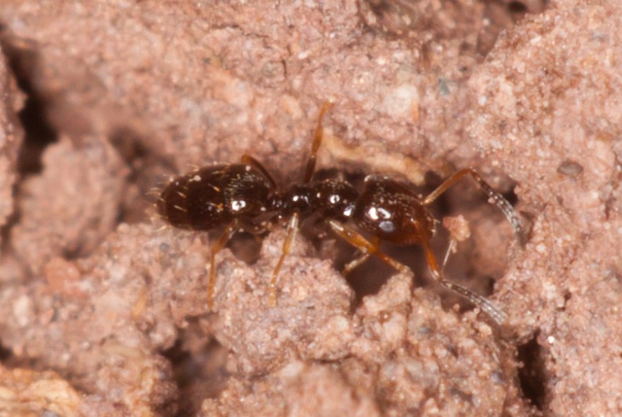 gestern fand ich mehrere, einzelne, wieder winzig kleine Ameisen an einem felsigen Trockenhang. Sie waren leider sehr schnell unterwegs, so daß es mit dem Foto eher eine Sache des Glücks war. Ich würde das für Plagiolepis halten wollen. Aufgrund der im Seifert erwähnten Verbreitung käme wohl nur Plagiolepis vindobonensis in Frage, aber eine Artbestimmung erwarte ich natürlich nicht. Die