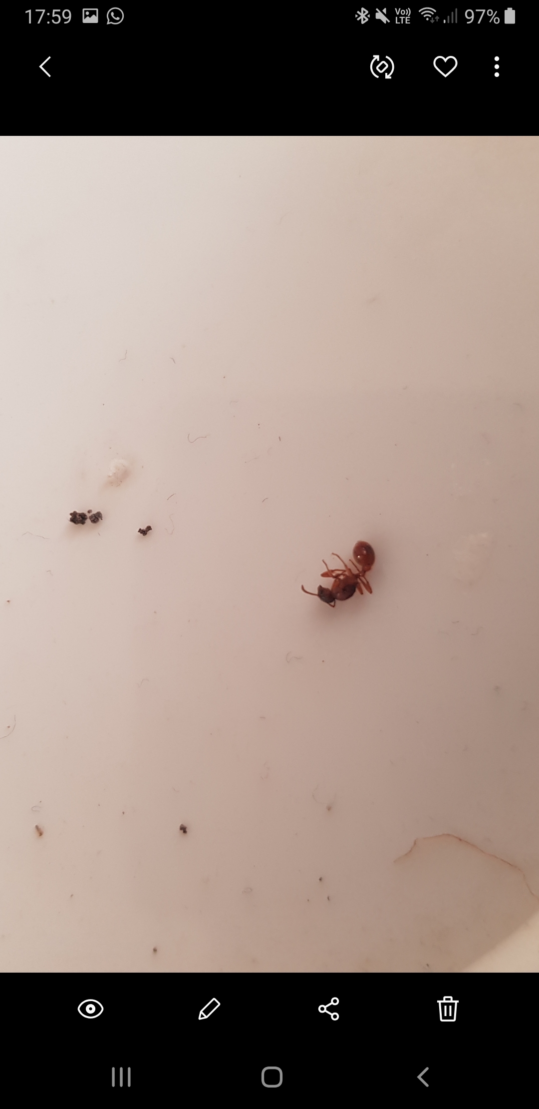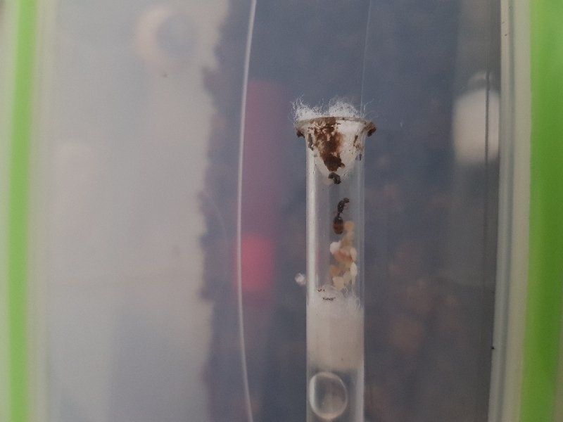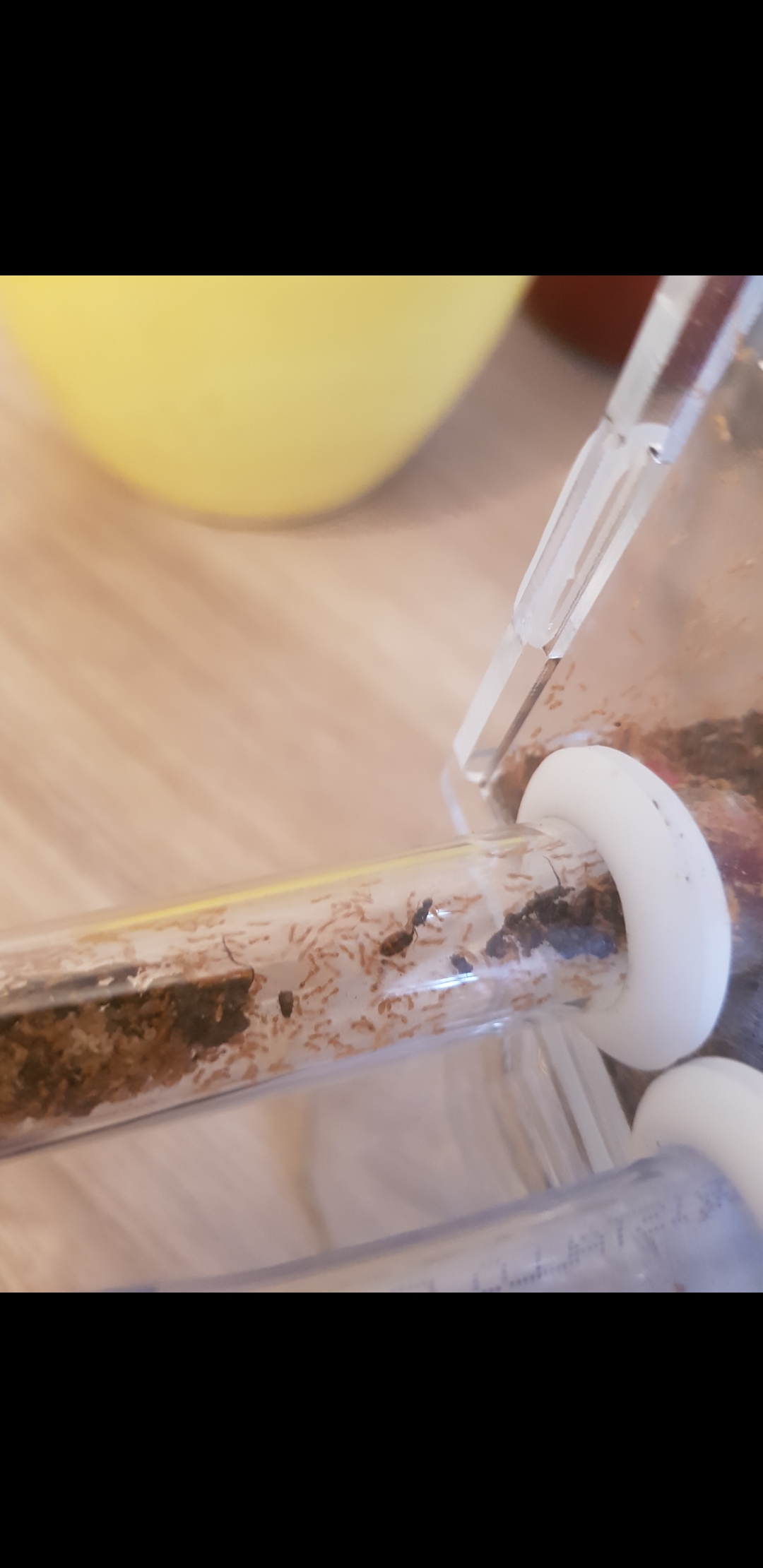 So hier ein kleines Update zu meiner Solenopsis fugax Kolonie. Habe ein paar hundert Arbeiterinnen gerettet, bevor wir im Garten umbauen und habe 3 Gynen, die ich vor einiger Zeit gefunden habe, dazu getan. 2 davon wurden direkt angegriffen und die etwas wehrhaftere Gyne konnte sich beweisen und wurde aufgenommen. Sie wird jetzt gerade in ein Nest gebracht, welches aus Erde besteht und mit einem Plastikschlauch an die mini Arena angehängt ist. Nun haben sie 2 Erdnester (alte Konfitüregläser) und eine mini Arena. Eine Vase halb gefüllt mit Wasser bildet einen Wassergraben um das eine Erdnest, da sie es irgendwie geschafft haben auszubrechen. Etwa 50 Arbeiterinnen befanden sich bis kurz vorhin noch im Wassergraben. Habe sie mit einer Pinzette rausgeholt und in die Arena zurückgebracht. Nun wird die adoptiere Gyne in eines der beiden Erdnester getragen. Updates folgen