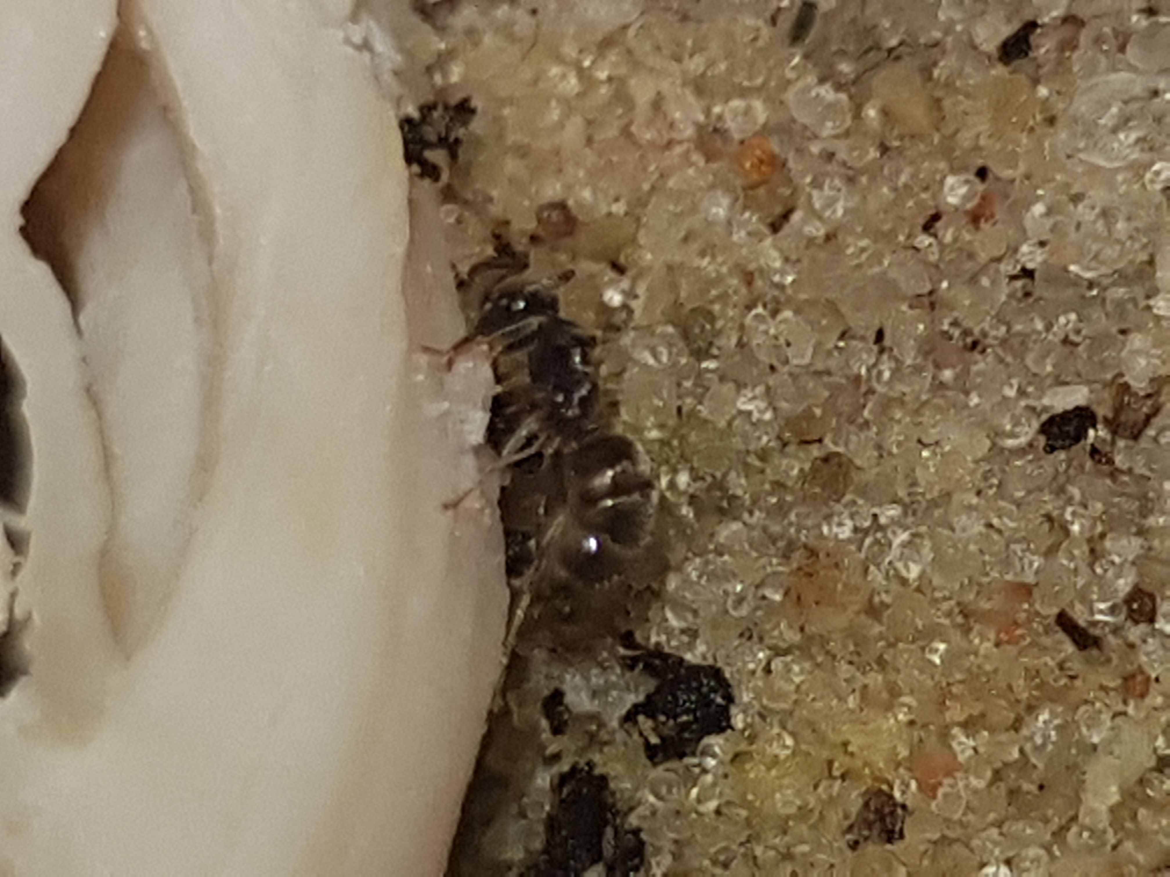 Am Fleisch direkt habe ich Ameisen gesehen, die mir Fremd wirkten. Ihre Gaster sind im Vergleich zu den anderen größer, länger und teilweise transparent. Außerdem haben sie weiße Beine und schienen deutlich aggressiver als meine vollschwarzen lasius niger Bild