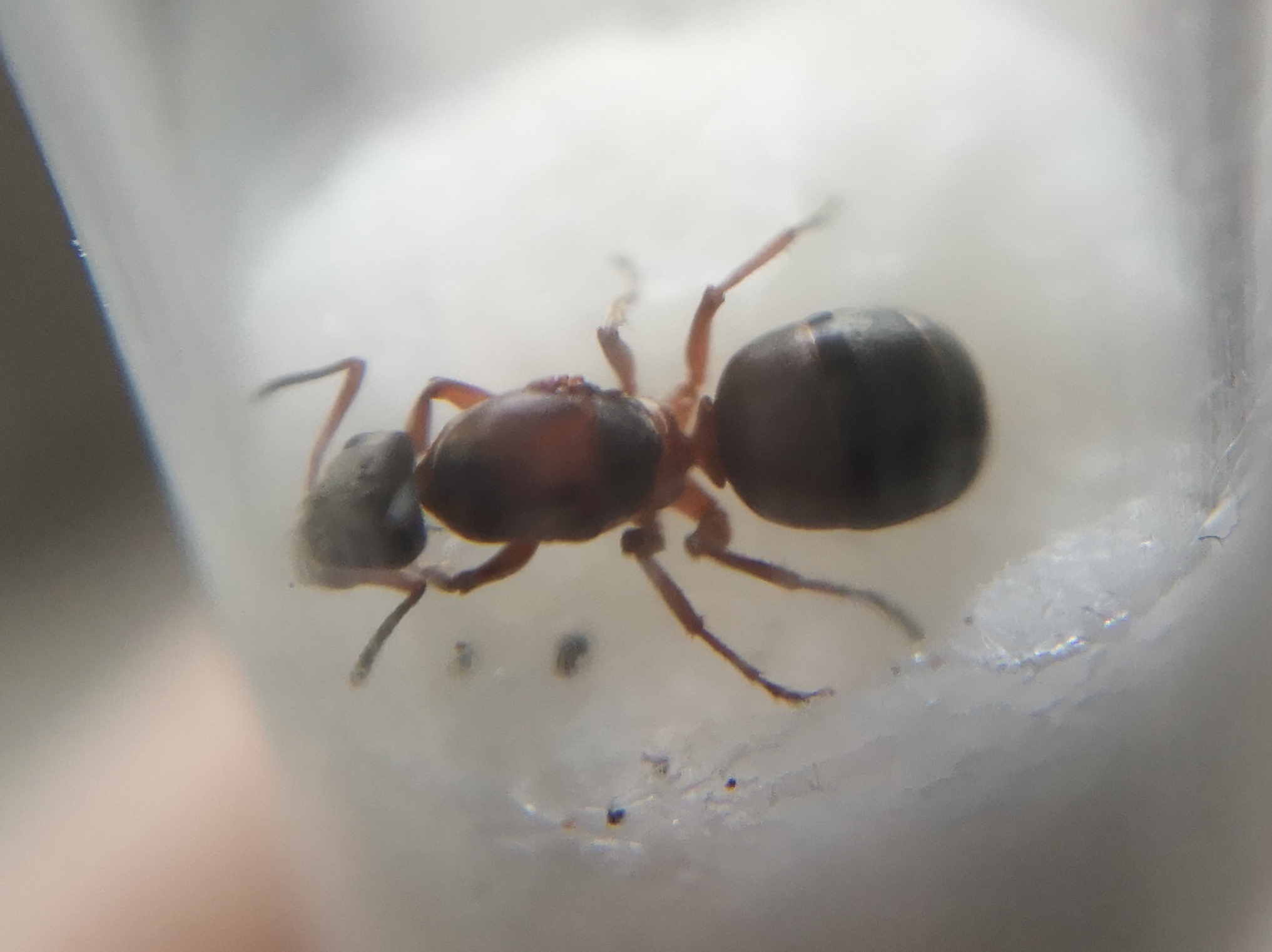 Auch Formica cunicularia passt hier nicht ganz. Zwar ist diese Art eine der drei claustralen, roten Formica Arten, aber da die Oberseite des