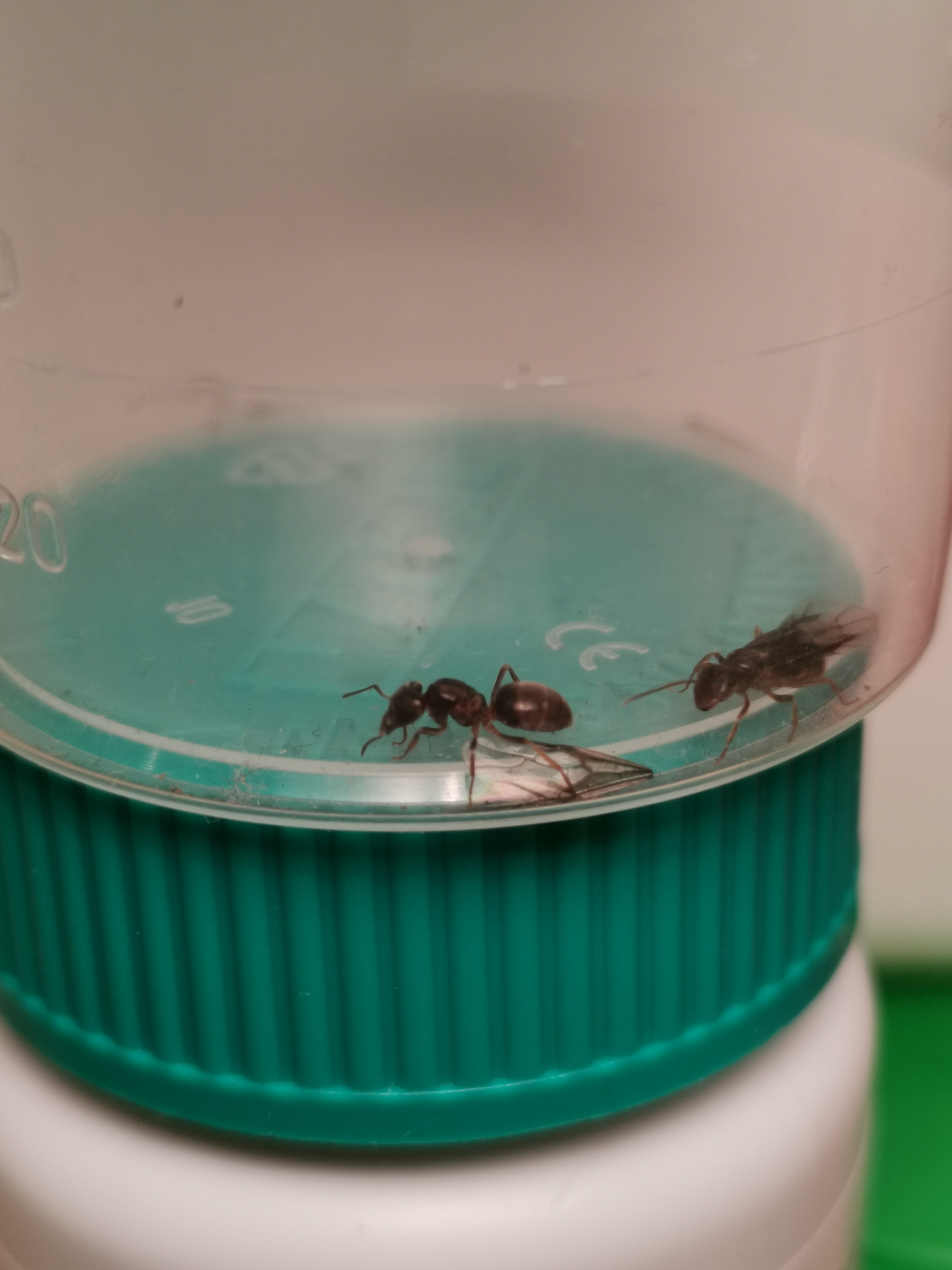 Gyne einer sozialparasitären Art für die Gründung einer eigenen Kolonie in ein fremdes Nest einer nahverwanten Ameisenart ein, tötet die Gyne , nimmt ihren Platz ein und lässt ihre eigene Brut von den übernnommenen Arbeiterinnen aufziehen. So wäre es - für die Gyne , die mir gesternbend ins Fenster flog, im besten Fall - unter natürlichen Umständen passiert. Da die Gute aber bei mir gelandet ist (eventuell, weil meine L. cf niger Kolonien aus dem offenen Fenster hinausgeduftet haben) möchte ich versuchen, die natürlichen Voraussetzungen zur Gründung risikoarm nachzustellen. Ich versuchhe die nötigen Faktoren zu generieren und dabei die (in der Natur) zwangsläufigen Faktoren zu überspringen.