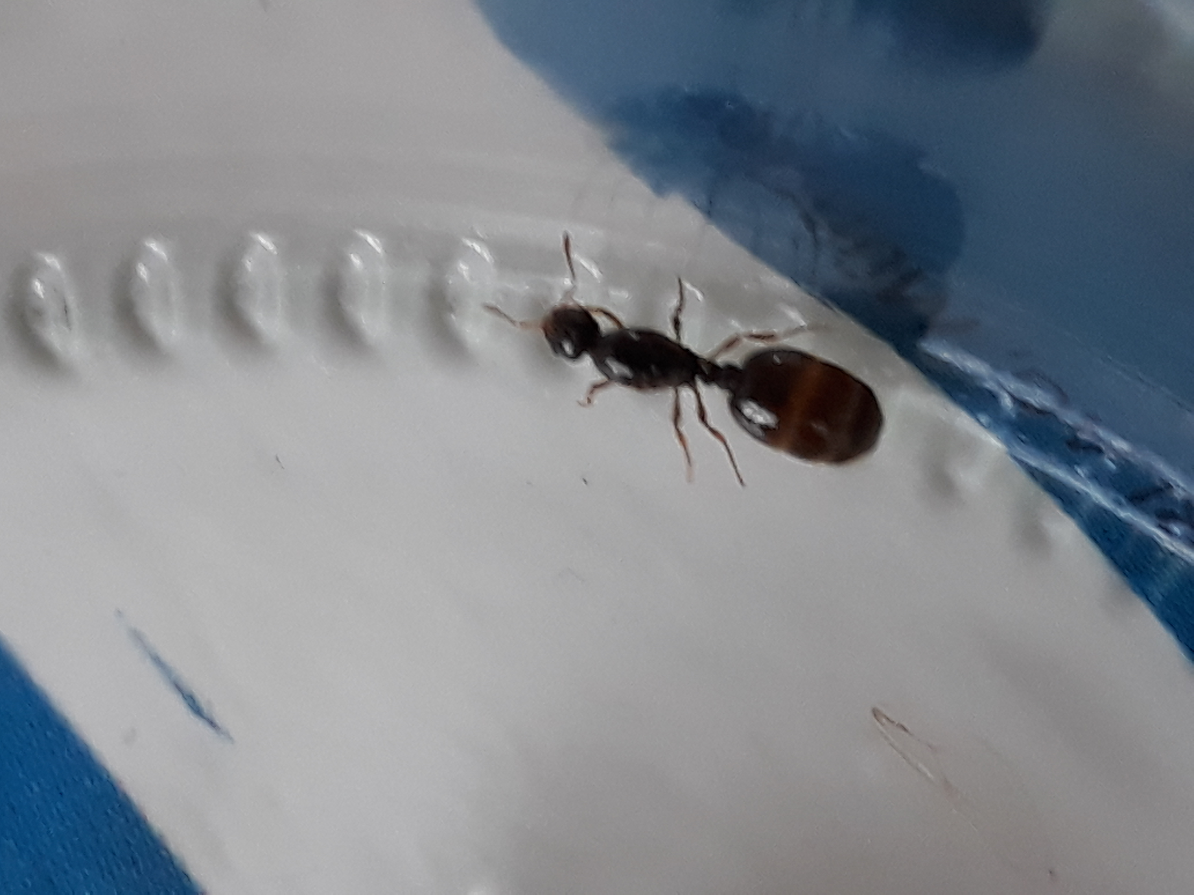 Ich würde mich jetzt nicht festlegen an einem Foto von oben, meine aber eher das es eine Knotenameise ist. Aber eventuell hilft dir das beim bestimmen/ausschließen weiter. Ansonsten würden noch weitere Fotos von der Seite helfen.