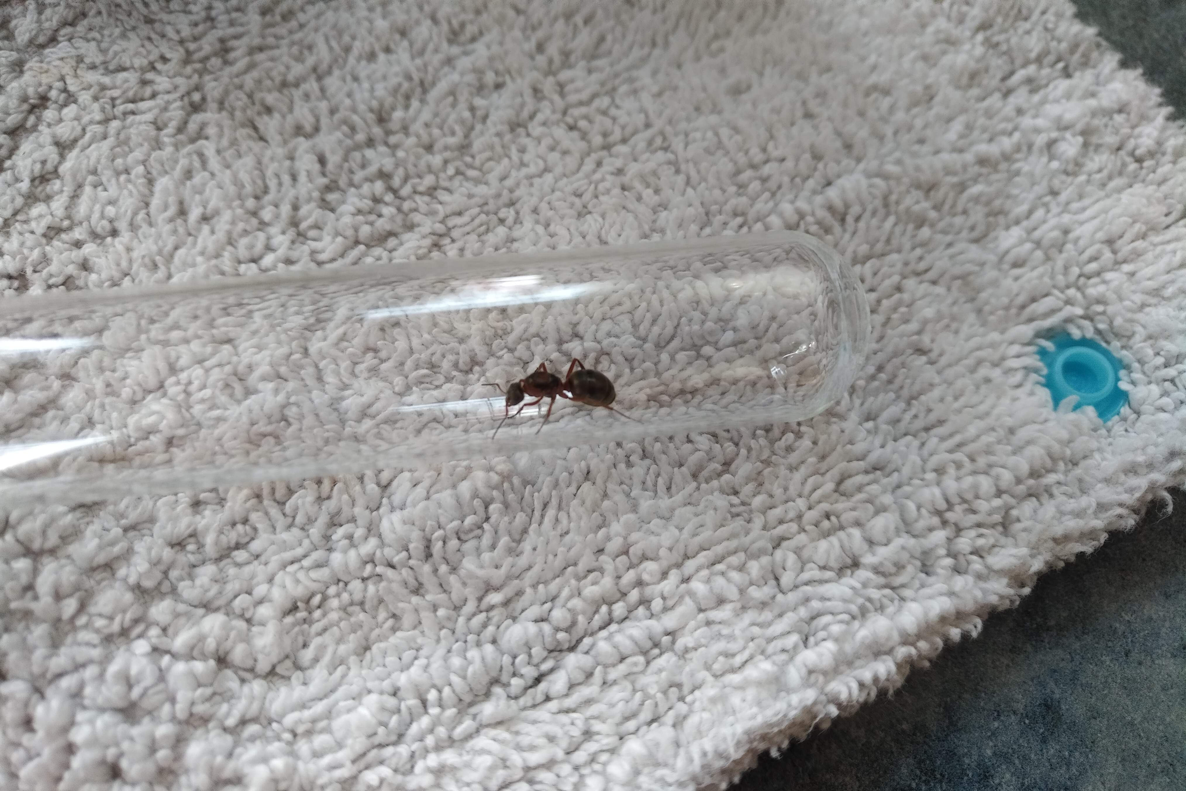 Dann fand ich noch eine zweiteGyne . Meine Vermutung ist Camponotus ligniperda, allerdings scheint sie mir dafür etwas klein. (das Reagenzglas auf den Fotos hat 16 mm Durchmesser)