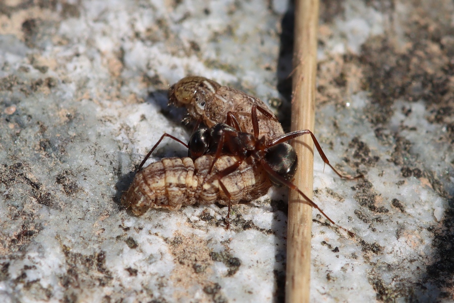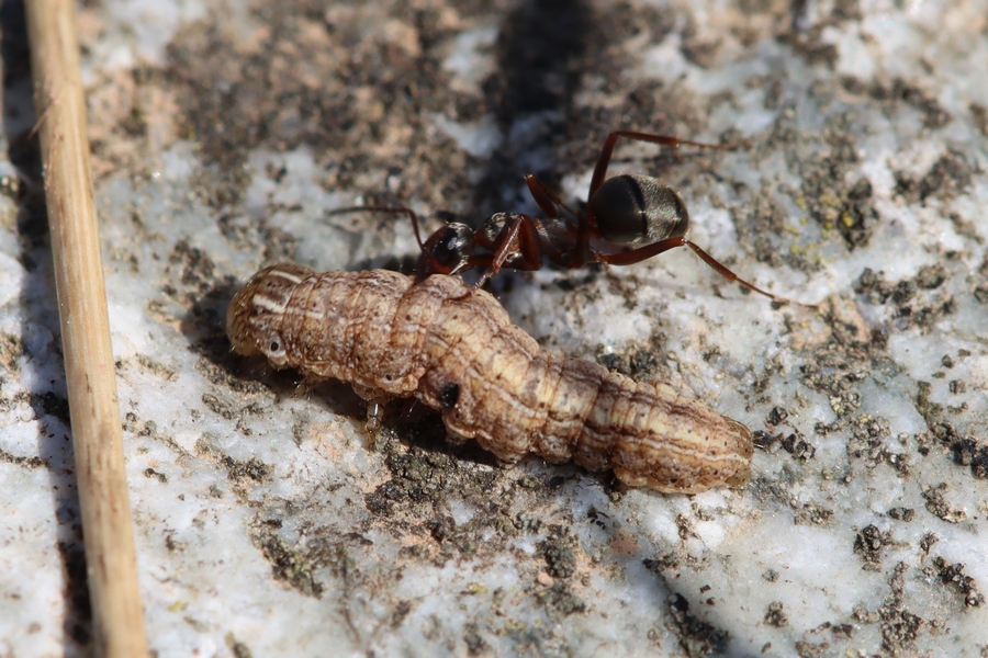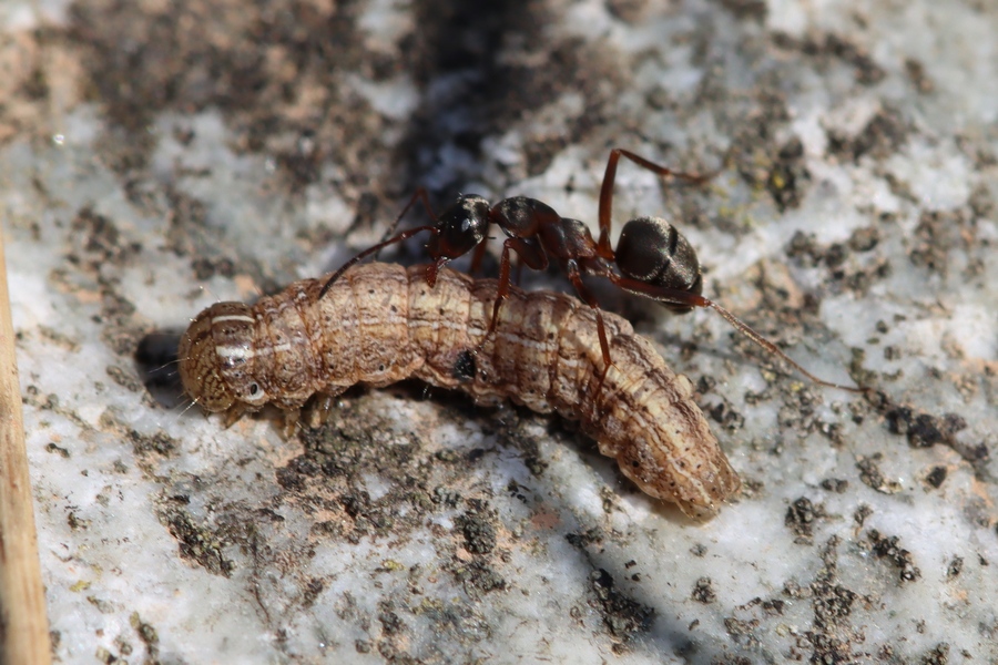 heute fand ich auf einer Trockenwiese bei Staufen im Breisgau (D, BW) diese Ameise mit Beute (Noctuidae, Mythimna sp.). Die GröĂe der Ameise lag bei geschĂ€tzten 8 mm. Ist sie bestimmbar?
