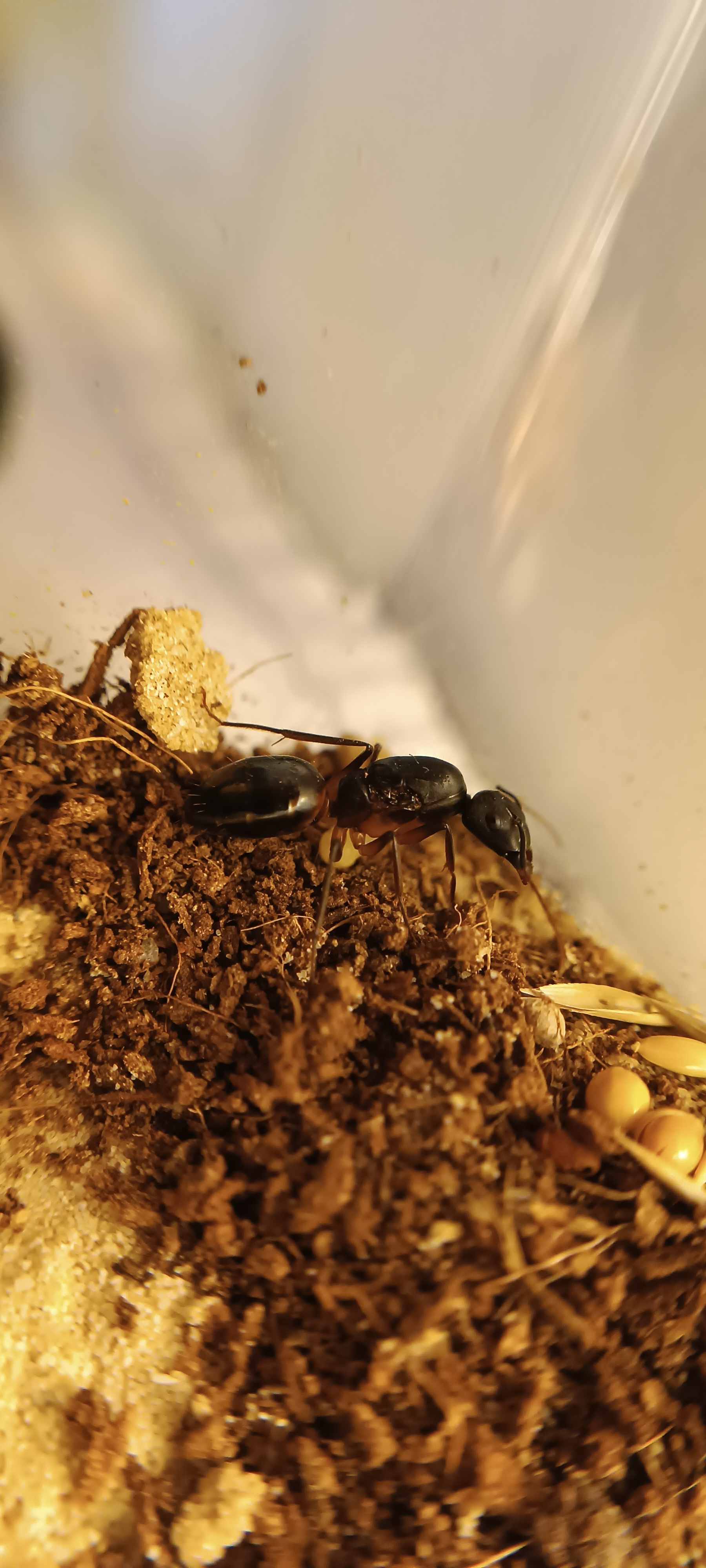 UND eine Art, welche ich nicht zuordnen konnte, von der vermutlich die Königin stammt. Ich habe leider keine Bilder der Arbeiterinnen, sie waren wie die Königin gefärbt, nur etwas gelblicher an den Enden der Beine. Es gab Arbeiterinnen von ca. 6mm bis zu 1,6mm.