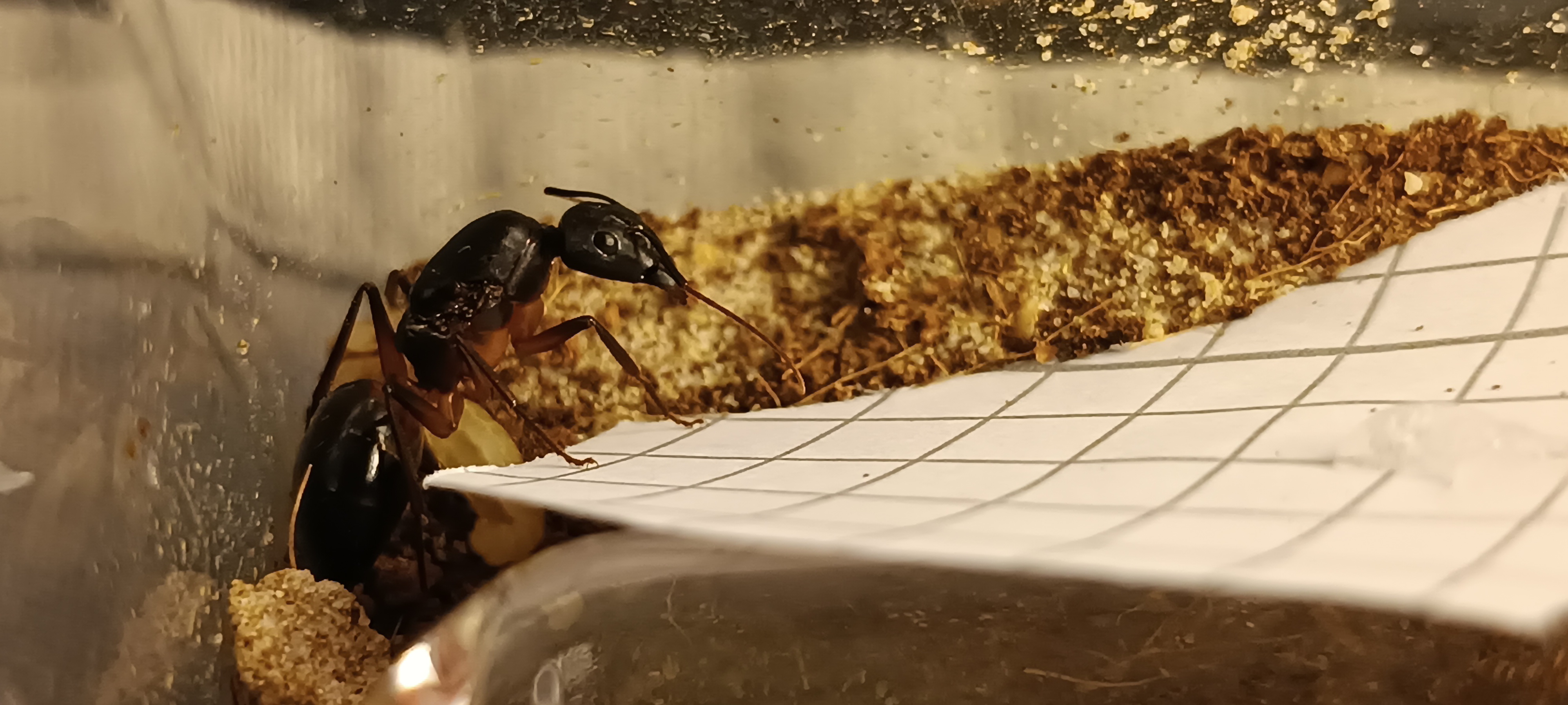 Bis jetzt habe ich ihr allerlei Futter zur Verfügung gestellt und sie bei geringer Luftfeuchte mit einer Temperatur von 27°C gehalten. Es sind noch keine Ameisen geschlüpft, sie hat jedoch