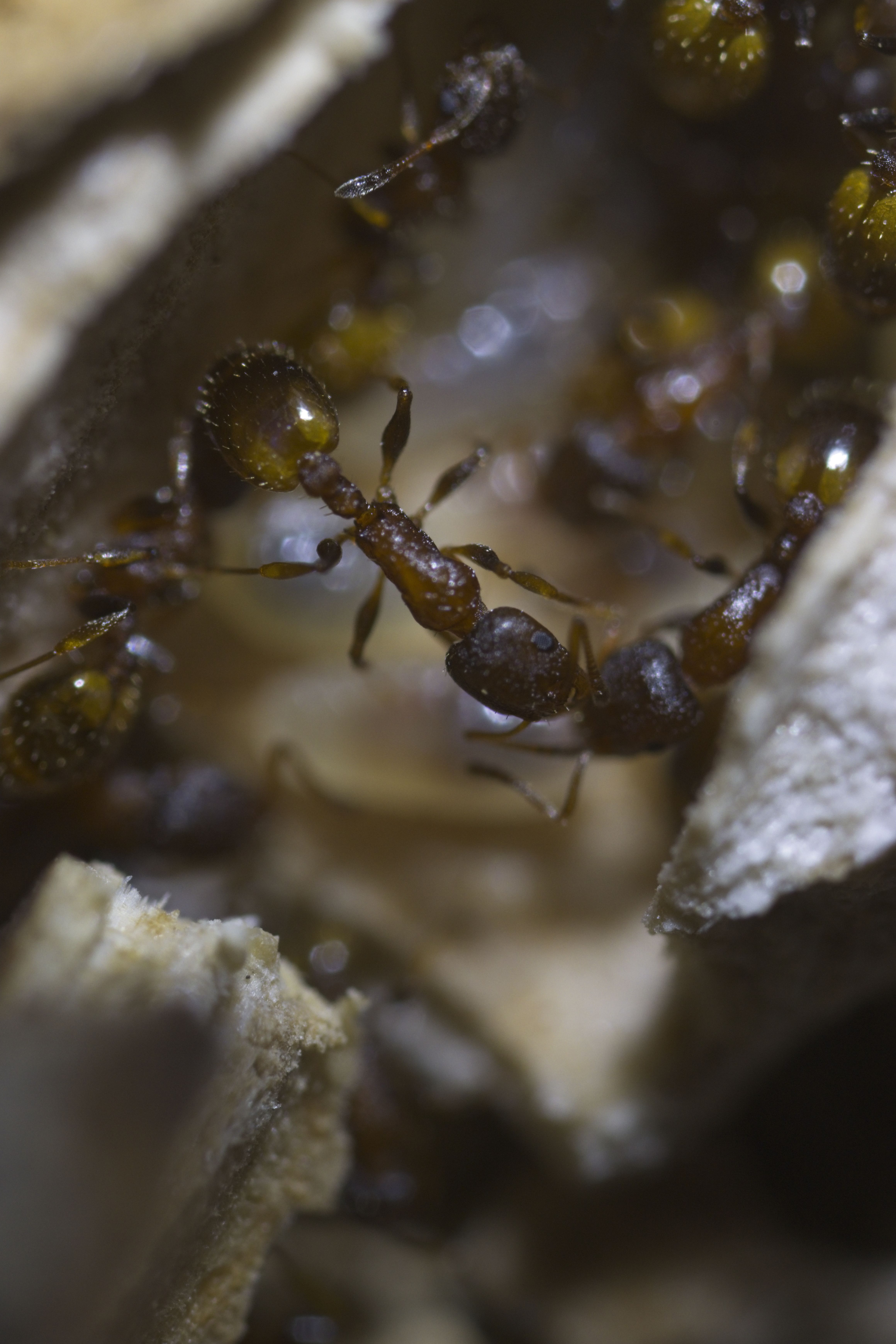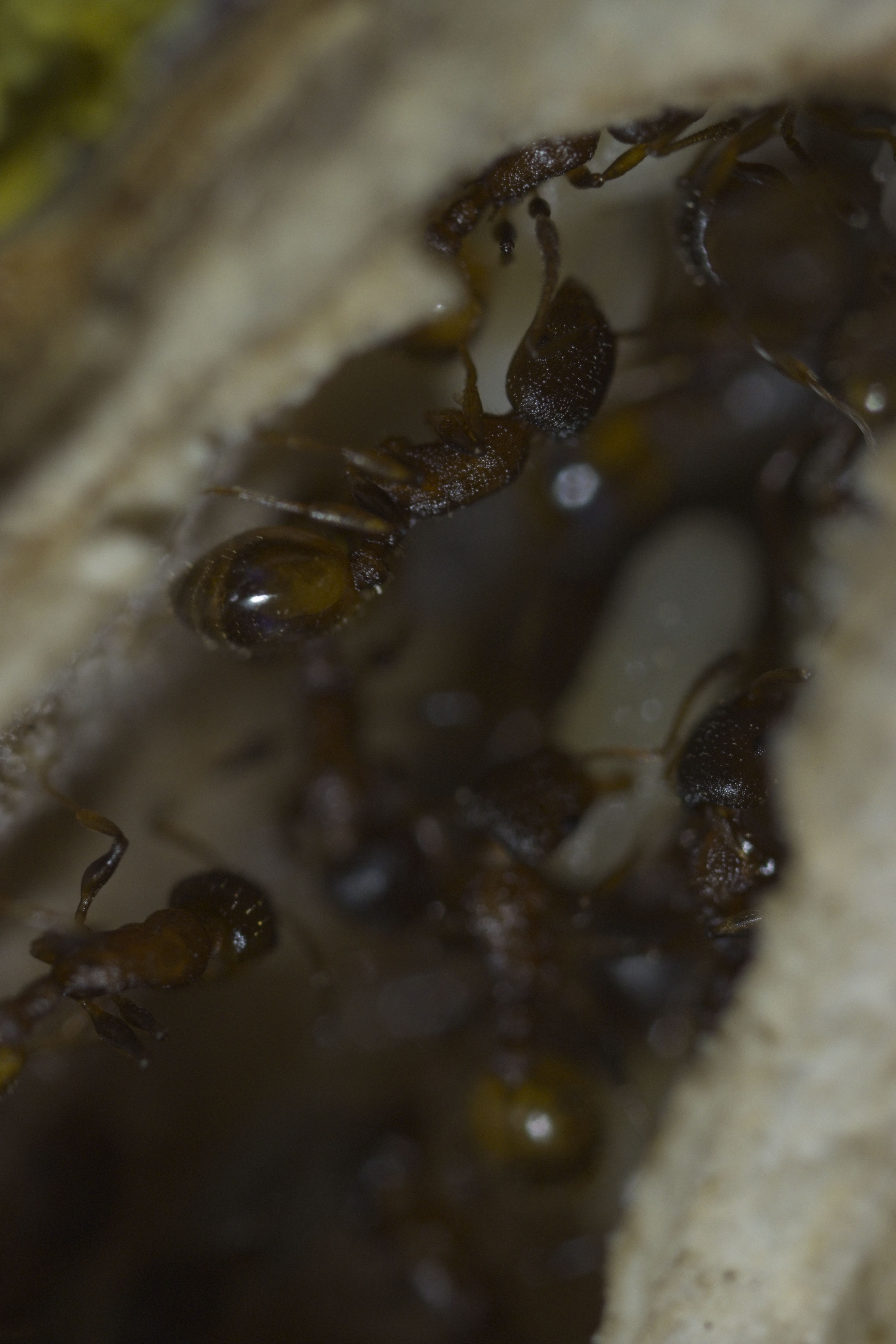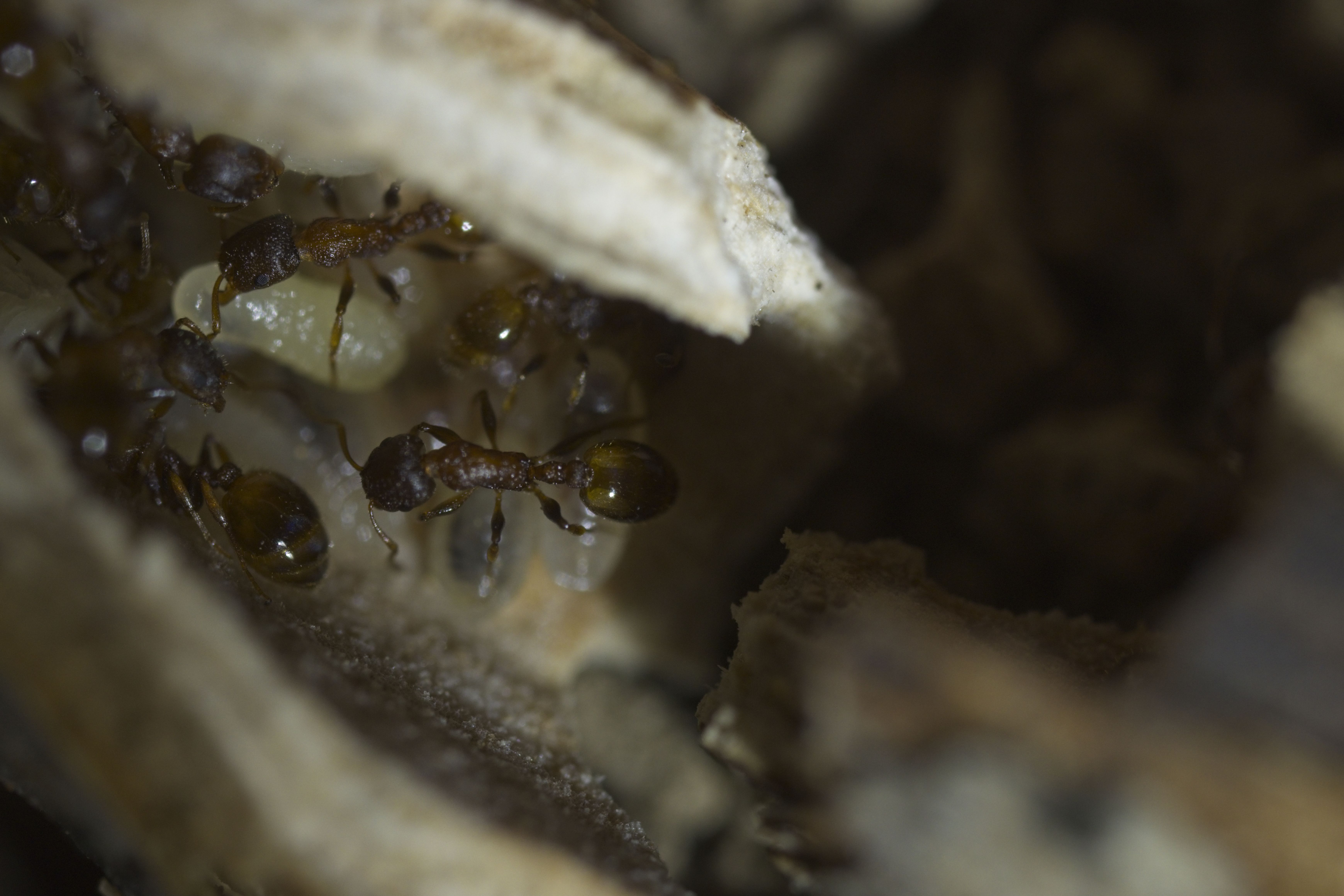 Er kam mit einem kleinen, alten, zerbrochenen Ast zu mir und meinte, da würden winzige rote Ameisen rein und raus gehen. Tatsächlich waren am einen Ende ganz viele kleine Ameisen zu sehen und sogar Eier. Ich hab den Ast in einen Behälter gelegt und eine Weile beobachtet, als ich zu meinem erstaunen sah wie eine Arbeiterin plötzlich eine wesentlich längere, dunklere Ameise in ihren Kiefern von einem Ast, in den anderen transportiert hatte. Kurz im netzt nachgeschaut wie die