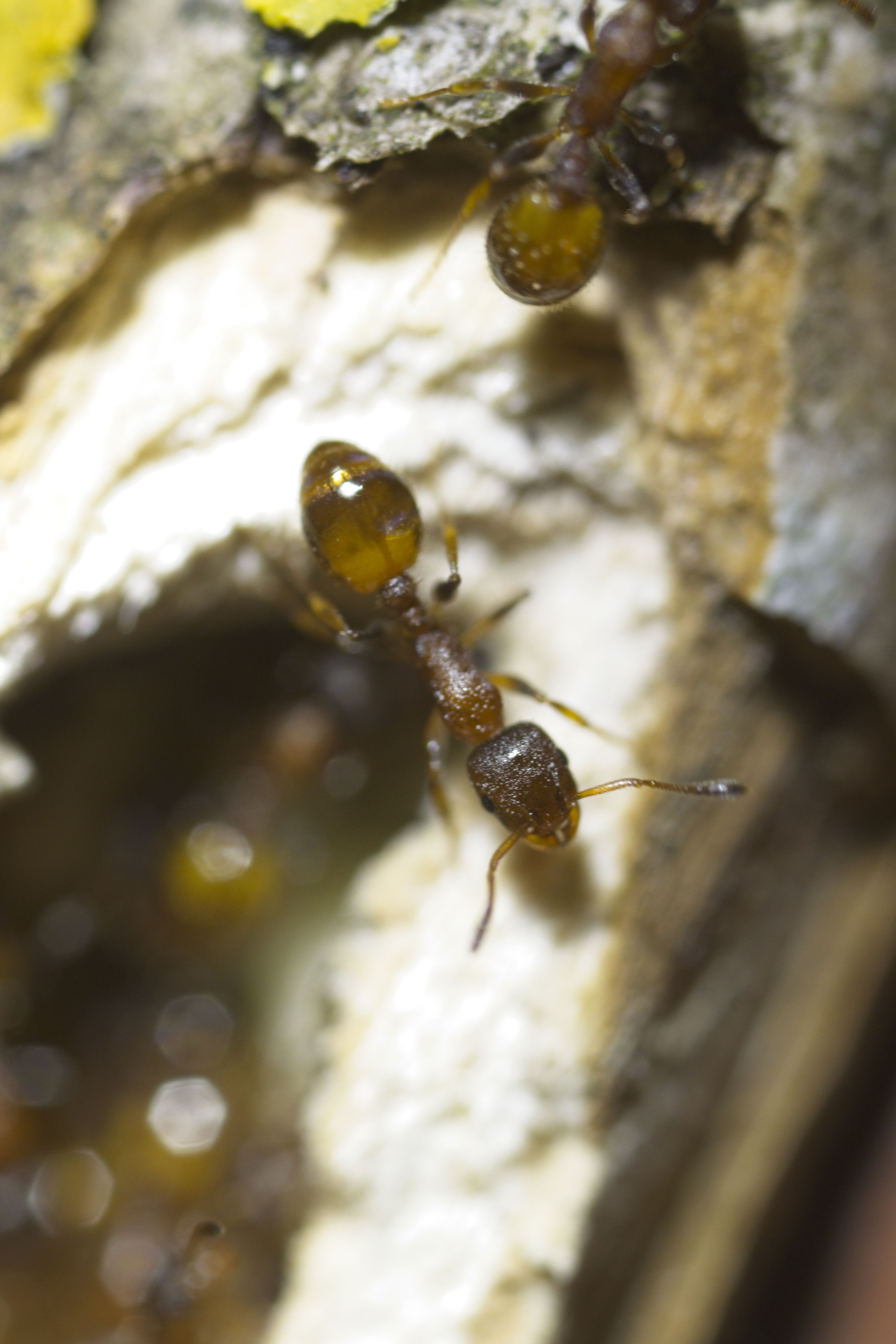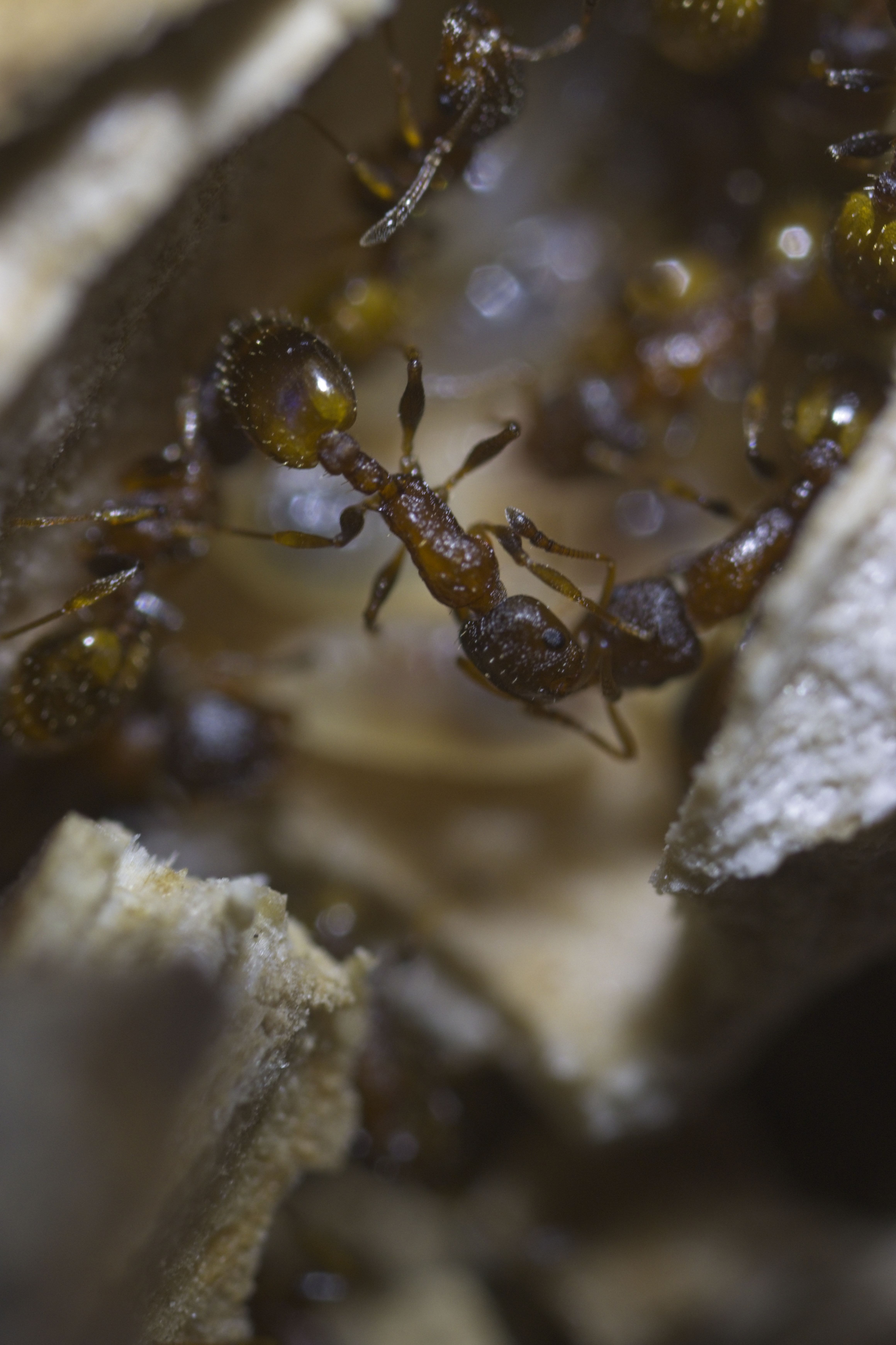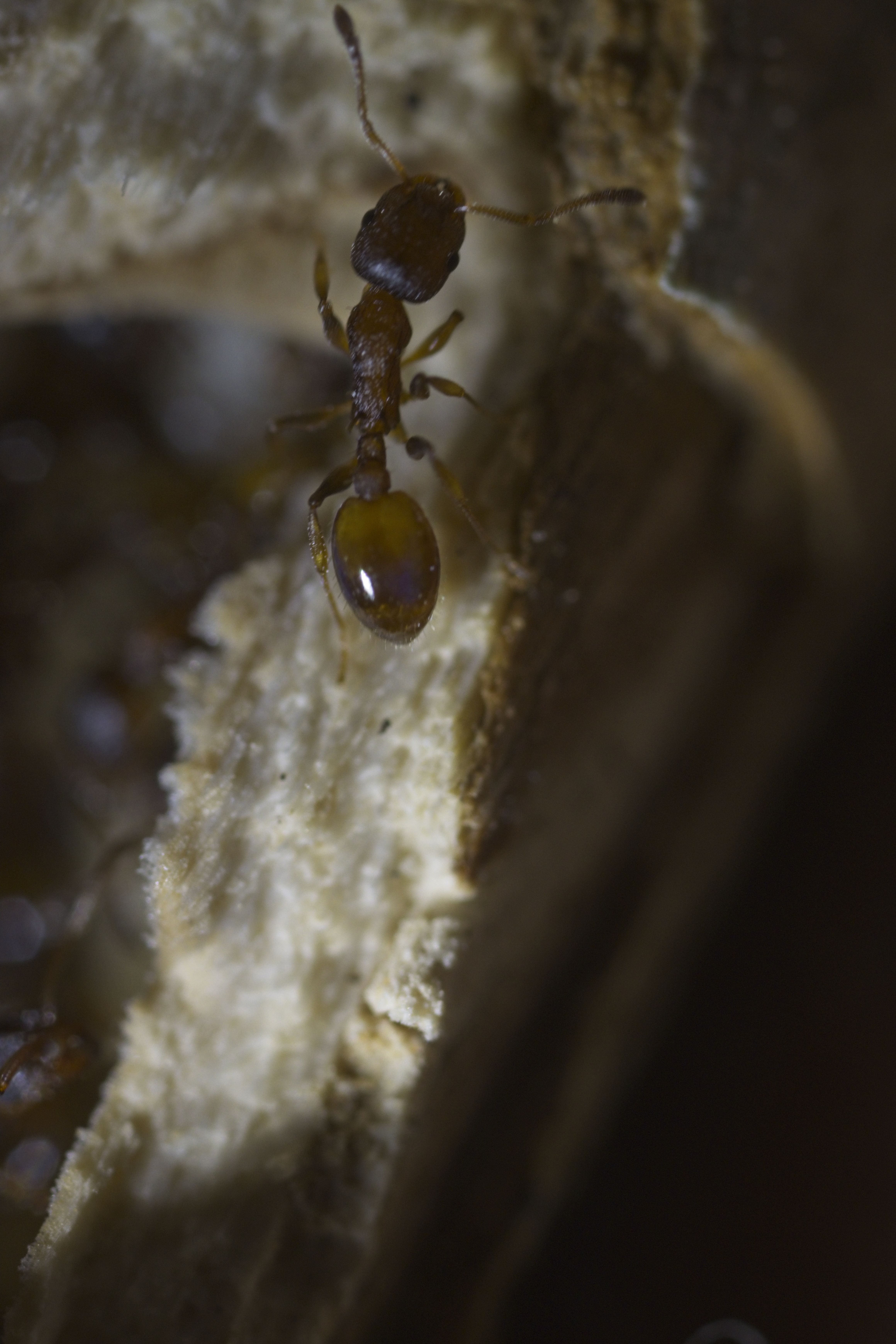 Er kam mit einem kleinen, alten, zerbrochenen Ast zu mir und meinte, da würden winzige rote Ameisen rein und raus gehen. Tatsächlich waren am einen Ende ganz viele kleine Ameisen zu sehen und sogar Eier. Ich hab den Ast in einen Behälter gelegt und eine Weile beobachtet, als ich zu meinem erstaunen sah wie eine Arbeiterin plötzlich eine wesentlich längere, dunklere Ameise in ihren Kiefern von einem Ast, in den anderen transportiert hatte. Kurz im netzt nachgeschaut wie die