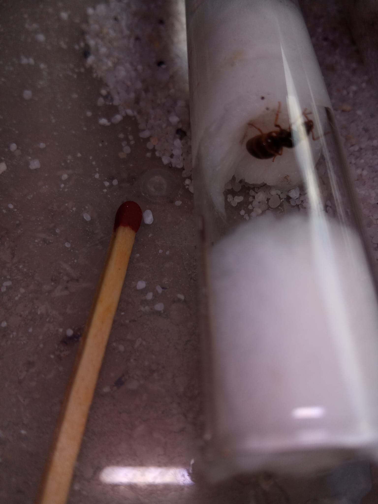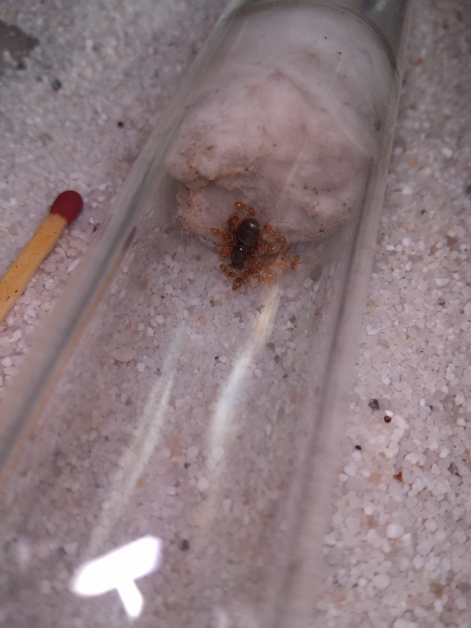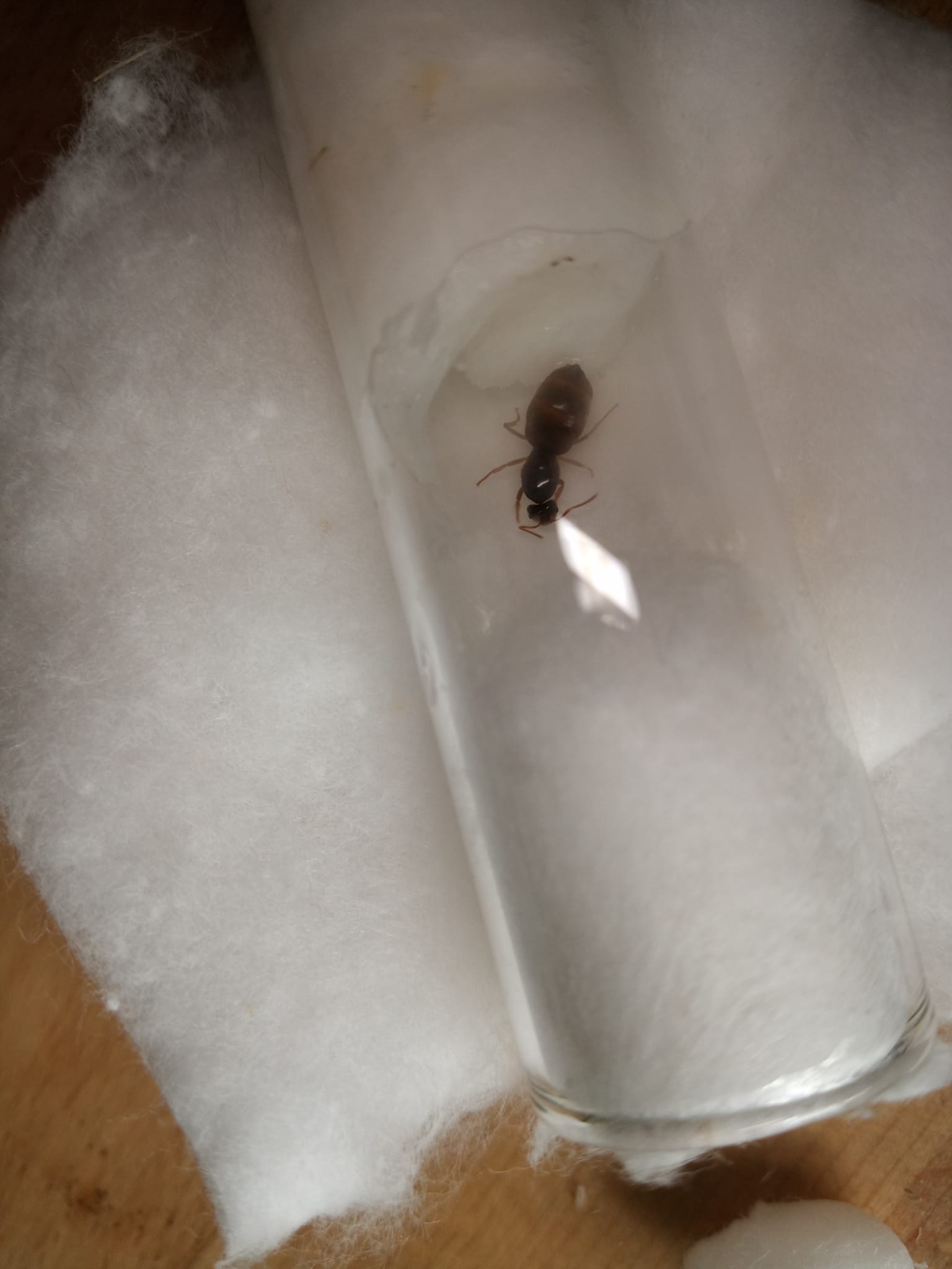 Hey Tara, das ist Cautolasius sp., also flavus oder myops. Ich meine, erkennen zu können, dass die hintere Kopfhälfte durchgehend dunkel ist; tendenziell sollte es sich also eher um flavus handeln. Ein bisschen Größenvariation ist normal; ein knapper cm passt zur Art. Wie viel kleiner ist denn deine flavus-Gyne?