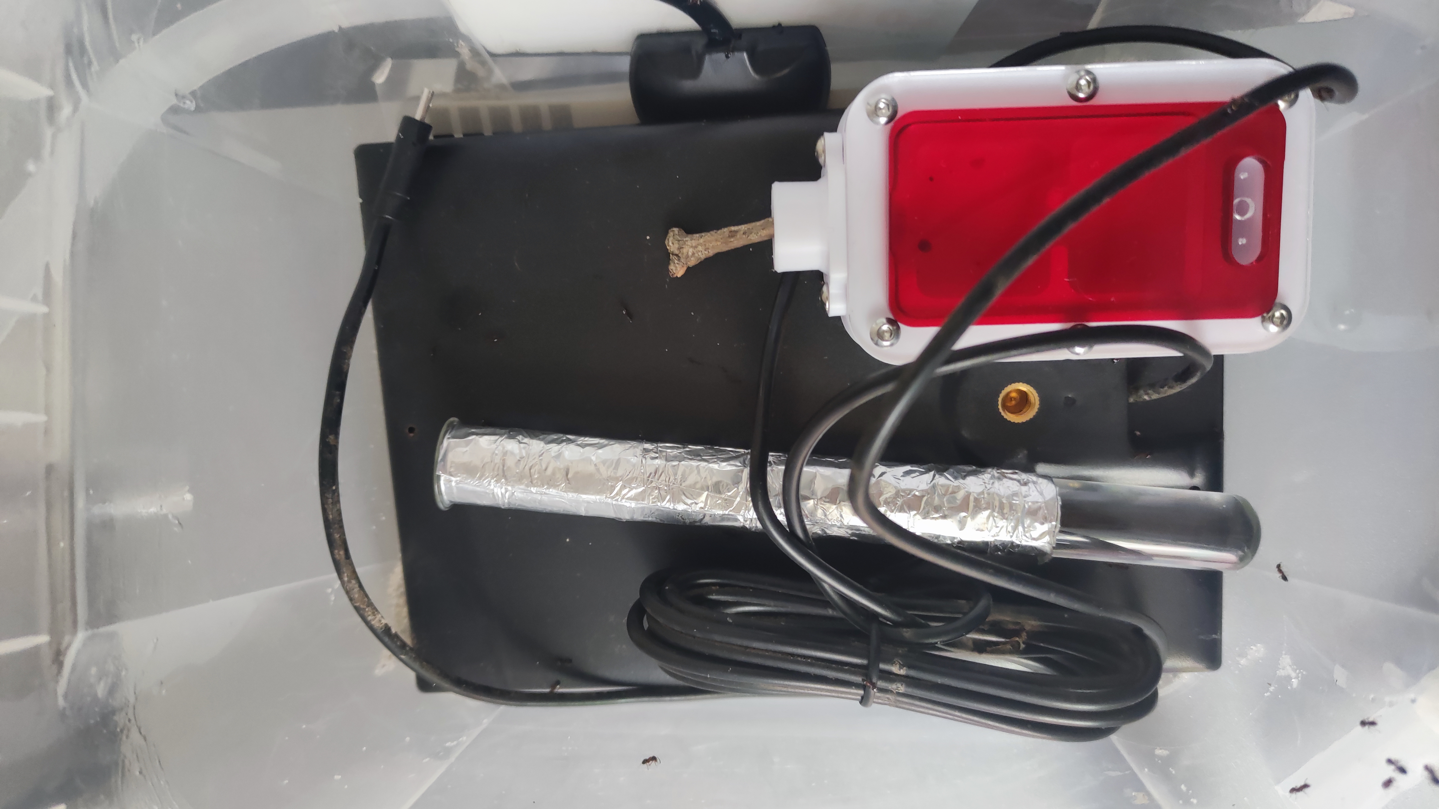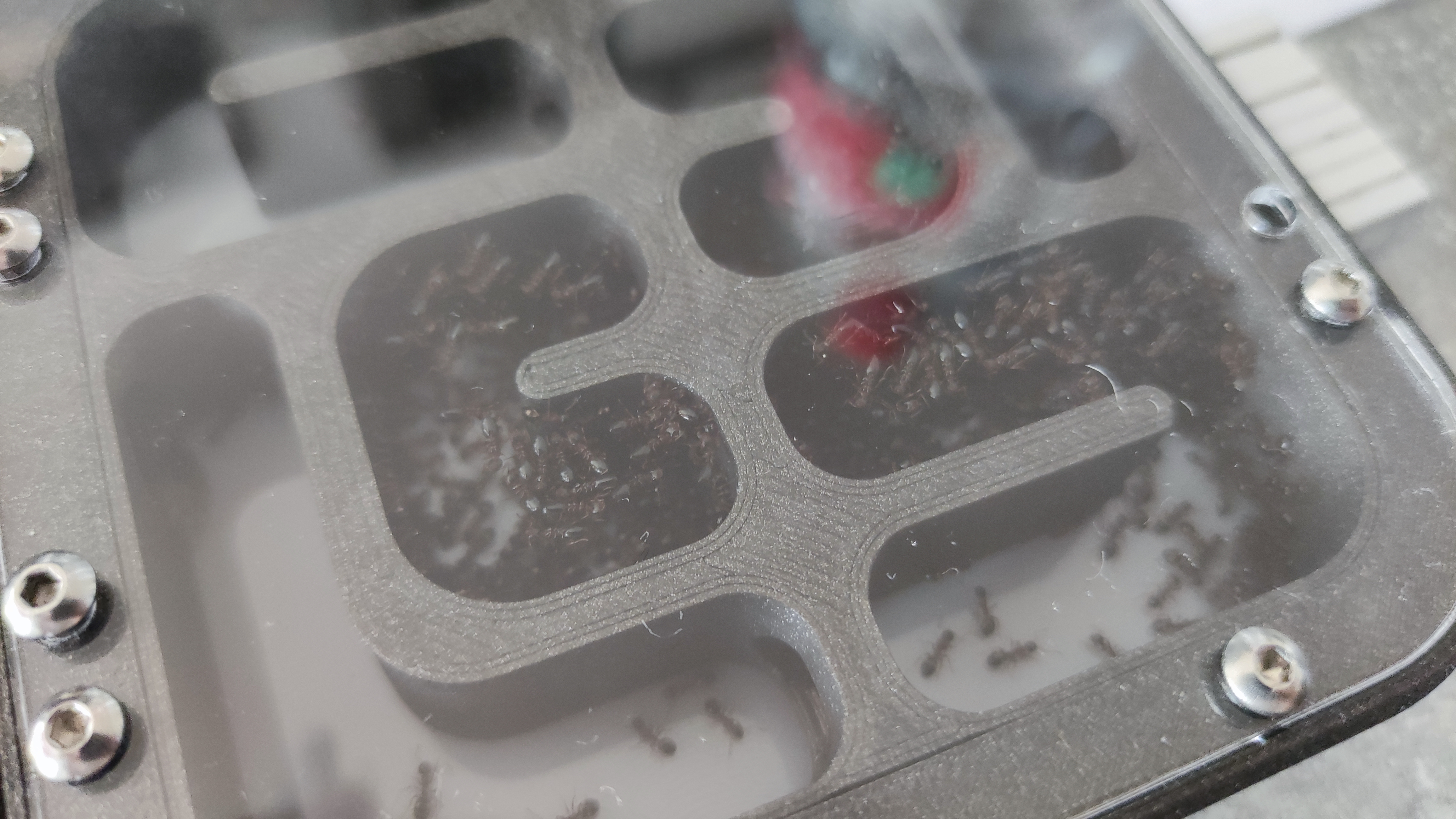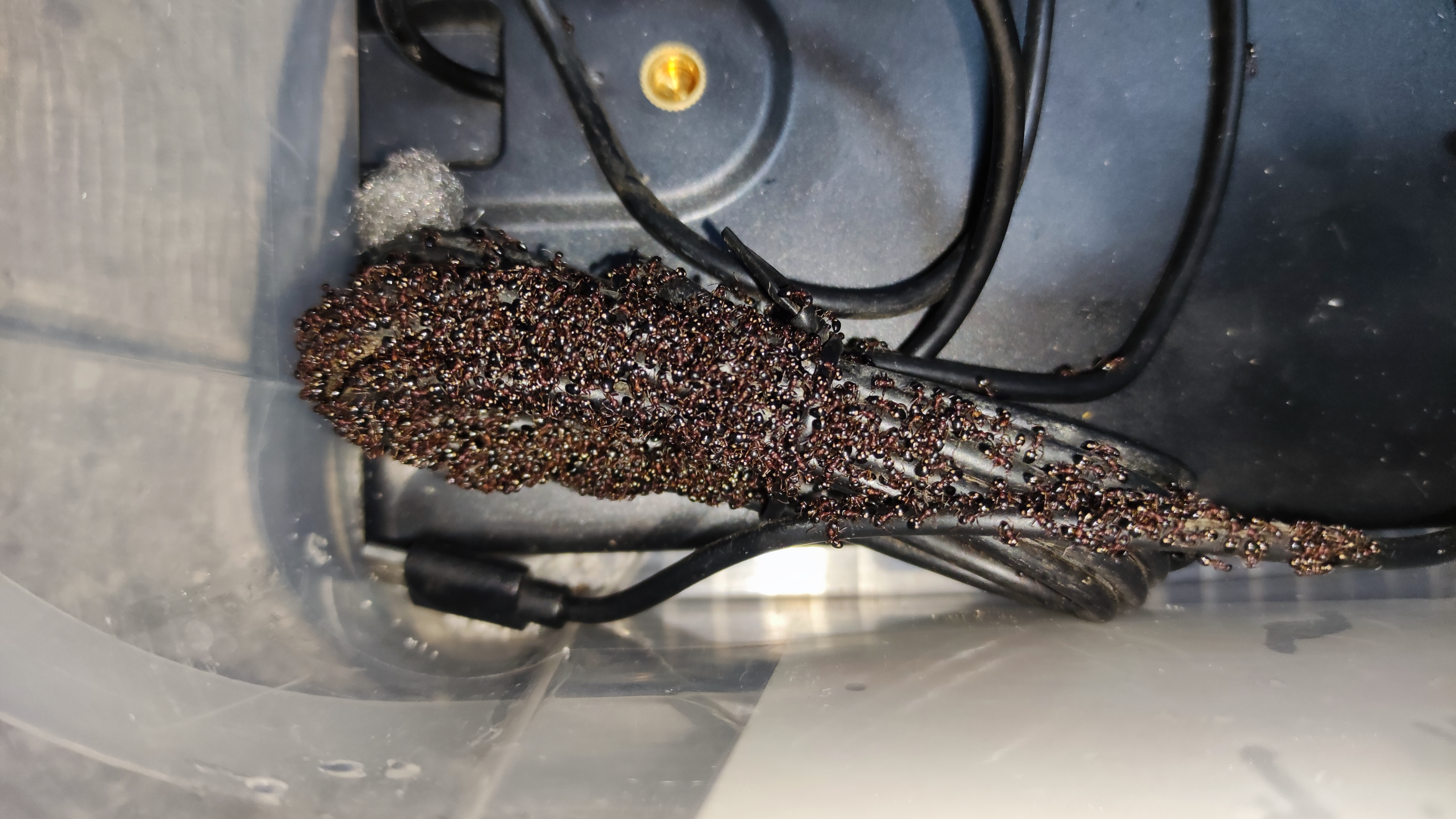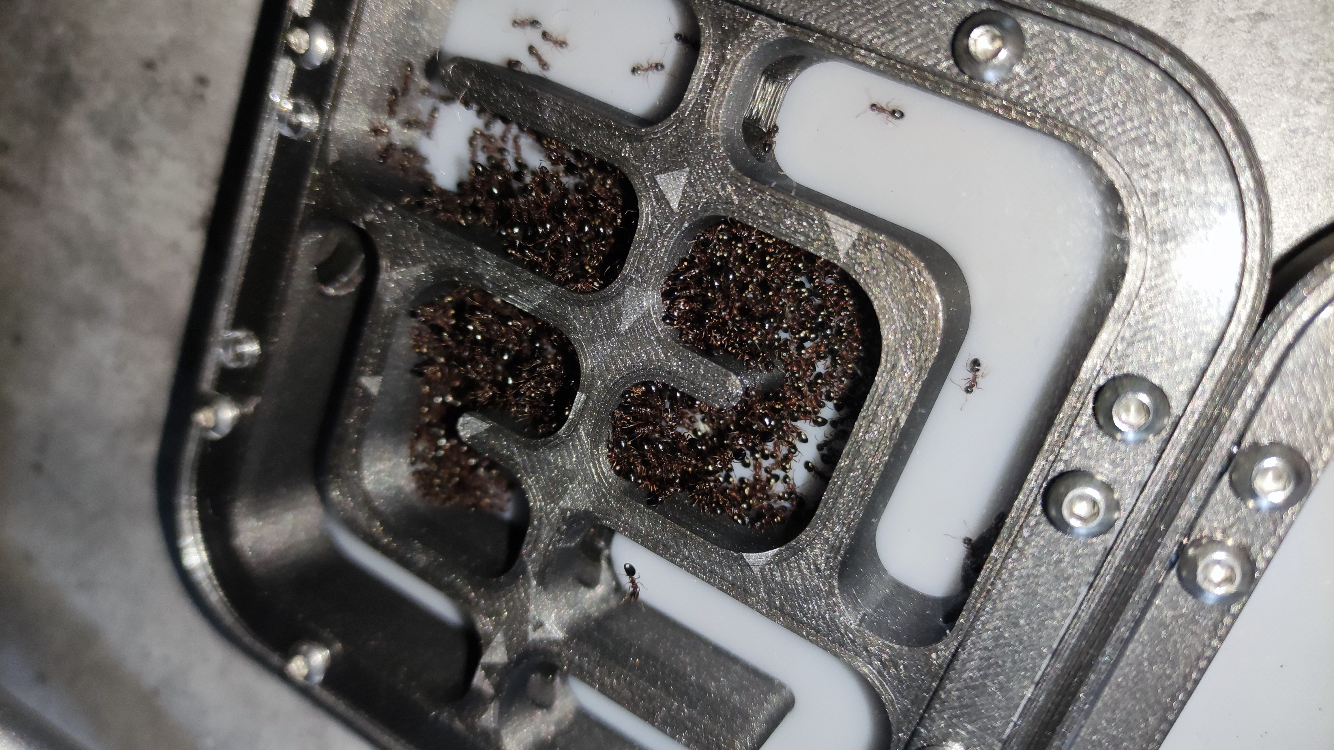 ich habe bei mir auf Arbeit eine Ăberwachungskamera wegen einem defek austauschen mĂŒssen. Diese haben zur Stromversorgung ein solar Panel. Das alte abgebaute Panel Lage dann noch bei mir im BĂŒro zum Einlagern als Ersatz. Nun bemerkte ich, dass in diesem Solarpanel Ameisen drin sind, weil ab und zu einer ĂŒber mein Tisch lief. Da ich Ameisen mag wollte ich sie ohne Chemie dort raus haben. Dann habe ich versucht sie durch etwas Hitze sie zum Umzug zu zwingen. Das ganze hat dann 3 AnlĂ€ufe / Tage gebraucht das es geklappt hat. Das sah wie folgt aus. Geklappt hat es am dritten Tag als ich den Aufbau nach meinem Beobachtung etwas verfeinert habe und ein Wakooshi Nest extern angebracht habe. Zu meiner Ăberraschung waren es aber nicht wie gedacht nur ein paar verirrte Arbeiter sondern plötzlich ein ganzes Volk.