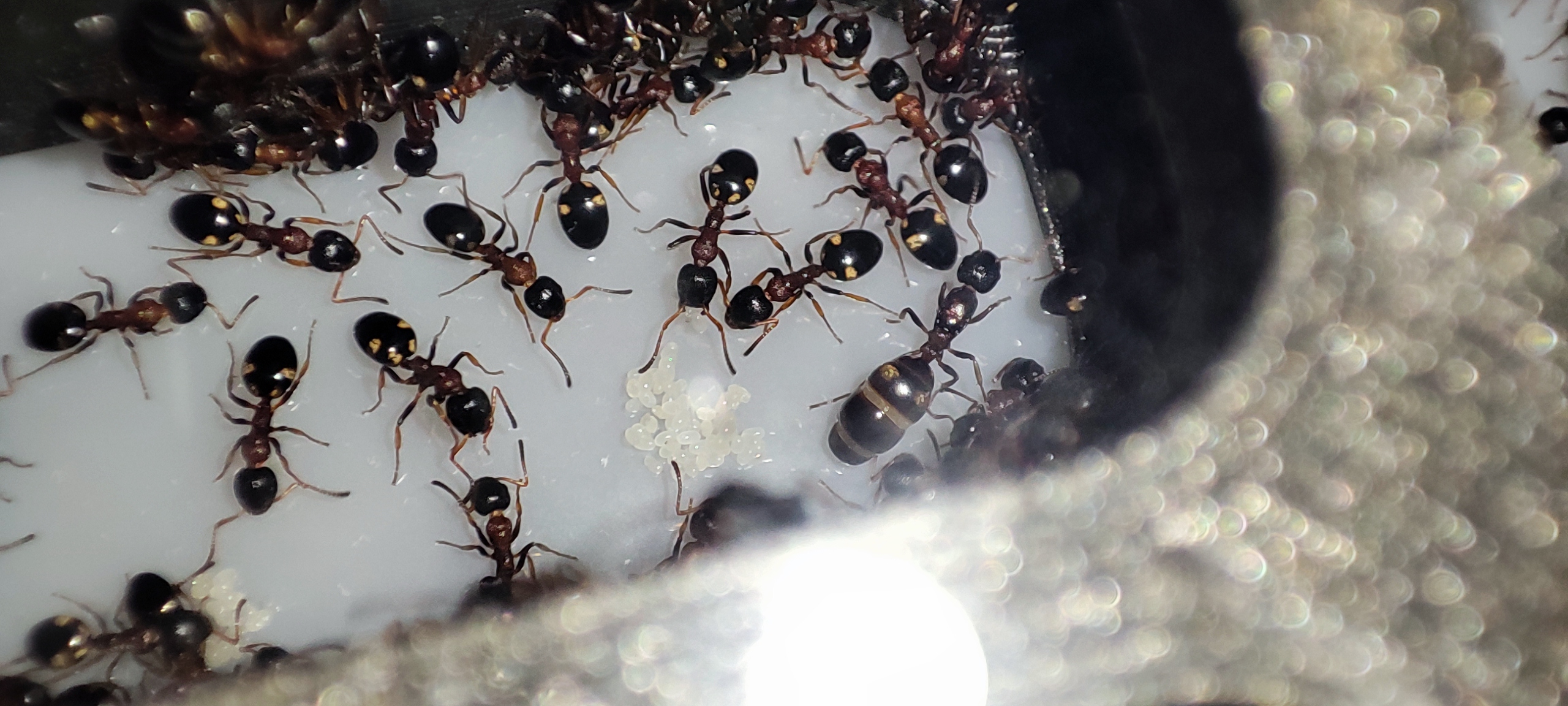 Hier jetzt zum Hauptteil, nach einer Woche zur Erholung fĂŒr das Volk, habe ich vor Aussetzung (sollte heute passieren) gedacht ich schau nochmal rein ob was passiert ist. Und mein groĂer Sohn sagte dann: da sind doch Eier. Und ich so: ne kann nicht sein das waren alles nur Arbeiter. Und bei genaueren suchen sahen wir eine Königin bzw eine Ameise die etwas gröĂer war und Eier.