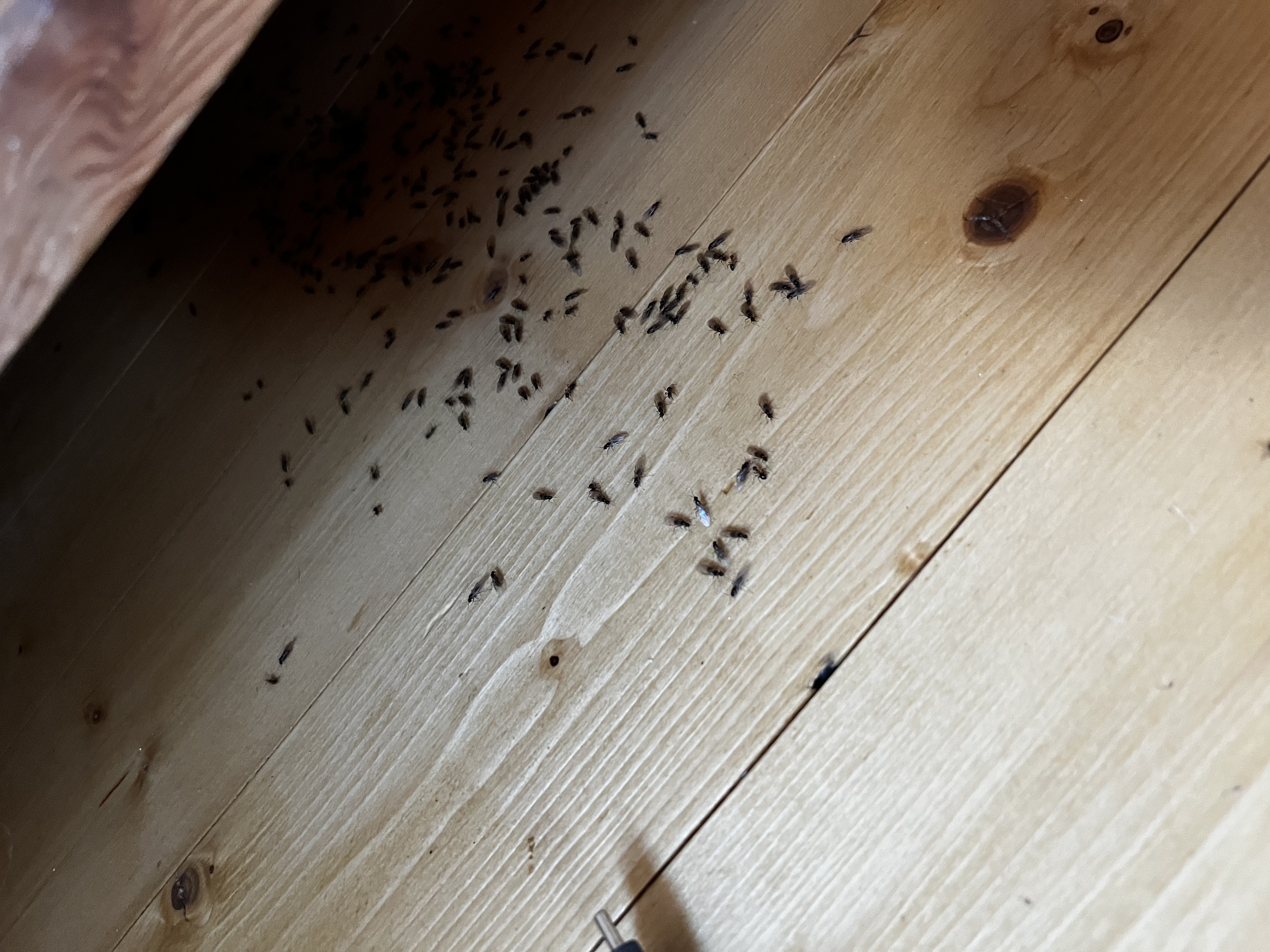 Der Fund ist im Dachgeschoss. Wir haben ein Holzhaus. Die Ameisen verschwinden in Nischen um das Fenster und dort, wo die Heizungsleitung in die Wand geht. Es sind sehr viele Ameisen mit Flügeln, dabei ziemlich große und auch viele kleinere und wenige, ziemlich kleine ohne Flügel.