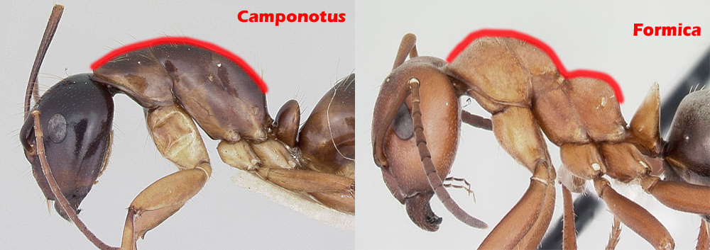 Camponotus ist noch mehr daneben, die erkennt man gut am sehr geschmeidig zusammengesetzten Mittelleib, da sind die Segmente nicht so eindeutig durch Furchen und Dellen voneinander abgetrennt wie bei Formica. NatĂĽrlich kann man sie viel leichter am Kopf erkennen und durch ihre Majore. Wer mal eine Seitenansicht einer Camponotus und Formica nebeneinander anschaut, sieht sofort den eindeutig unterscheidbaren Mittelleib, neben anderen Dingen.