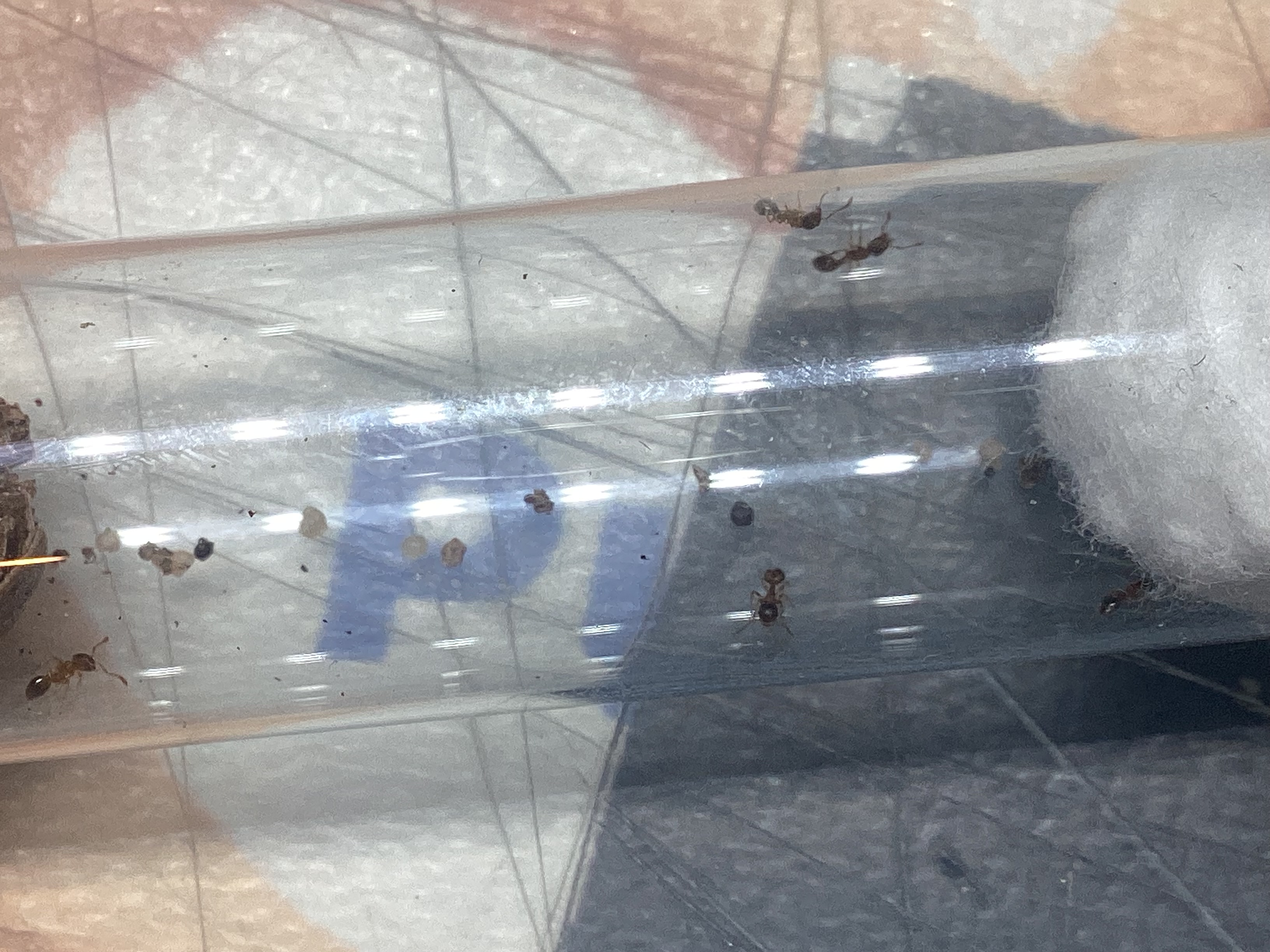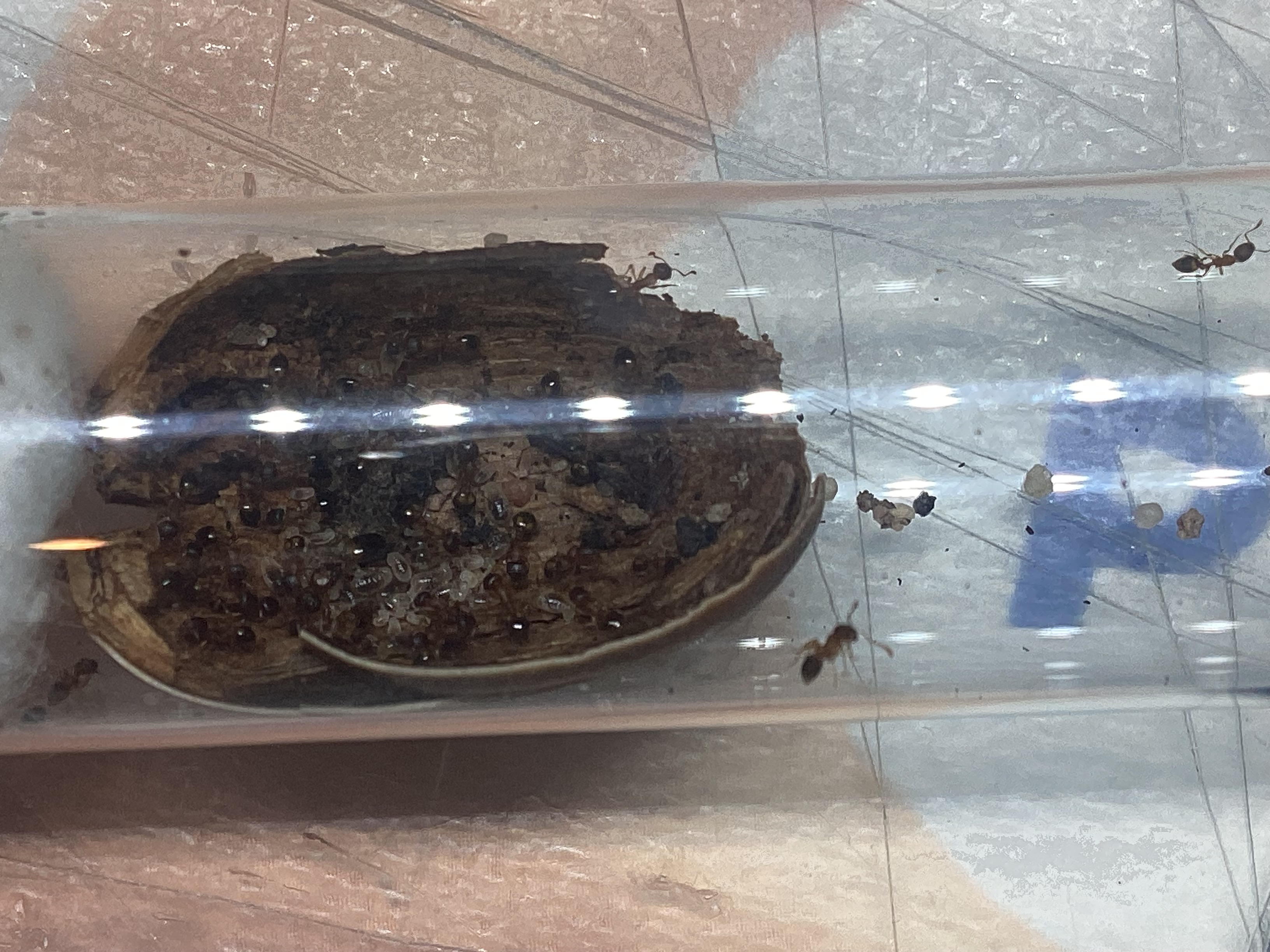 Da aber klar eineKönigin und gut Brut in Form von Larven vorhanden sind, müsste es der Kolonie gut gehen wenn du sie ab und zu mit Kohlenhydraten und Proteinen fütterst. Je nachdem, wo du deine Ameisen gefunden hast, würde ich auch die Haltungsbedingungen anpassen. Beispiel: Wenn sie in einer feuchten Ecke einer Hecke waren, würde ich noch etwas Moos zum halten der Feuchtigkeit in ihr Becken tuen. Sie wählen ja den Ort der ihnen am meisten passt, deswegen sollte es ihnen auch passen wenn du diesen Ort rekonstruierst.