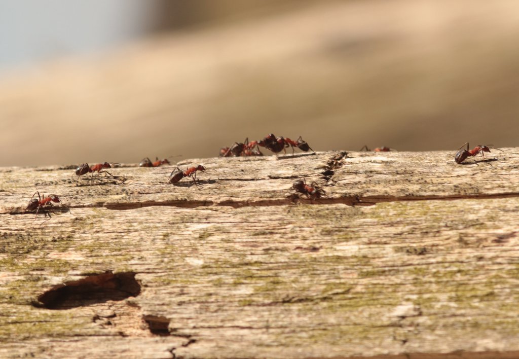 Hallo, ich habe am 12.04.2025 eine Ameisenstraße entdeckt, und einige Bilder gemacht. Die Ameisen bewegten sich vom Erdboden auf einem Pfahl/Pfosten der Aussichtsplatform ins DachgebĂ€lk.
