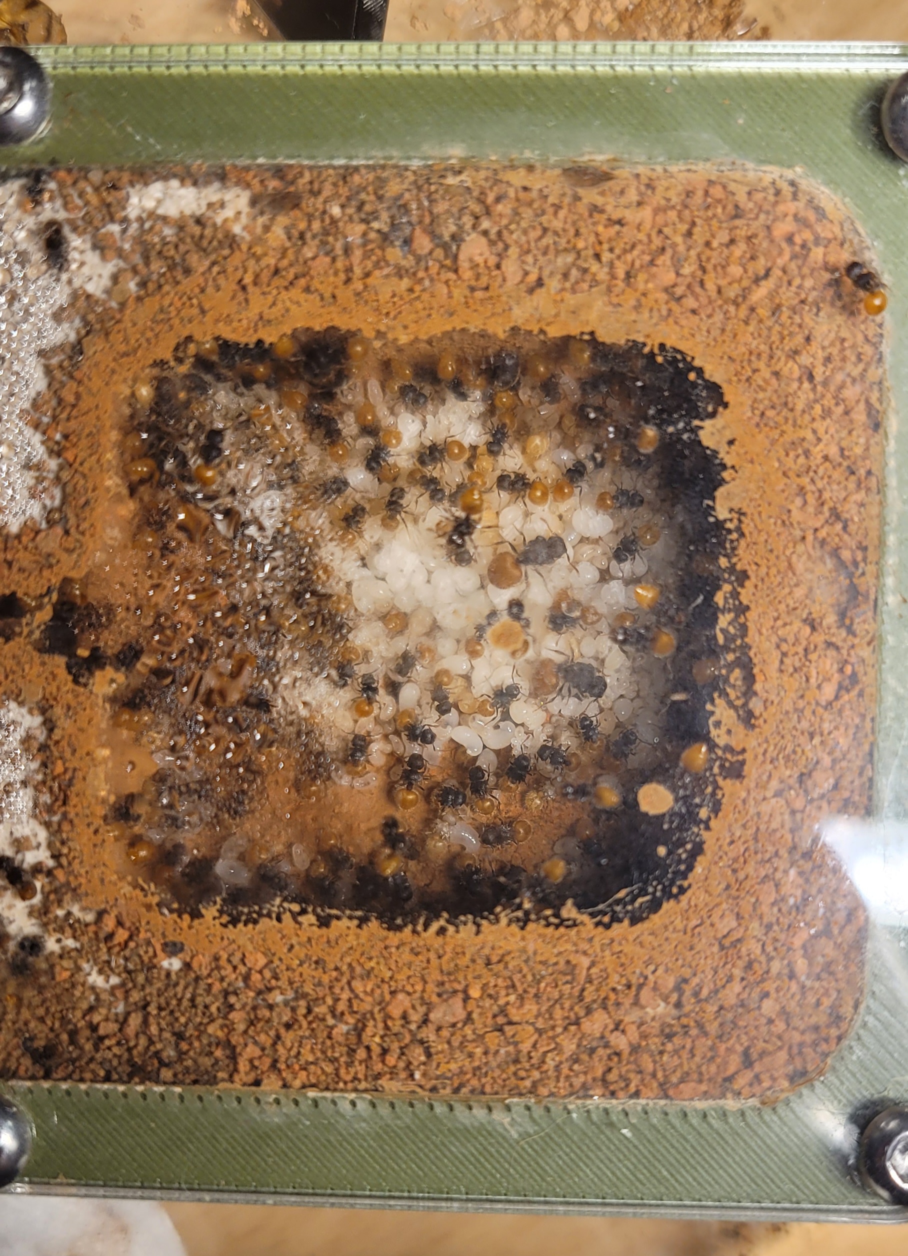 Nach einigem Herumexperimentieren gelang es mir dann auch die Kolonie zur Aufzucht von einigen Jungköniginnen und zahlreichen Männchen zu bewegen, und diese anschließend auch zur Paarung zu bringen. Anbei ein Video der Paarungen im Nest: