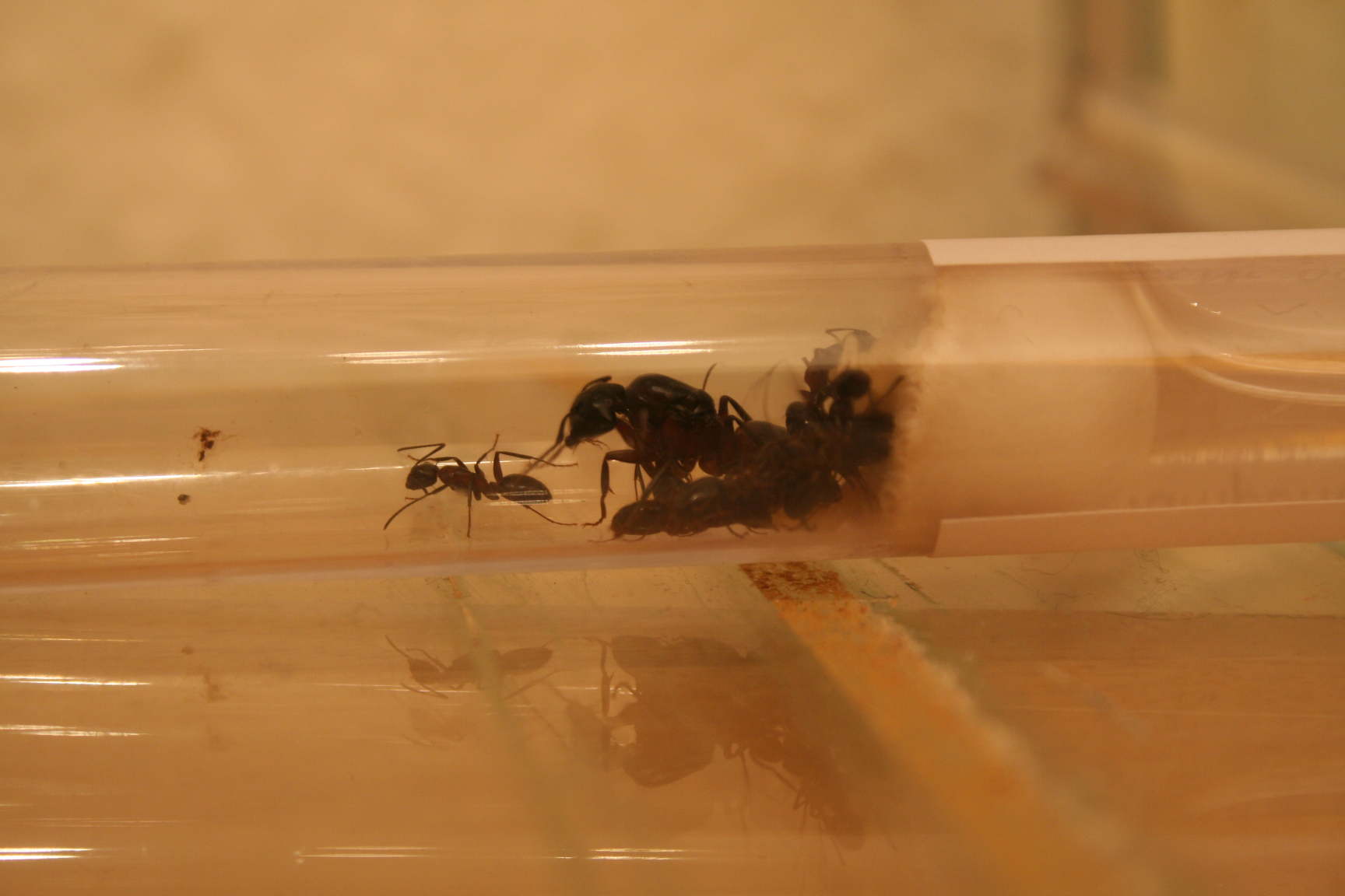 Die entlaufene Ameise fing ich mit einem leeren NASA-Antquarium ein, in dem bis vor einigen Tagen noch ein paar Lasius niger waren. Die restlichen Ameisen waren ja noch in dem Reagenzglas, so dass ich einfach nur den Stöpsel wieder drauf machen musste. Ich entfernte wieder alle BodenbelĂ€ge. Als ich den Deckel abnahm sah ich auch noch, dass der enge Deckel bereits zur einer Splitterung des Aquariums gefĂŒhrt hatte. Also Umtausch am nĂ€chsten Tag.