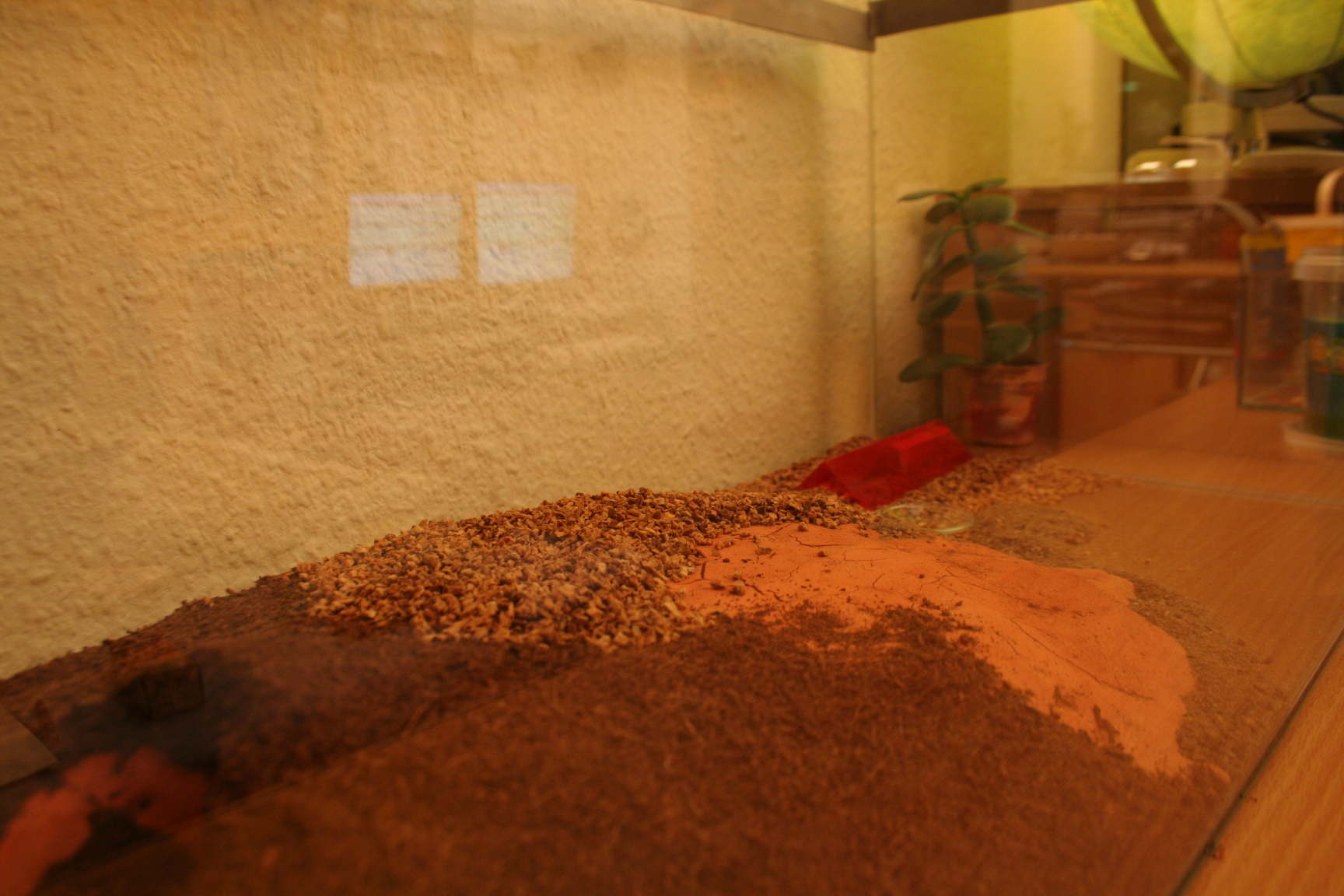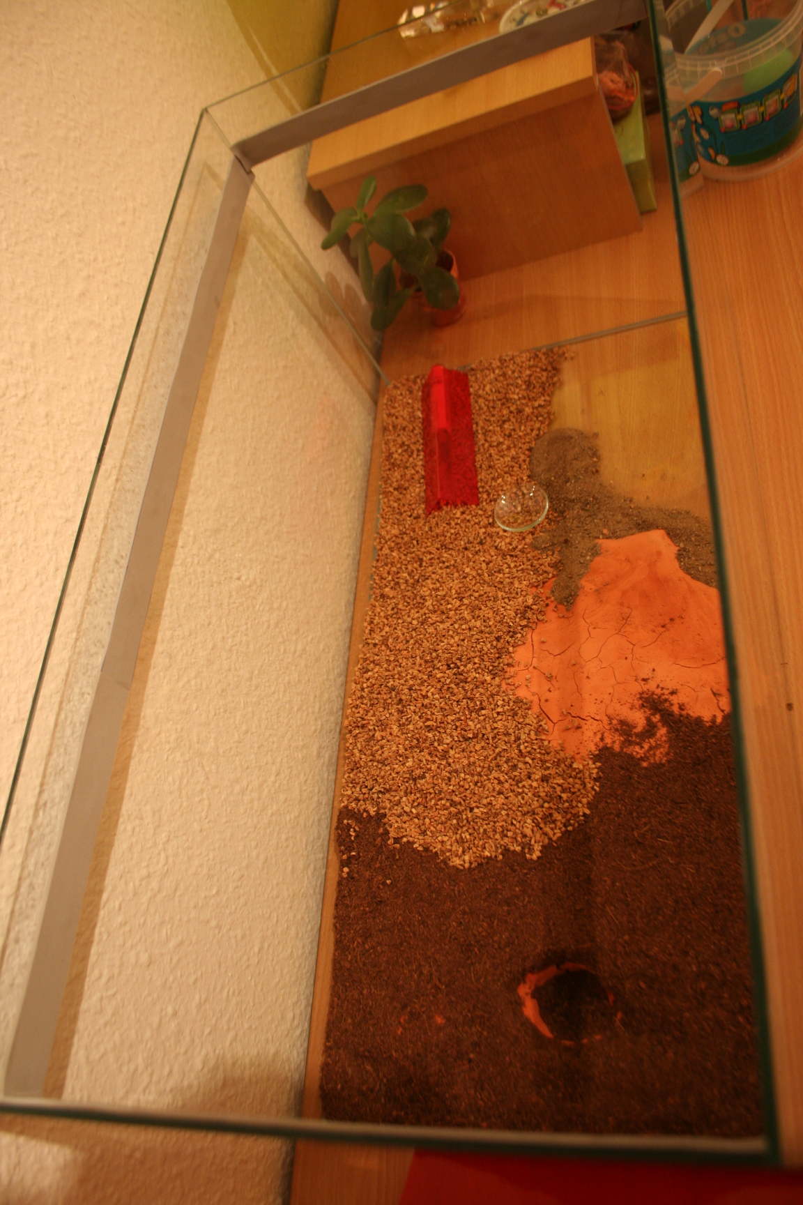 Der Umtausch ging schnell und ich kam mit einem neuen Aquarium und etwas Moosgummi wieder nach Hause. Als erstes montierte ich mit HeiĂkleber einen Streifen Moosgummi ca. 3cm unter der Kante auf der Innenseite der Arena. DarĂŒber pinselte ich Paraffinöl. Der Moosgummi soll verhindern, dass das Ăl wieder runter lĂ€uft. Ich gestaltete die Arena wieder neu, wobei ein Teil komplett leer blieb. Er soll mit dem Ytong und einem Sand-Lehm Gemisch gestaltet werden.