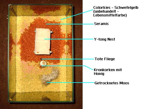 [font=Tahoma]Die interessantesten Infos vorweg: Das Nest wird nun effektiv genutzt. Und zwar werden Beutetiere in einer grossen Kammer gelagert. Bei bedarf holt eine Arbeiterin – ich glaube, es ist immer die selbe, die fĂĽr Nahrungsbeschaffung zuständig ist – das Beutetier und bringt es in den Thronsaal. Und jedes Mal, wenn es einen Festschmaus gibt, sind auch gleich ALLE Ameisen da, sogar die Larven werden mitgebracht und die Beute wird kollektiv zerlegt und geteilt bzw. wird Peach, die Königin, auch zwischendurch immer gefĂĽttert. Sind nur noch Reste, wie Chitin-Panzer und ähnliches vorhanden, räumt auch wieder eine Ameise auf – da es nur 7 Arbeiterinnen sind und alle unterschiedlich gross sind (Pygmäen), gehe ich davon aus, dass diese Arbeit auch immer wieder von ein und der selben Ameise verrichtet wird. Die Reste werden in einer anderen Kammer, eher einem Gang, gelagert und in Ritzen gestopft, was eigentlich nicht Sinn der Sache sein sollte, aber die Bewohner werden schon wissen, was sie da tun. Die Brut hat sich noch nicht sichtbar weiter entwickelt und beim Volk tut sich auch nicht sonderlich viel. Die Aussenaktivitäten haben sehr abgenommen, dafĂĽr wird aber im Nest oft ein Gruppenputzen veranstaltet, zur Zeit wohl der letzte Schrei in Antsworld. Aktuelle Nahrungsdaten: Auf der Speisekarte stehen zur Zeit viele MĂĽcken und Fliegen, danach kommt der Honig, der uninteressant ist, sowie es proteinreichhaltige Nahrung gibt.[/font]