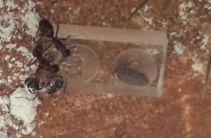 Gestern konnte ich meine Camponotus ligniperdus beim Händler persönlich abholen. Anbei ein paar Fotos. Honigwasser haben sie gestern getrunken, heute liegen sie mehrheitlich faul rum. Die Fliegenpuppe haben sie noch nicht angerührt. Es sind 8 Arbeiterinnen, einige davon haben heute schon das Birkenholz erkundigt welches an der Rückseite eine Folie hat.