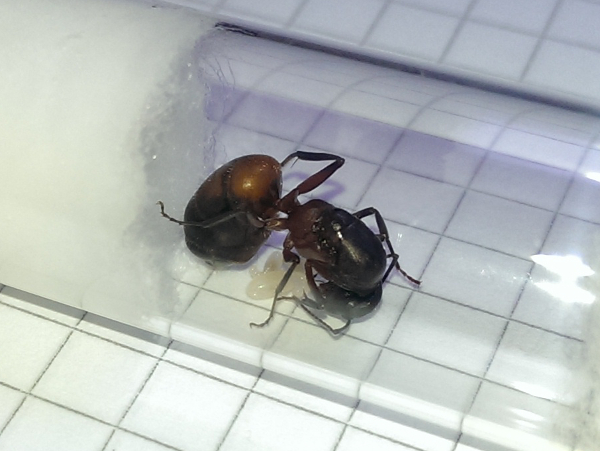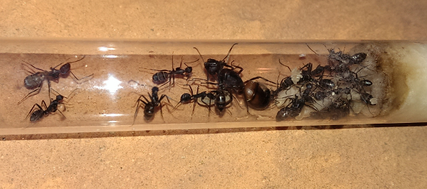 Die Temperaturen betragen durchgehend 26-30°C. Ein Bewässern findet nicht statt, hier halte ich die Ameisen komplett trocken. Die Luftfeuchtigkeit im RG wird eh über den Wassertank geregelt.
