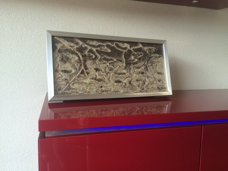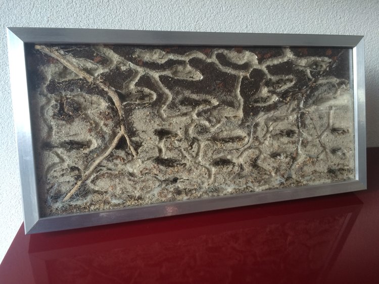 Was das Wachstum anbelangt, so stand 1 Kolonie über den anderen Kolonien und Anfang 2017 machte ich meine FBF (Foto Bilderrahm Formicarium), die mir noch zur Verfügung stand. Zuvor hatte ich eine Messor Kolonie in dieser FBF aber diese Kolonie wurde zu groß. Leider haben die Messor-Arbeiterinnen diese Formicarium innen mit weißem Kot verschmiert, was es schwierig machte, in einen kleinen Teil des Nestes zu schauen. Natürlich konnte ich das Nest nicht öffnen, um die Streifen zu entfernen, da das ganze Nest in Plexiglas gehüllt war, um den Ausbruch zu verhindern.