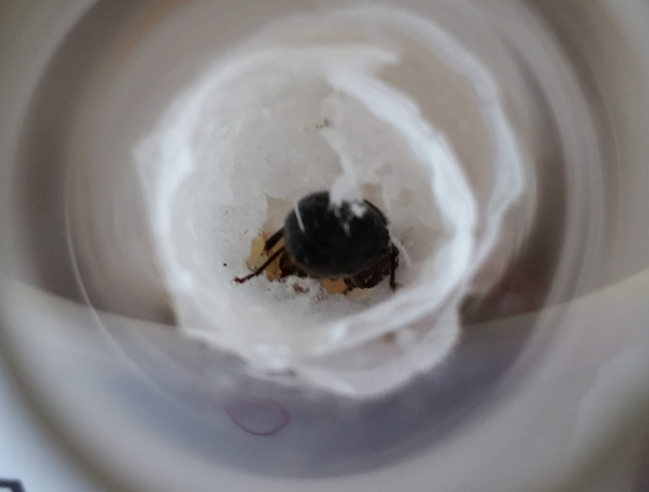 Puhh, alles war gut gegangen und man konnte erkennen, dass da auch Puppen waren. Da im Röhrchen noch ein Stück Küchenpapier war und sie mit der Brut genau darin hockte, konnte man nicht genau sehen, wieviel von welchen Stadien vorhanden waren.