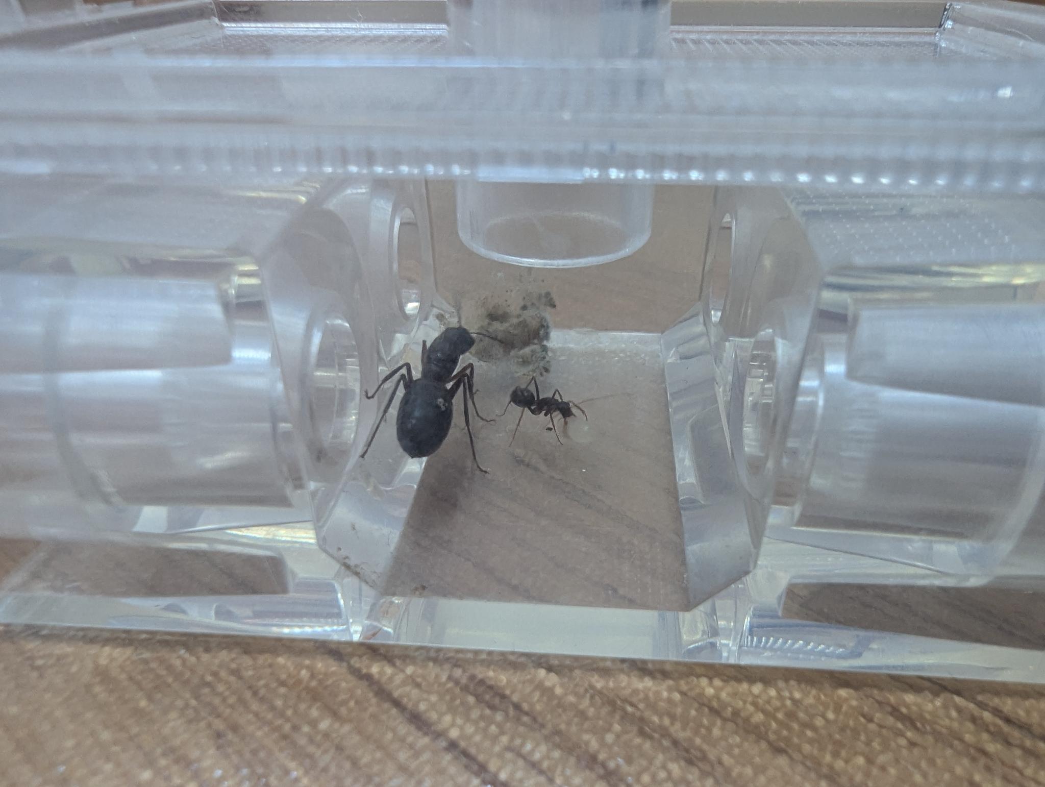 Alright, Tube ist an das kleine Nest angeschlossen. Nun hoffe ich, dass die Königin und Nanite samt Larve freiwillig umzieht.