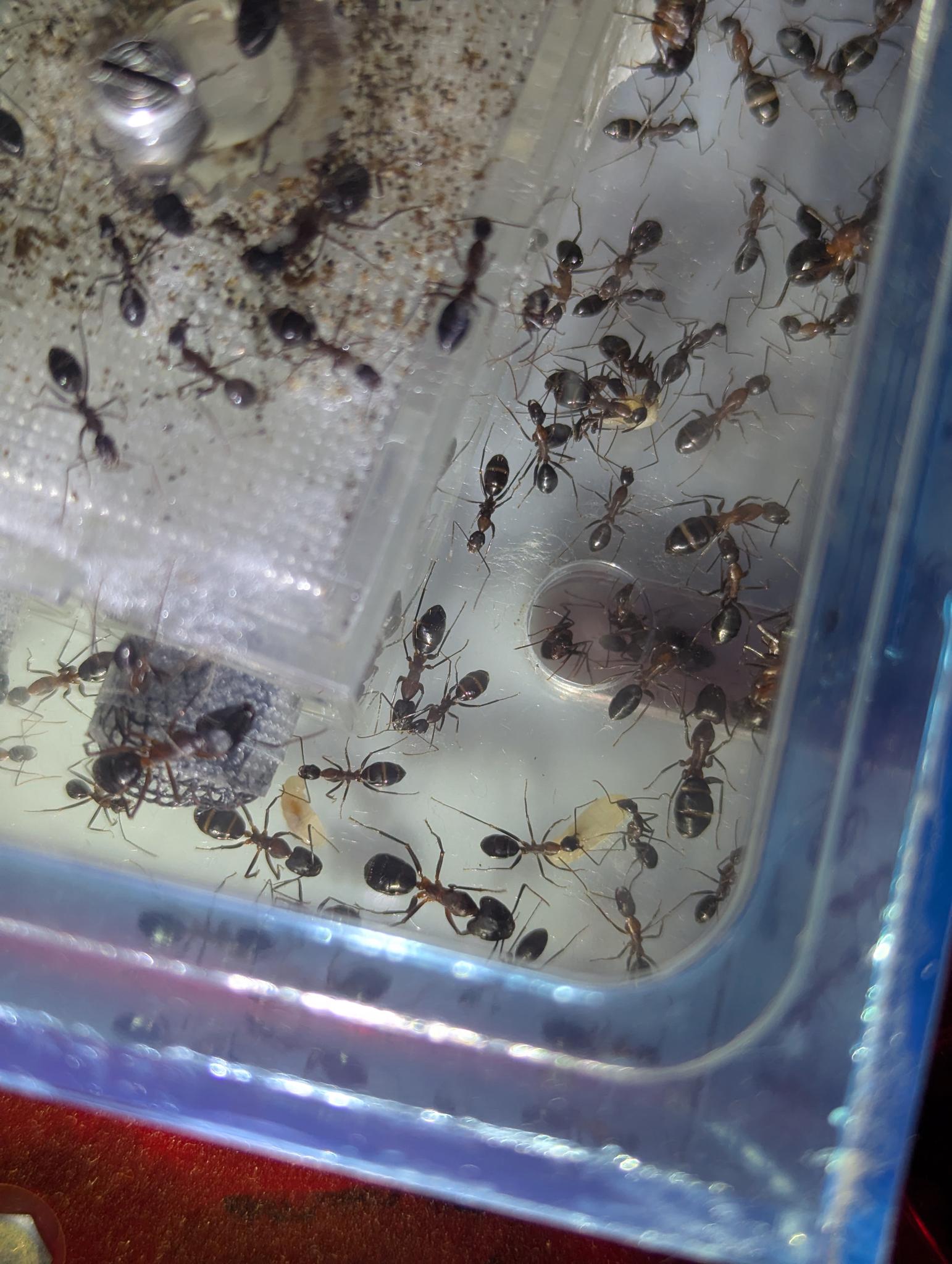 Kurzes update. Ich habe das kleine Nest noch mal angepasst und zwei der Eingänge mit einem Stoff/Plastikgitter verschlossen, damit sich der Geruch besser verteilen kann. Ausserdem habe ich auf der anderen Seite einfach direkt Watte reingestopft und die eine mit Wasser und die andere mit Zuckerwasser getränkt. Ebenfalls habe ich der Königin Drosophila angeboten, welche sie tatsächlich direkt gemampft hat.