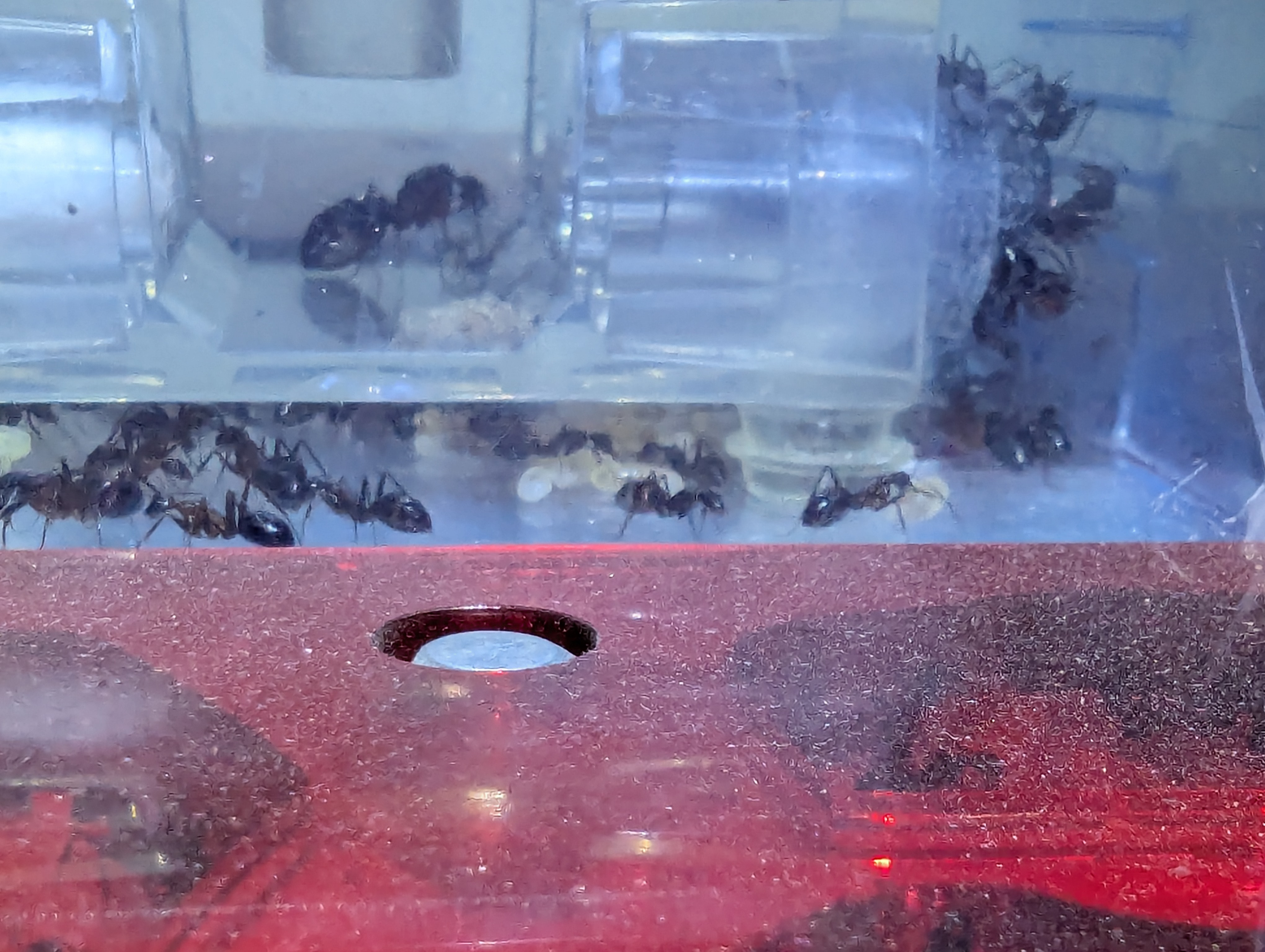 Die Situation ist weiterhin ruhig, die Königin und 1 Nanite sind wohlauf und die Larve, die sie haben wächst gut. Die Arbeiterinnen aus dem Hauptnest sitzen um das Nest der Königin und sind recht ruhig. Ich sehe auch immer wieder, dass Larven hoch getragen werden und gegen das Nest gedrückt werden. Das ist schon mal gut. Trotzdem wage ich es noch nicht einfach auf zu machen.