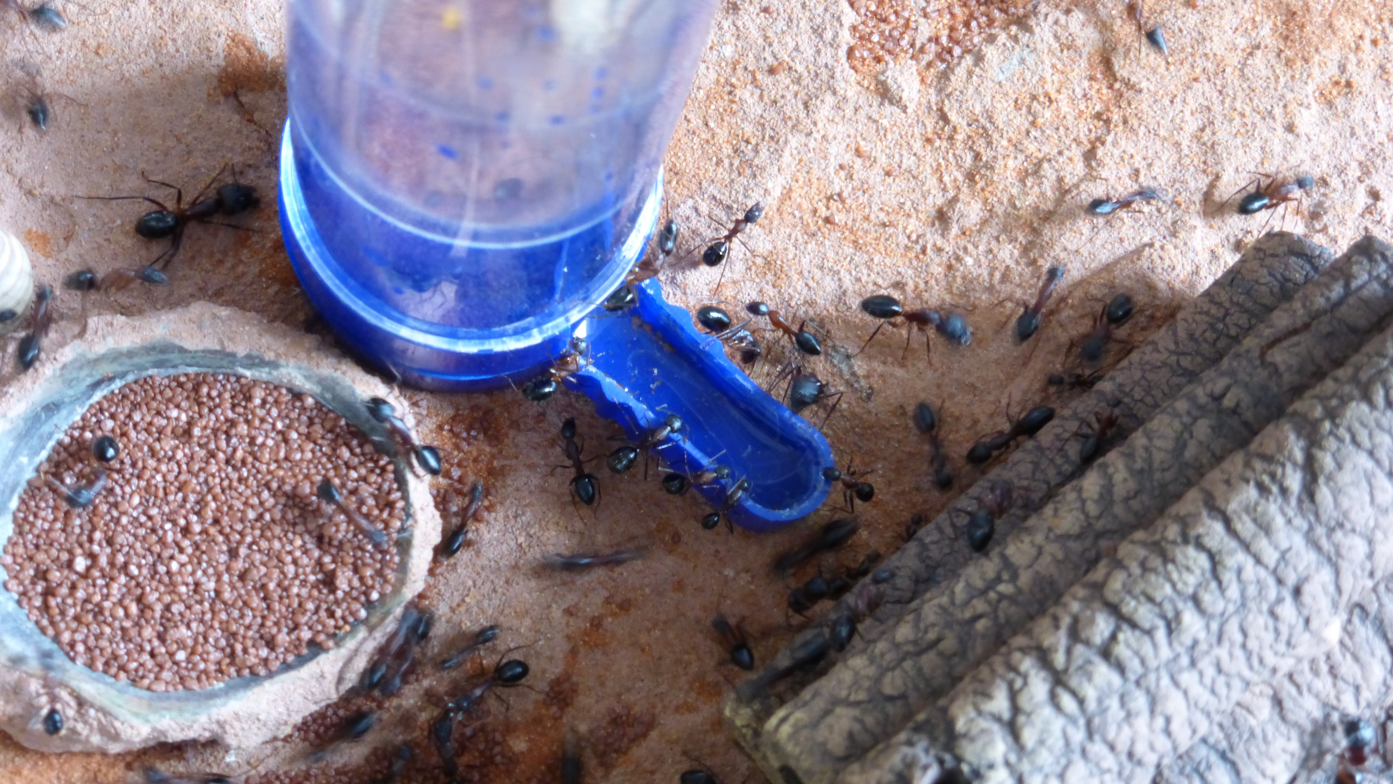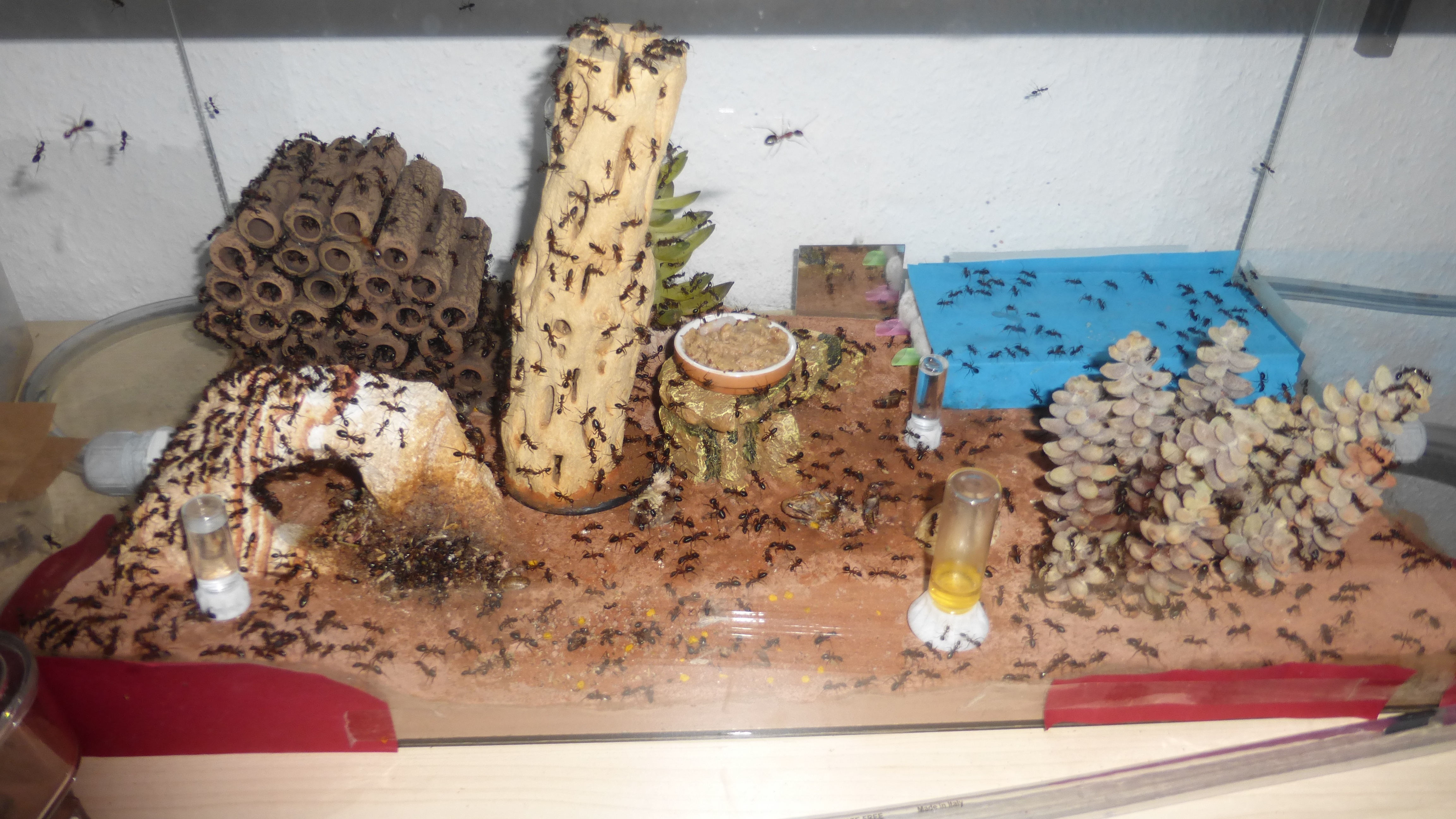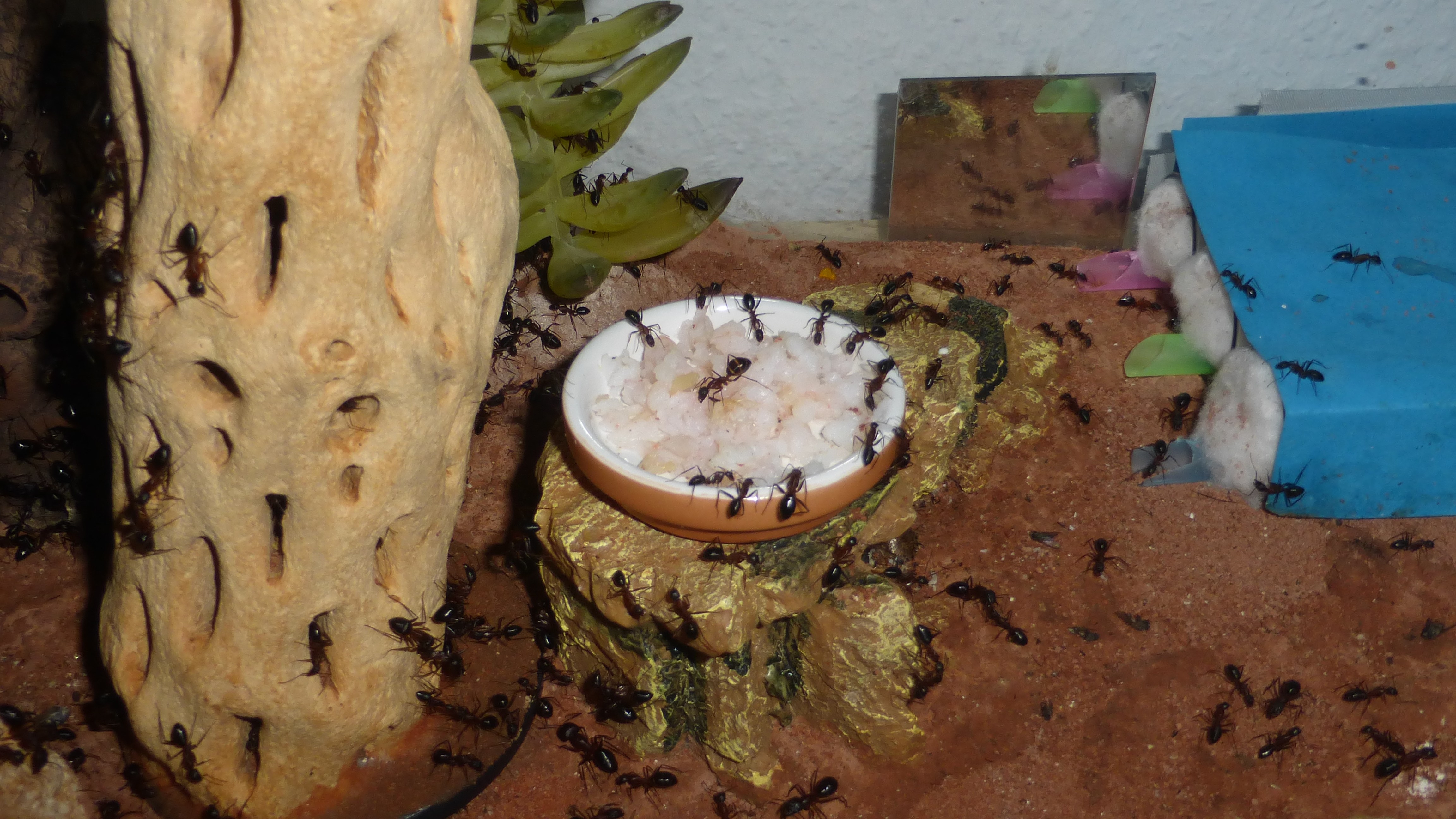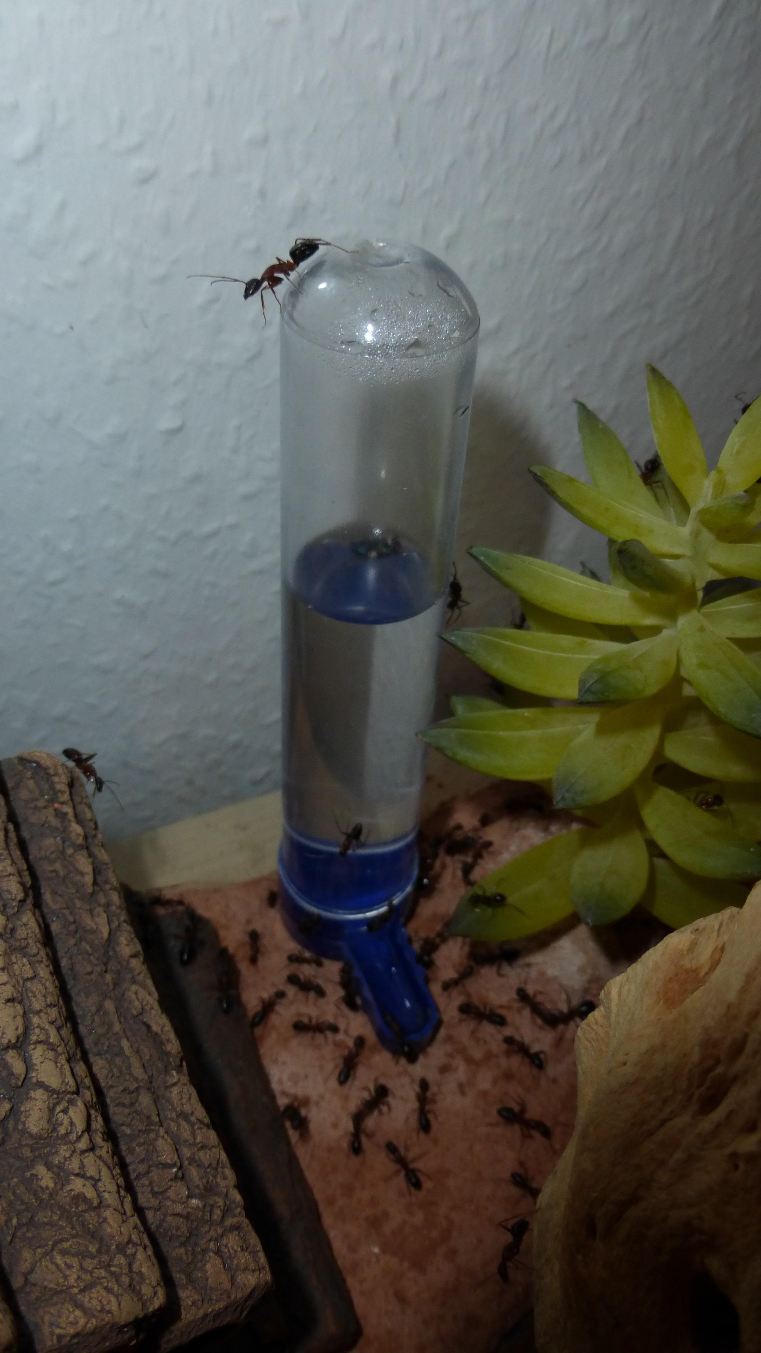 Dieses Bild wurde aufgenommen als ich zum ersten Mal dieses Jahr die Wärmelampe über das Becken gehängt hab. Man sieht schön wie sich die Ameisen auf dem Stamm und der Kunstpflanze im Hintergrund alle auf der zur Lampe gerichteten Seite niedergelassen haben.