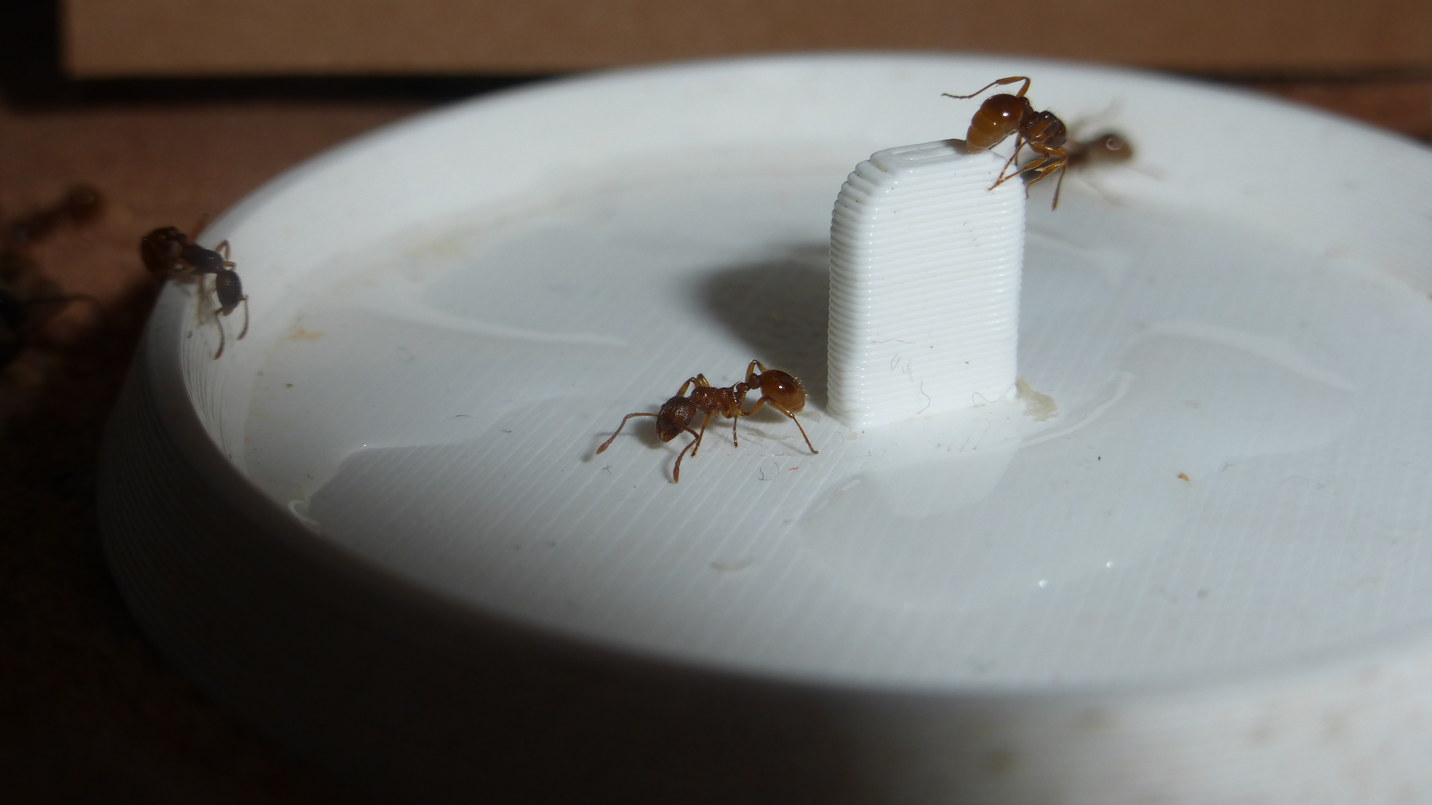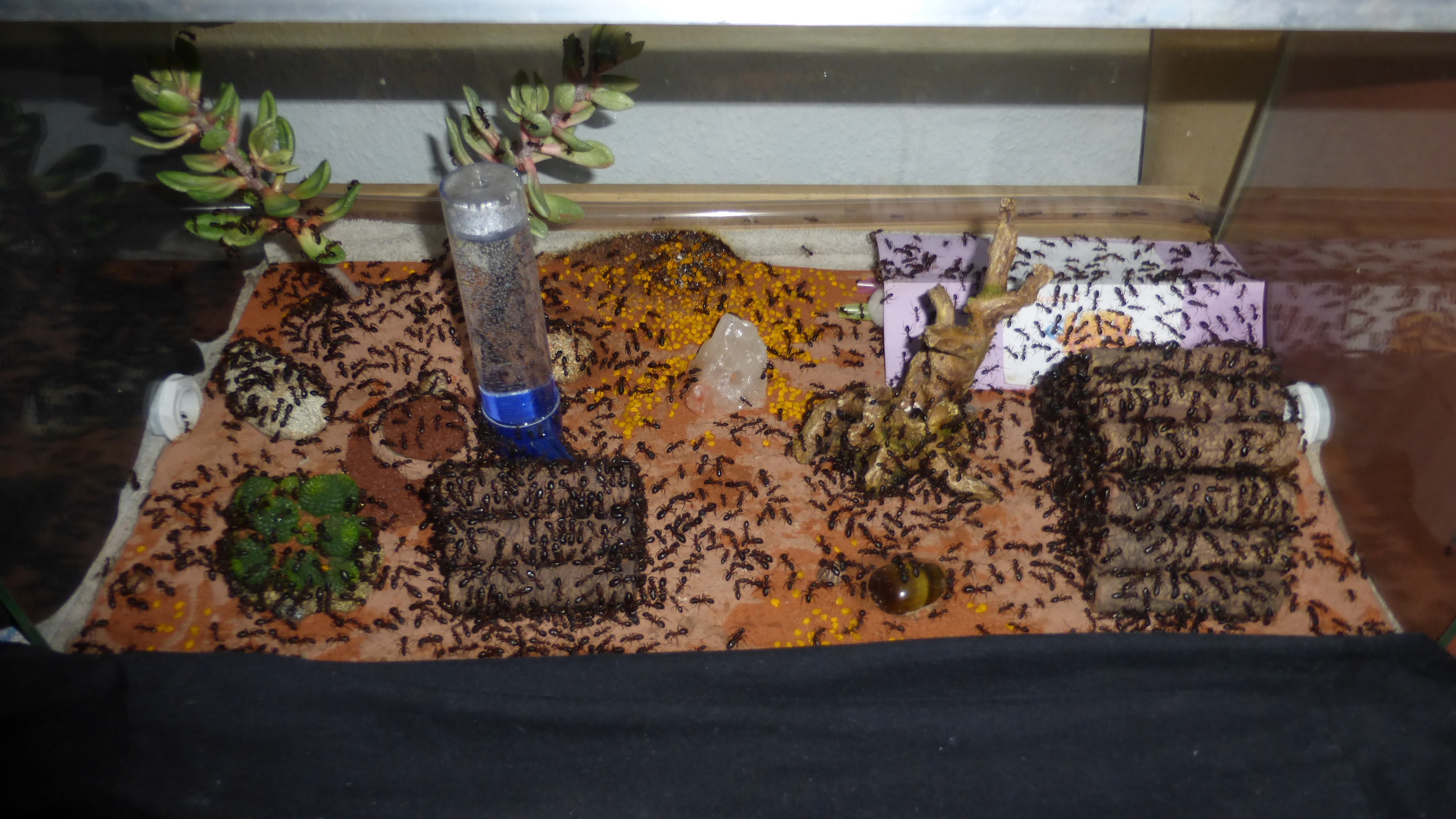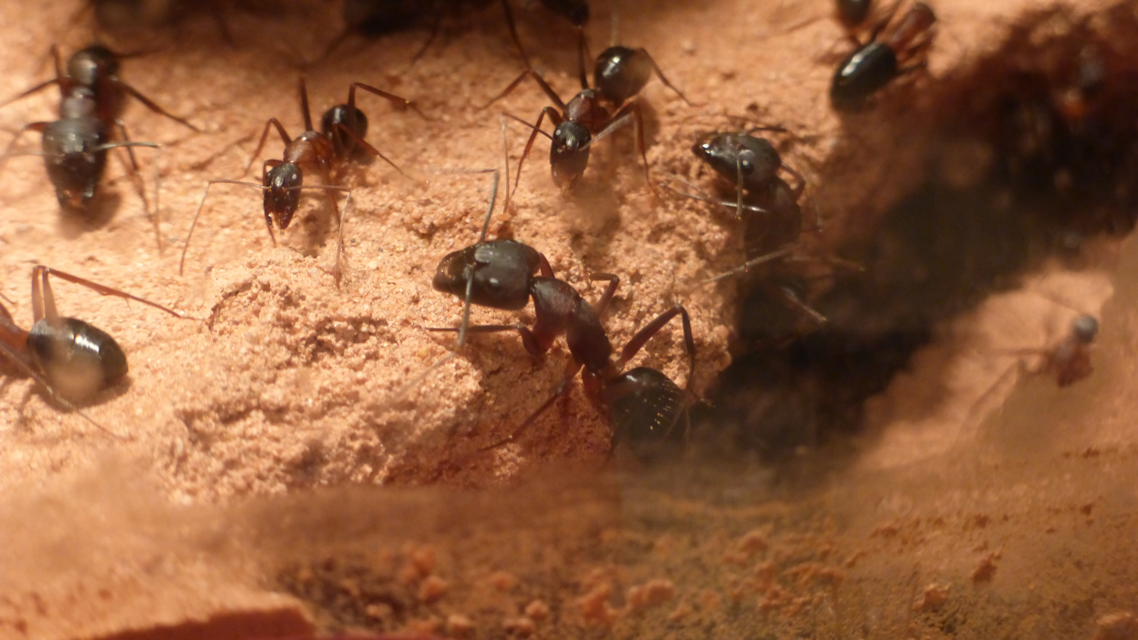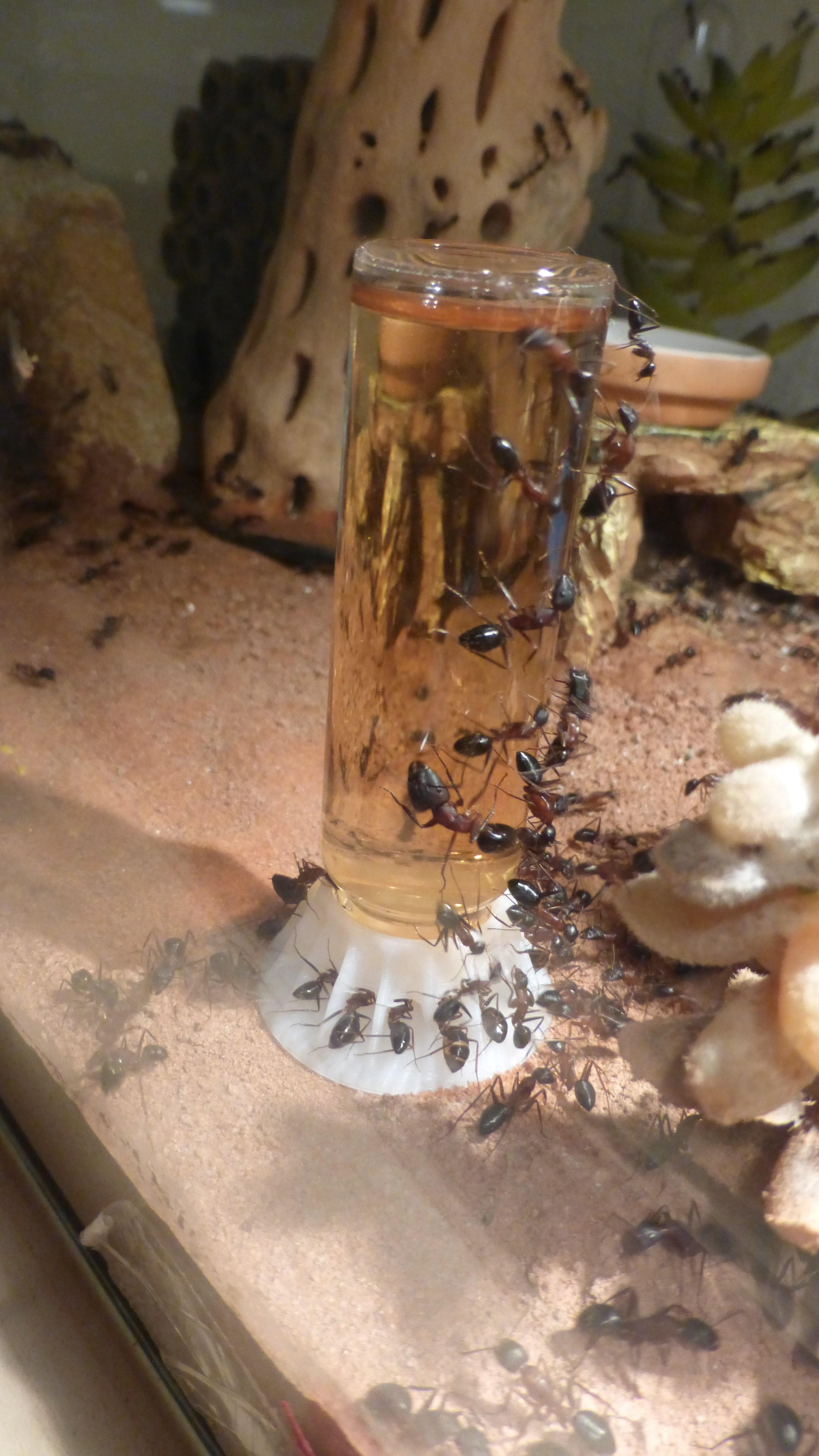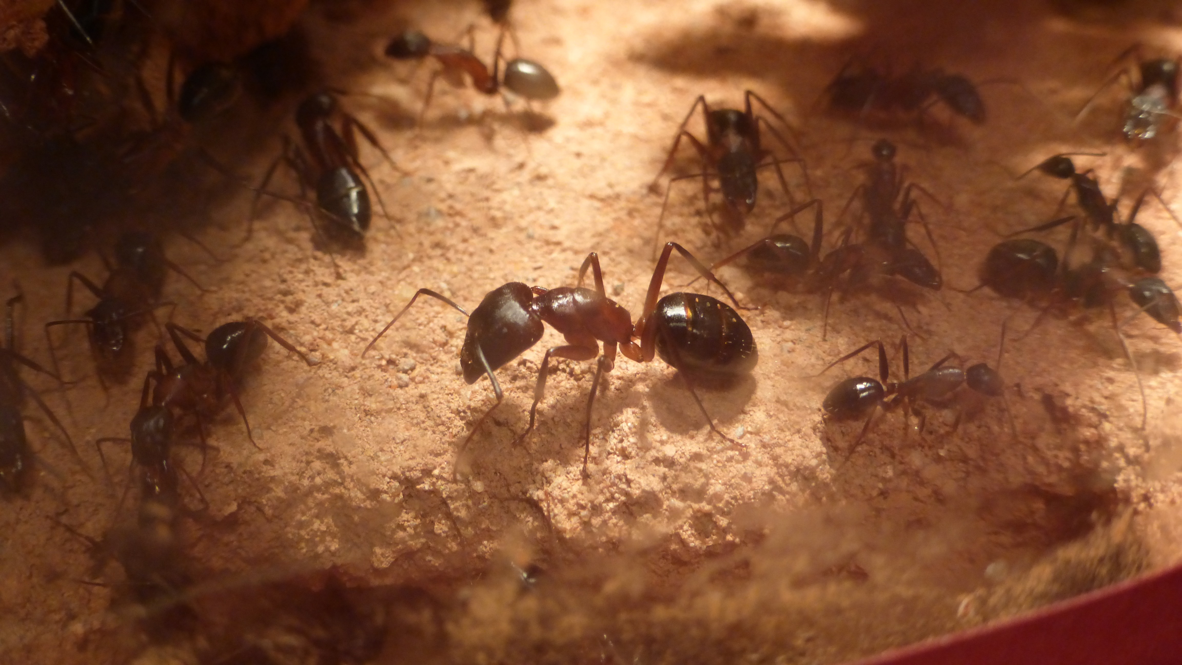 Dieses Bild wurde aufgenommen als ich zum ersten Mal dieses Jahr die Wärmelampe über das Becken gehängt hab. Man sieht schön wie sich die Ameisen auf dem Stamm und der Kunstpflanze im Hintergrund alle auf der zur Lampe gerichteten Seite niedergelassen haben.