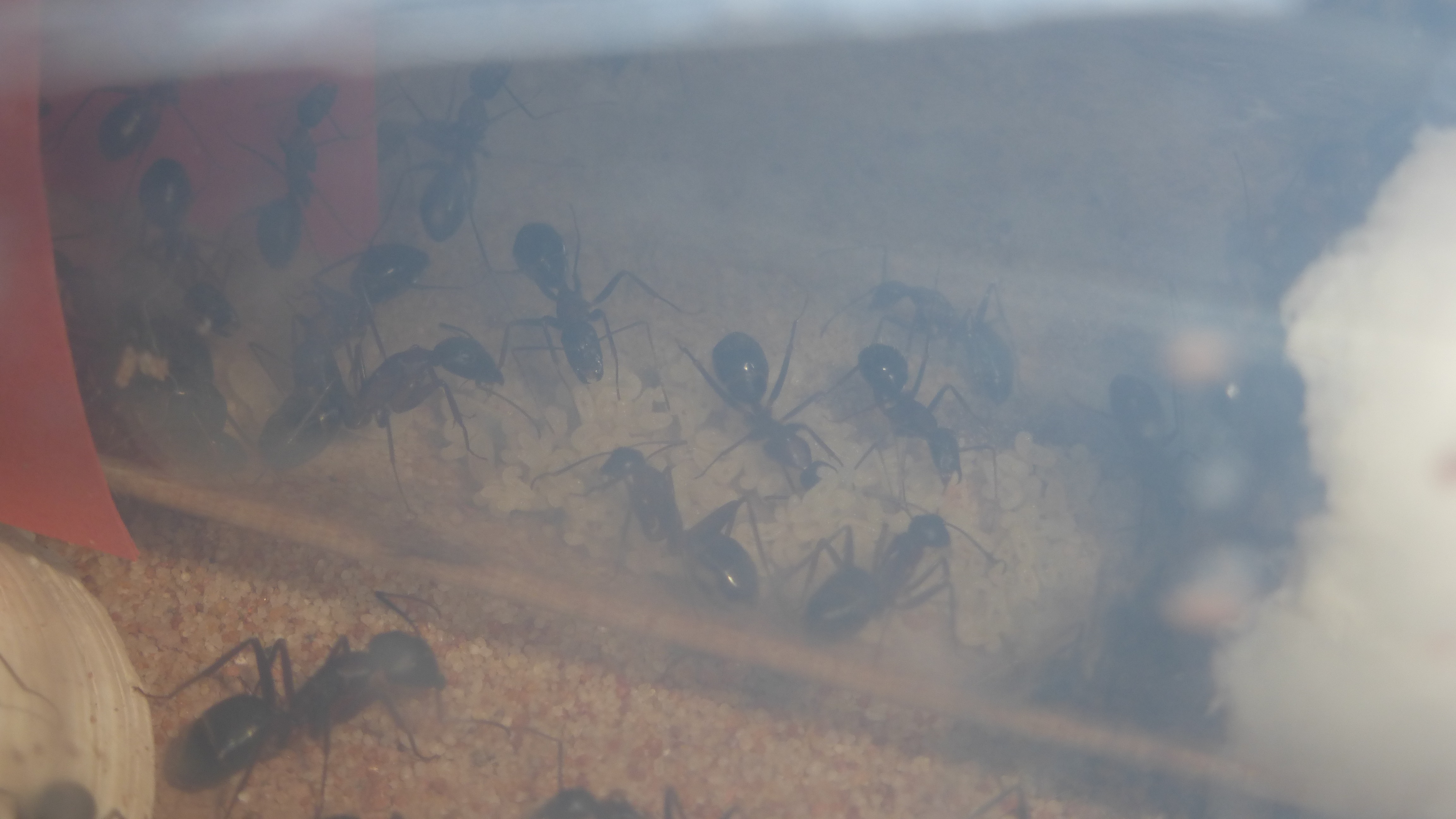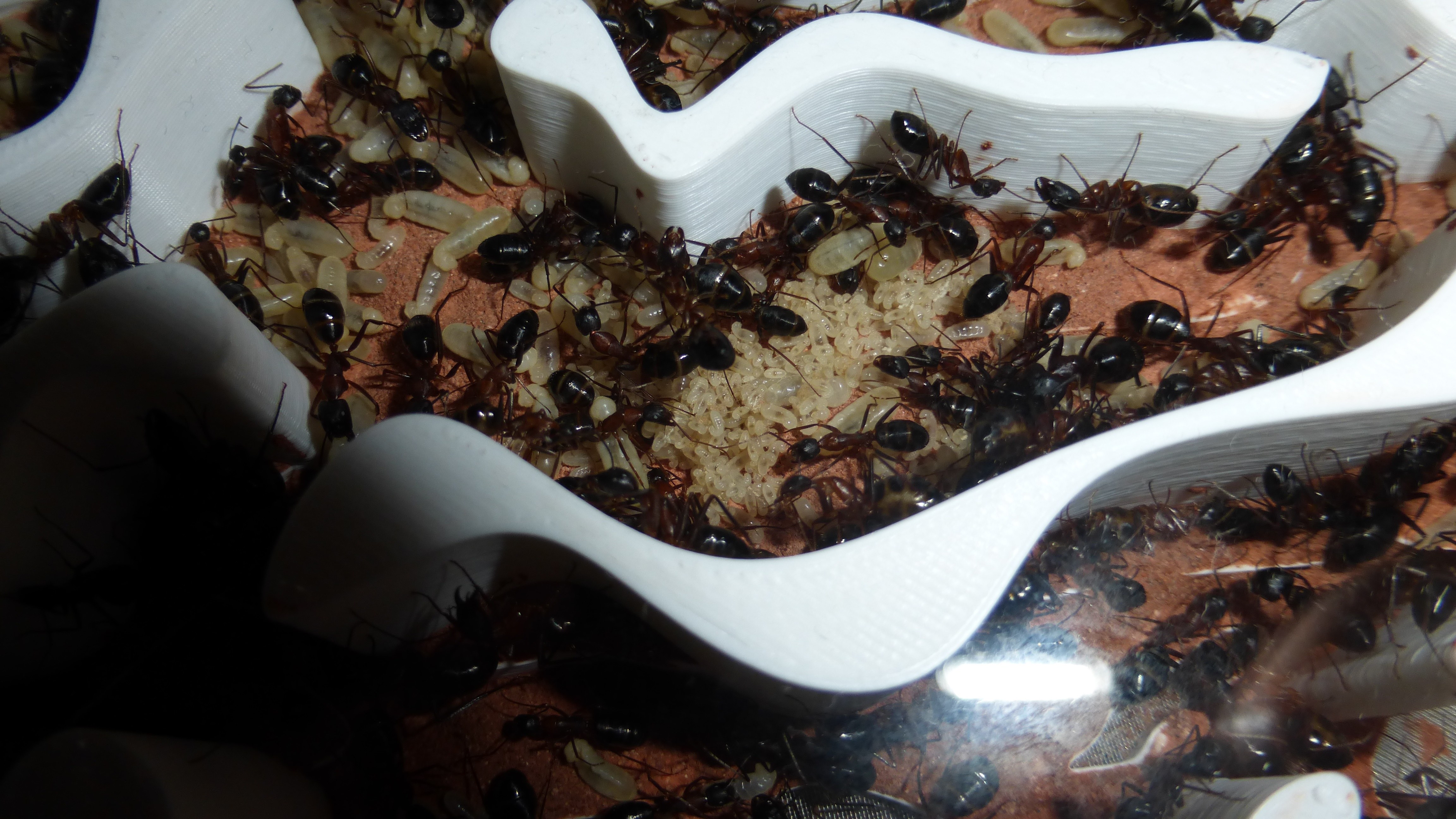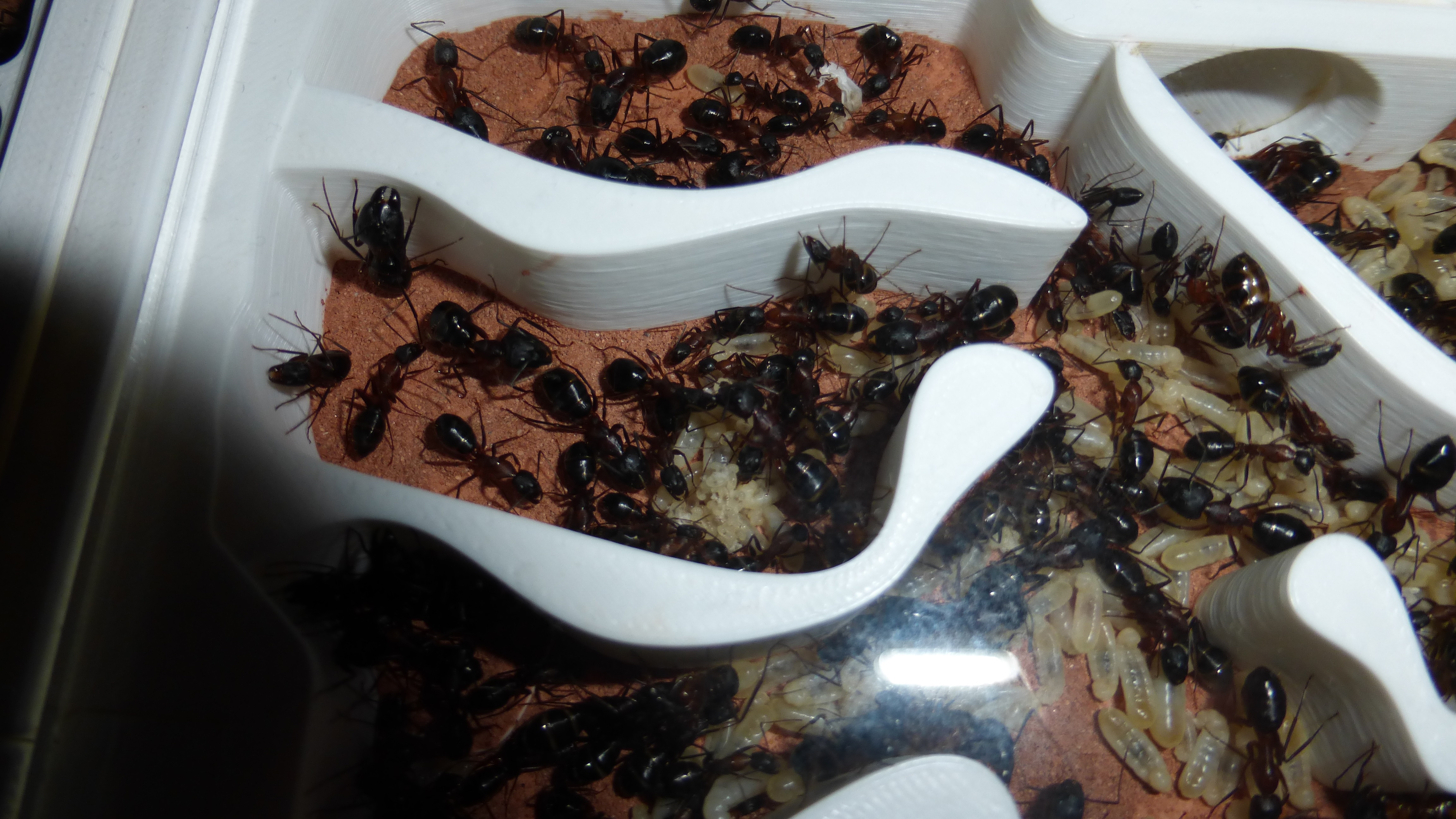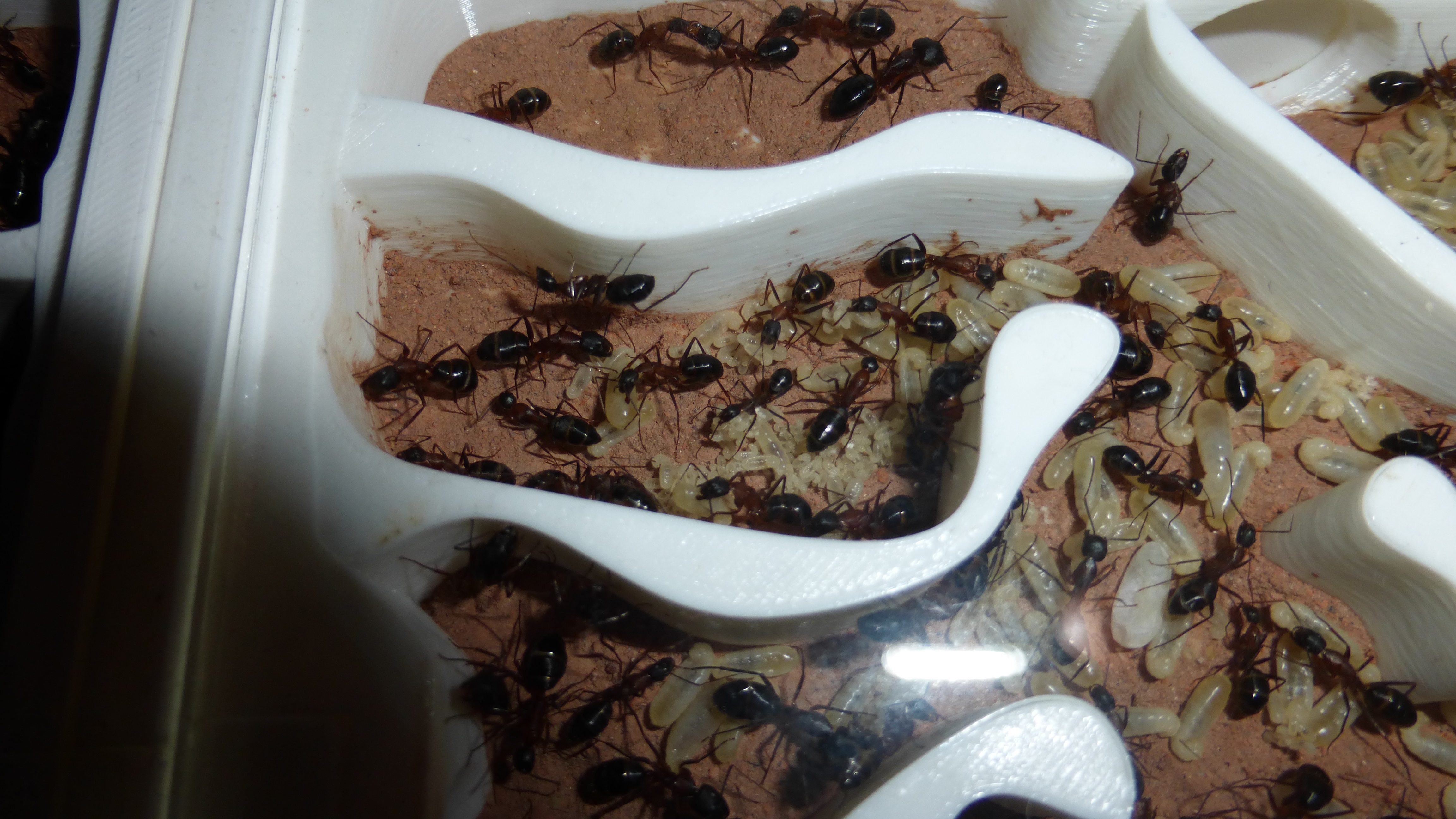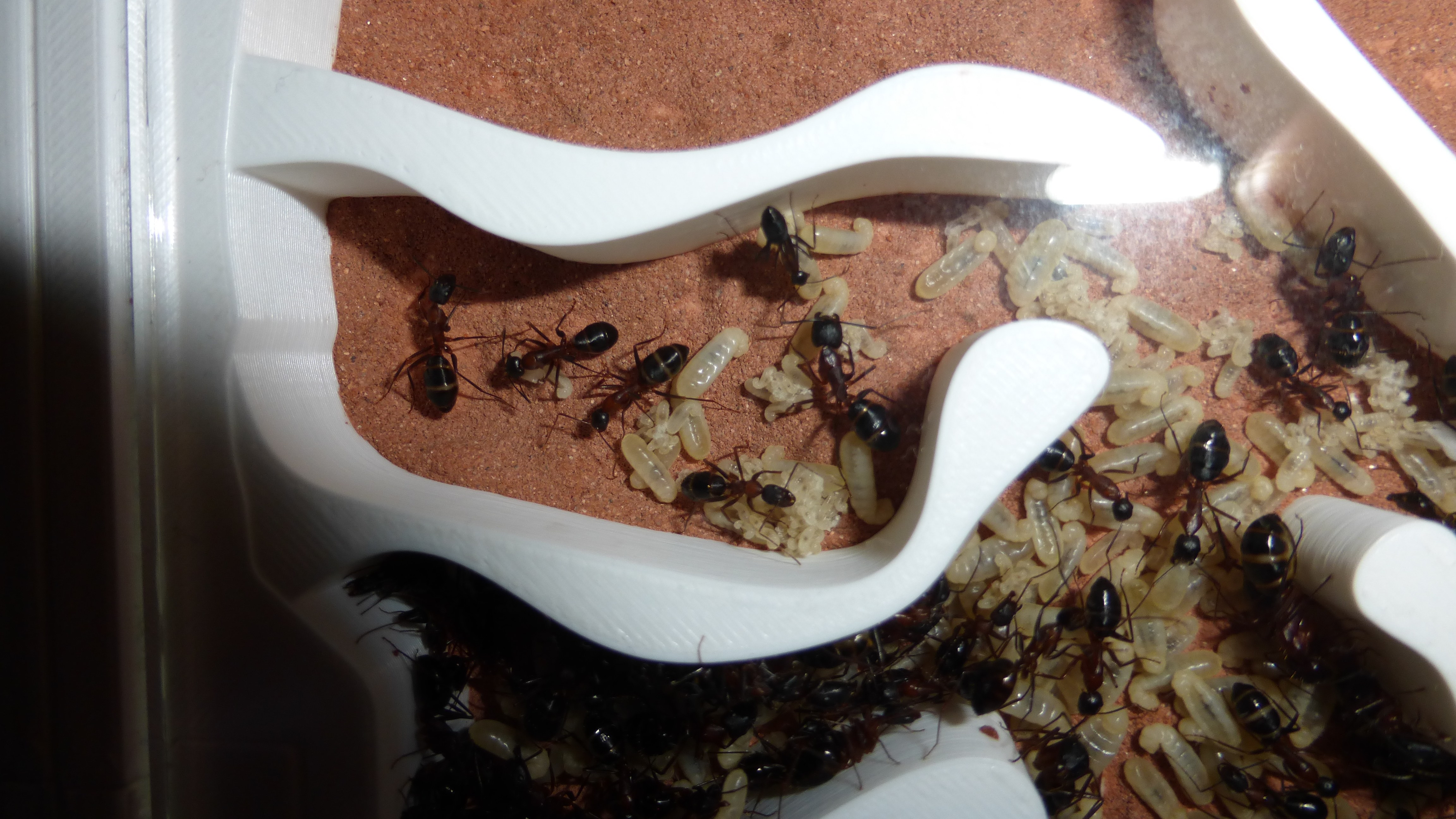 Erstaunlich viel Brut in der "Ende der Welt"-Box, wenn man bedenkt, dass ich noch nie gesehen habe wie sie Eier dorthin tragen. Bei Camponotus werden die Arbeiterinnen ja vom Eierlegen abgehalten, wenn sie regelmäßig in Kontakt mit Eiern der Königin kommen, deshalb sie die wohl da, aber keine Ahnung sie die dorthin kommen. Wahrscheinlich machen sie das irgendwann ganz spät, so um 4 Uhr nachts.