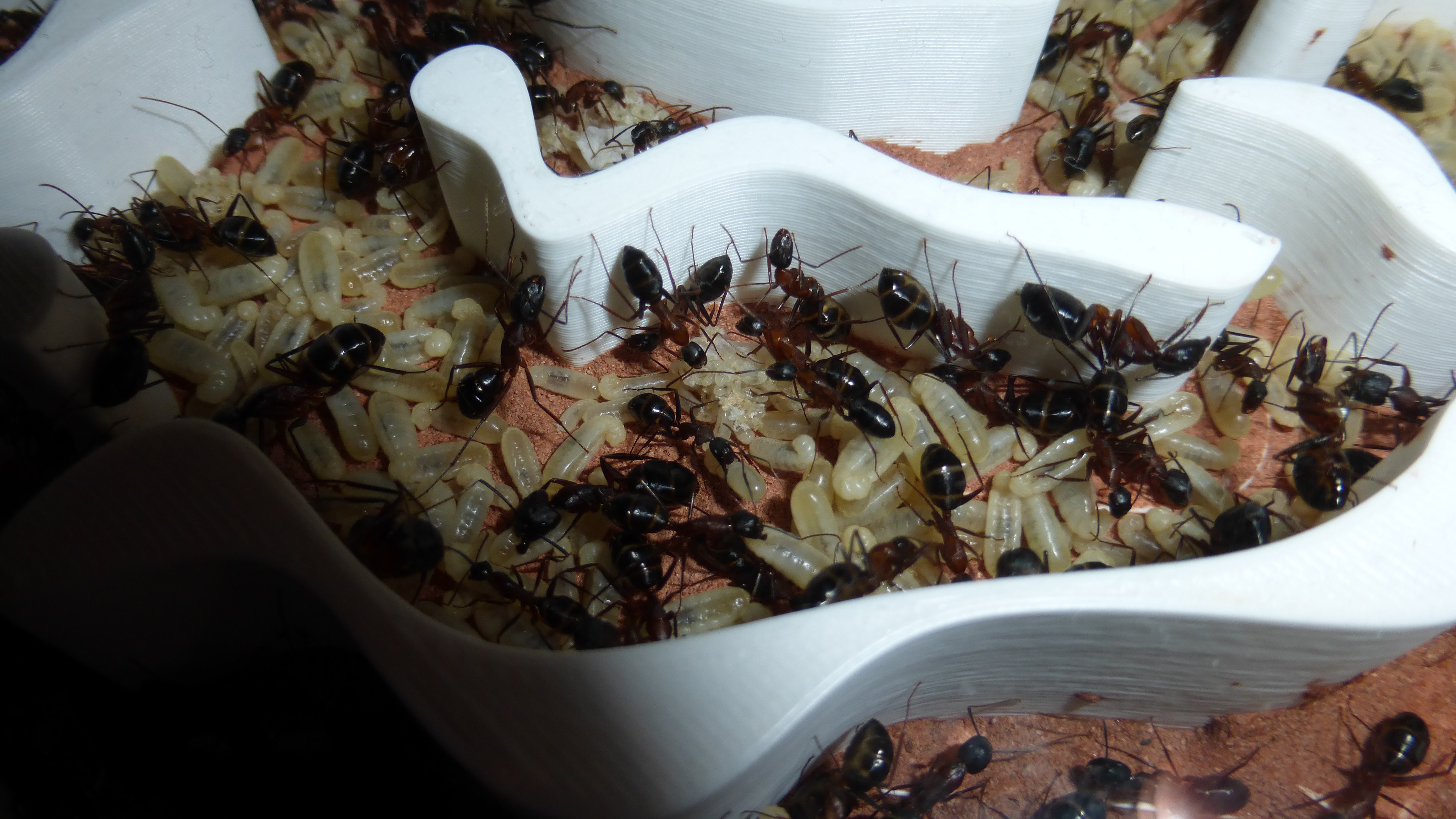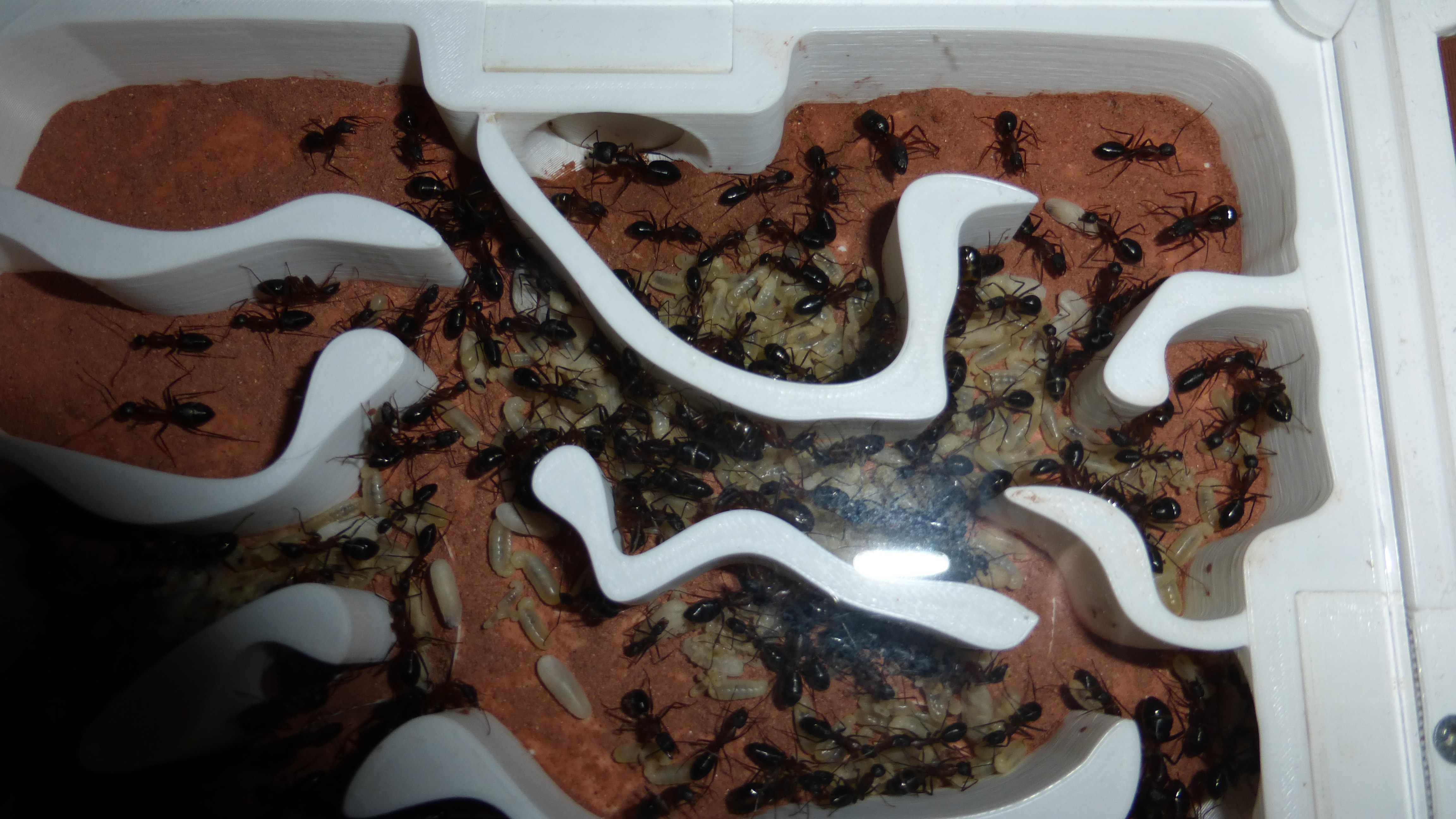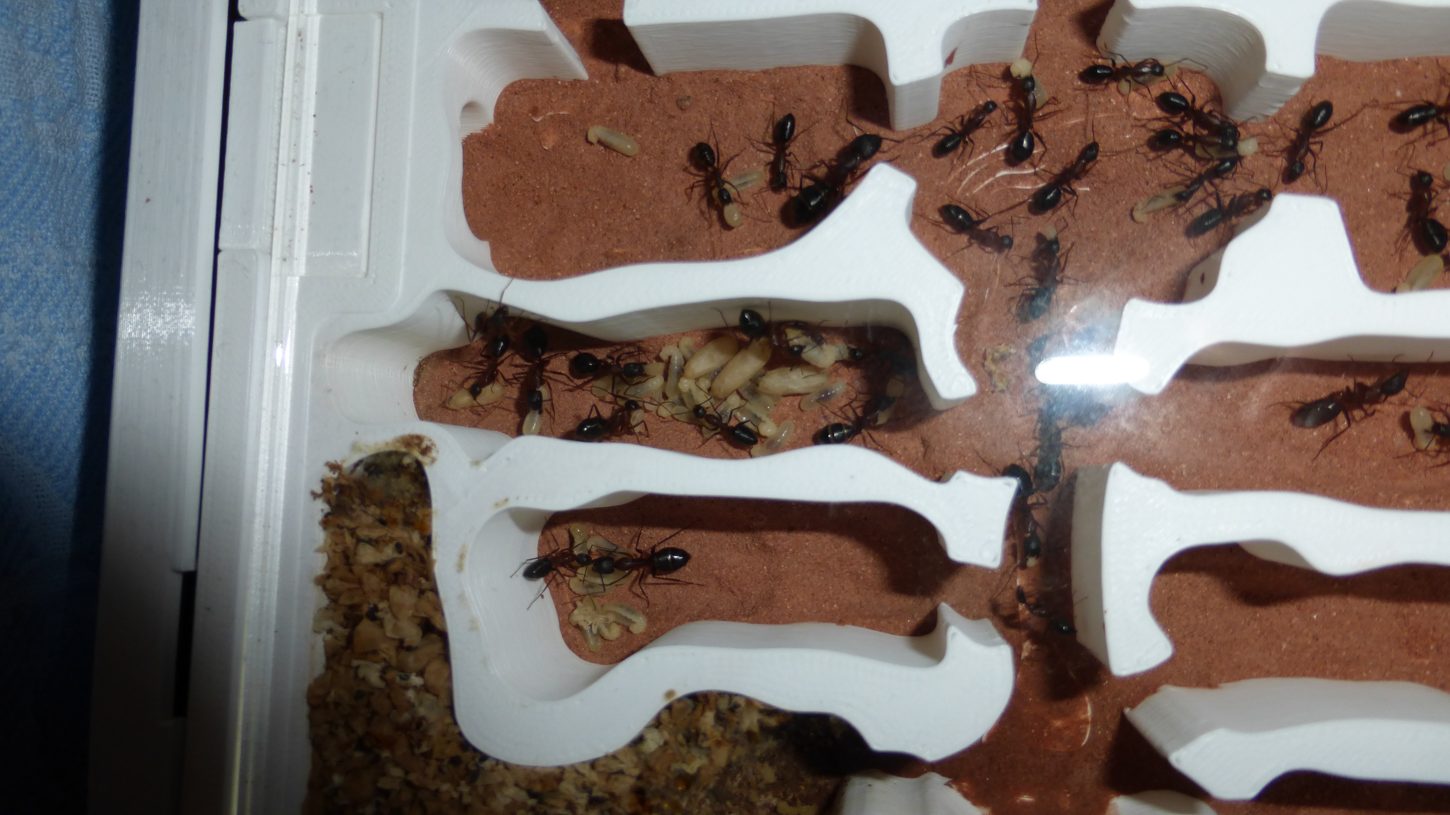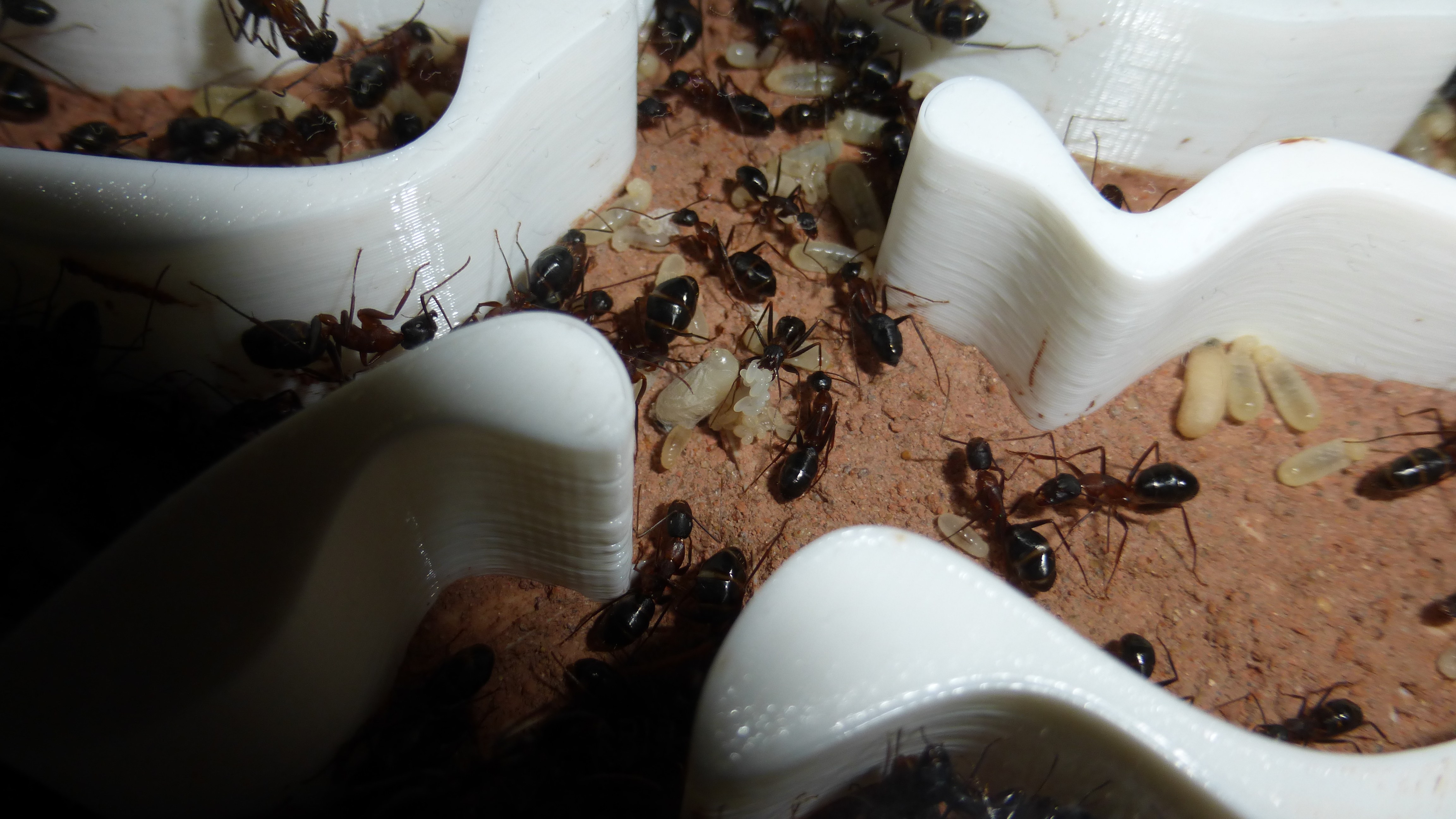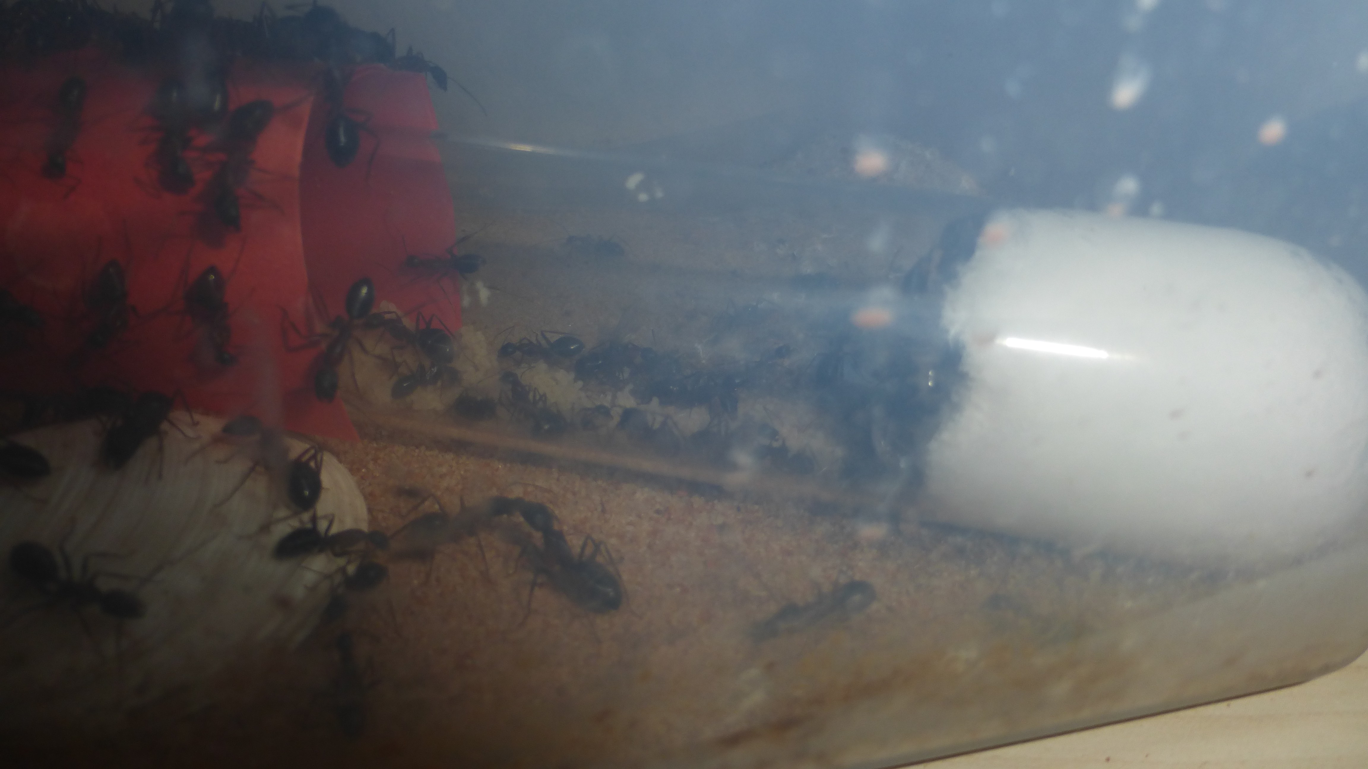 Erstaunlich viel Brut in der "Ende der Welt"-Box, wenn man bedenkt, dass ich noch nie gesehen habe wie sie Eier dorthin tragen. Bei Camponotus werden die Arbeiterinnen ja vom Eierlegen abgehalten, wenn sie regelmäßig in Kontakt mit Eiern der Königin kommen, deshalb sie die wohl da, aber keine Ahnung sie die dorthin kommen. Wahrscheinlich machen sie das irgendwann ganz spät, so um 4 Uhr nachts.