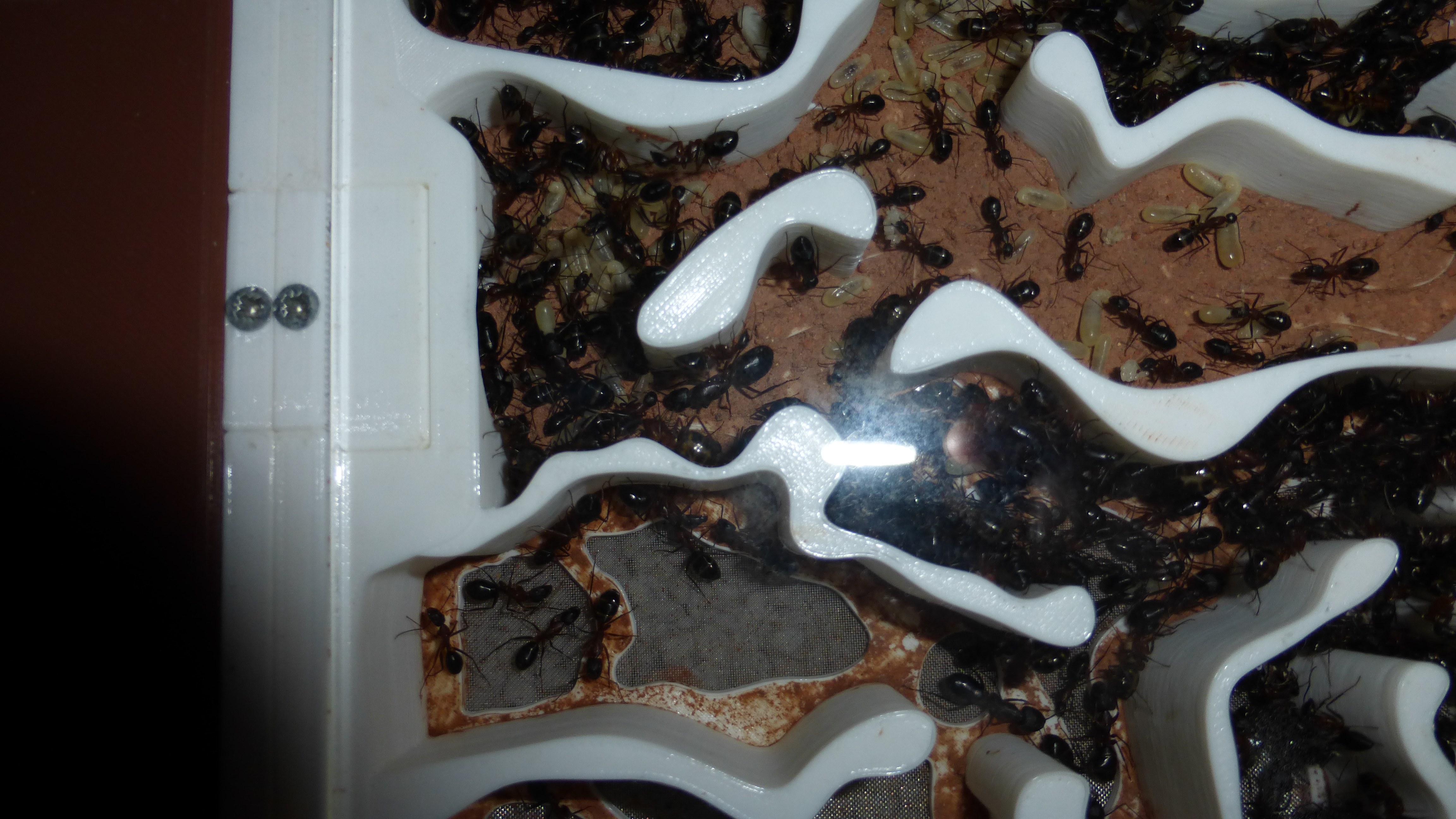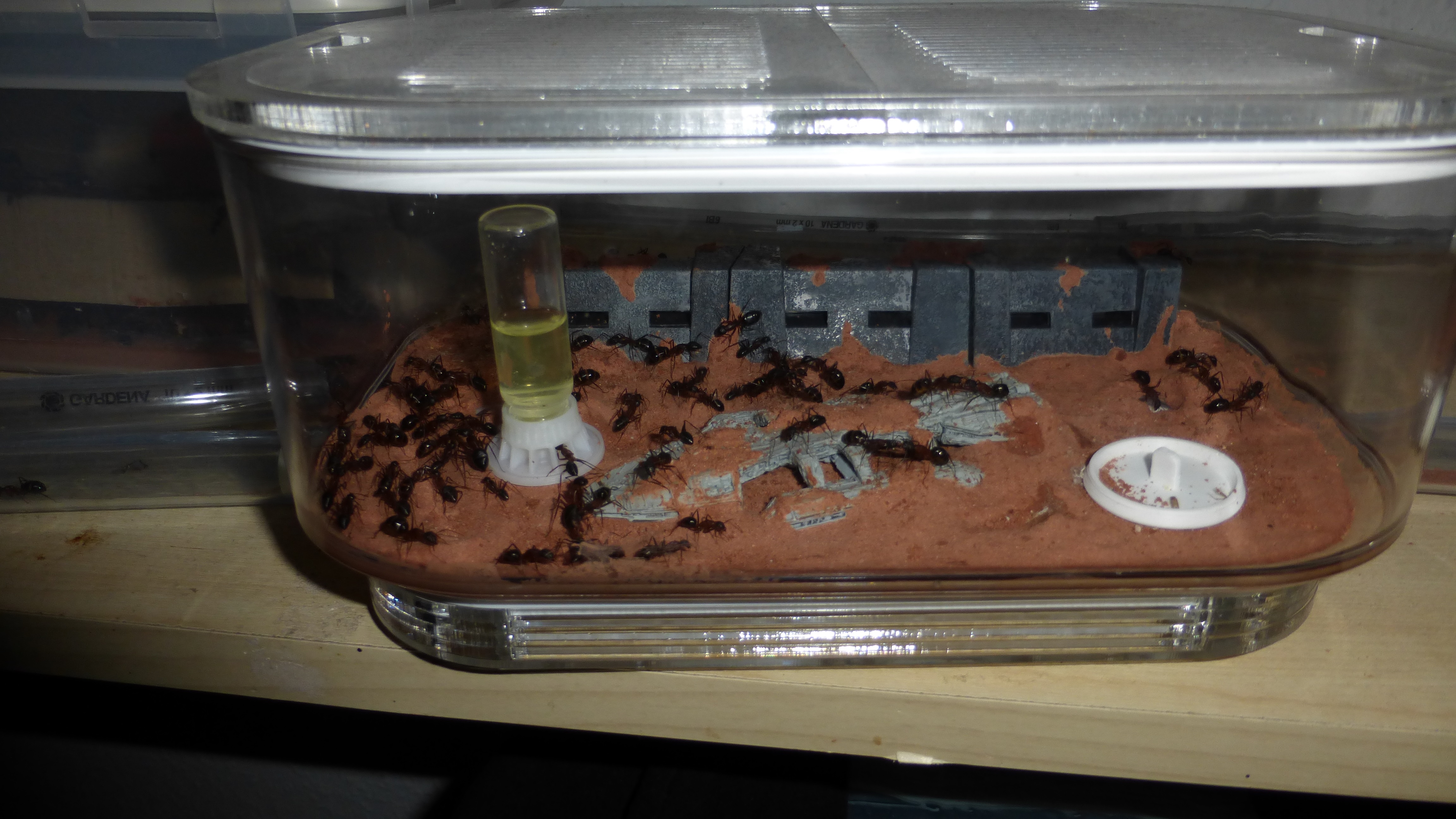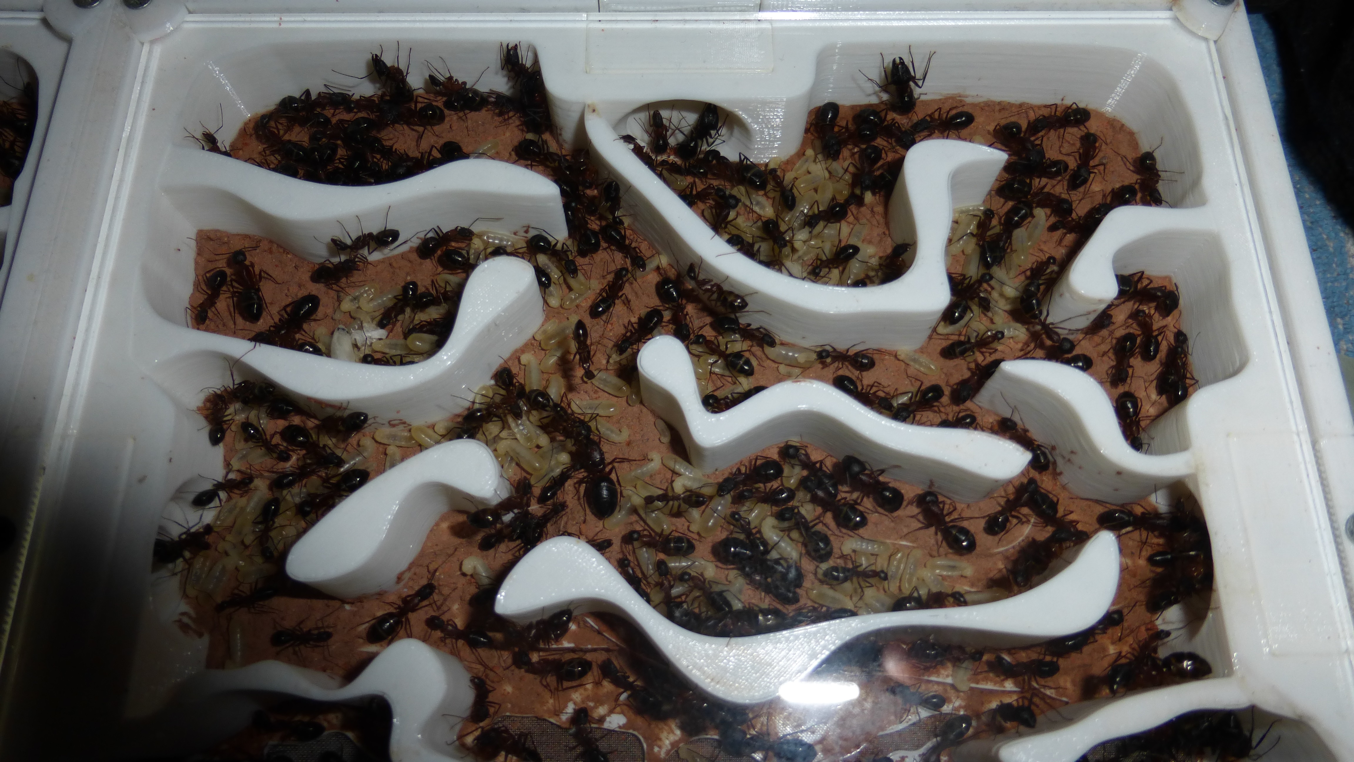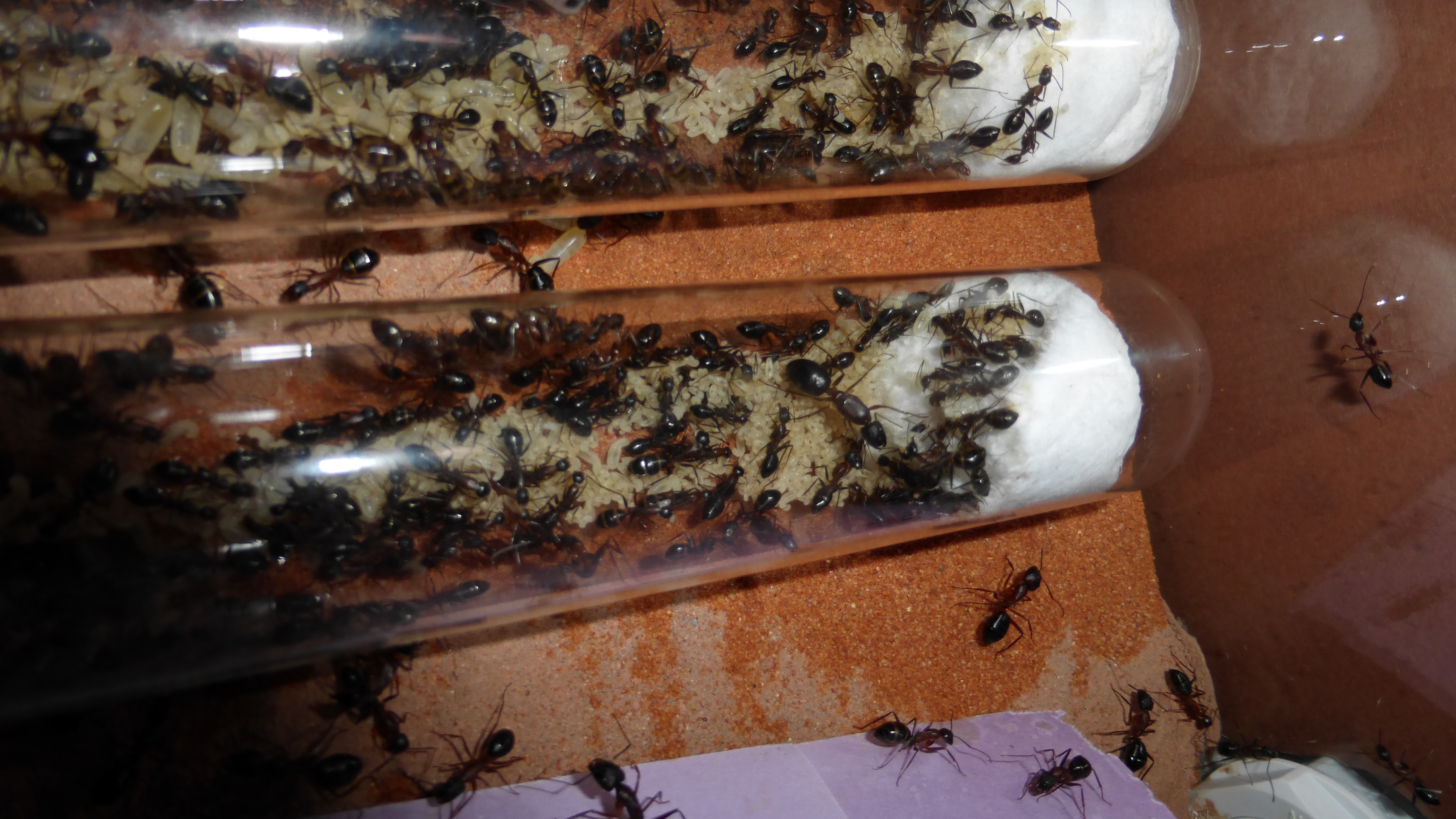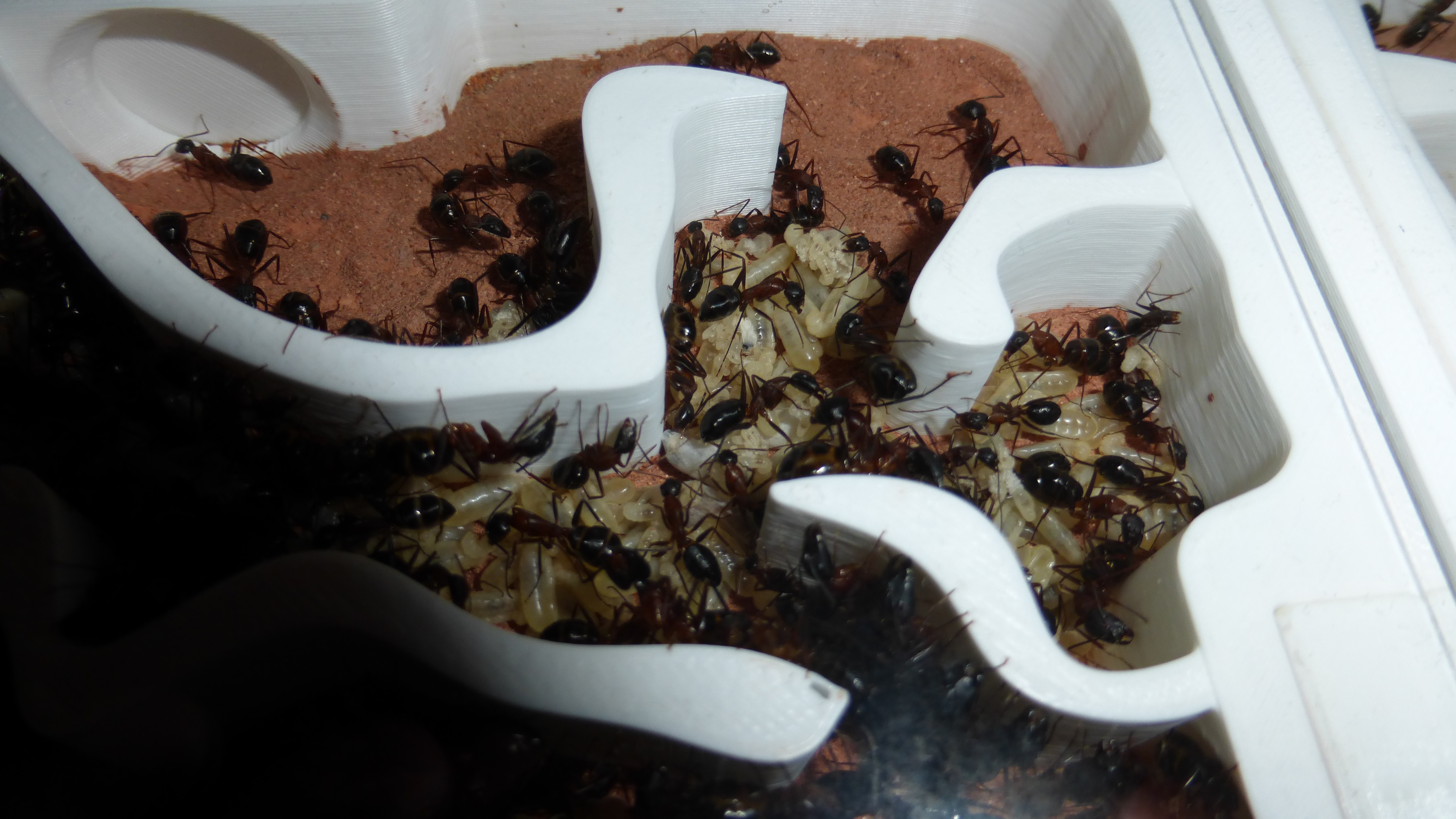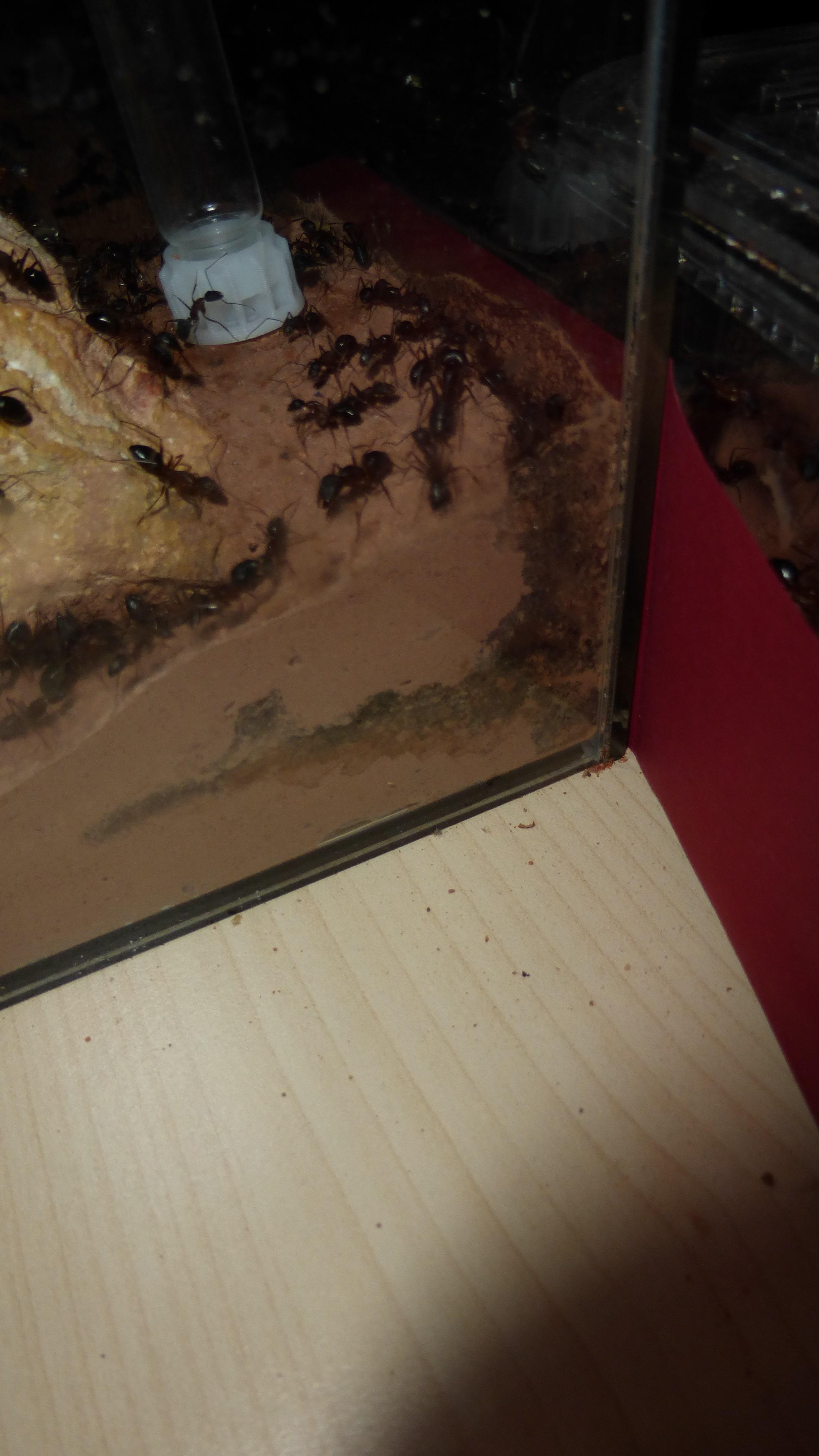 Erstaunlich viel Brut in der "Ende der Welt"-Box, wenn man bedenkt, dass ich noch nie gesehen habe wie sie Eier dorthin tragen. Bei Camponotus werden die Arbeiterinnen ja vom Eierlegen abgehalten, wenn sie regelmäßig in Kontakt mit Eiern der Königin kommen, deshalb sie die wohl da, aber keine Ahnung sie die dorthin kommen. Wahrscheinlich machen sie das irgendwann ganz spät, so um 4 Uhr nachts.