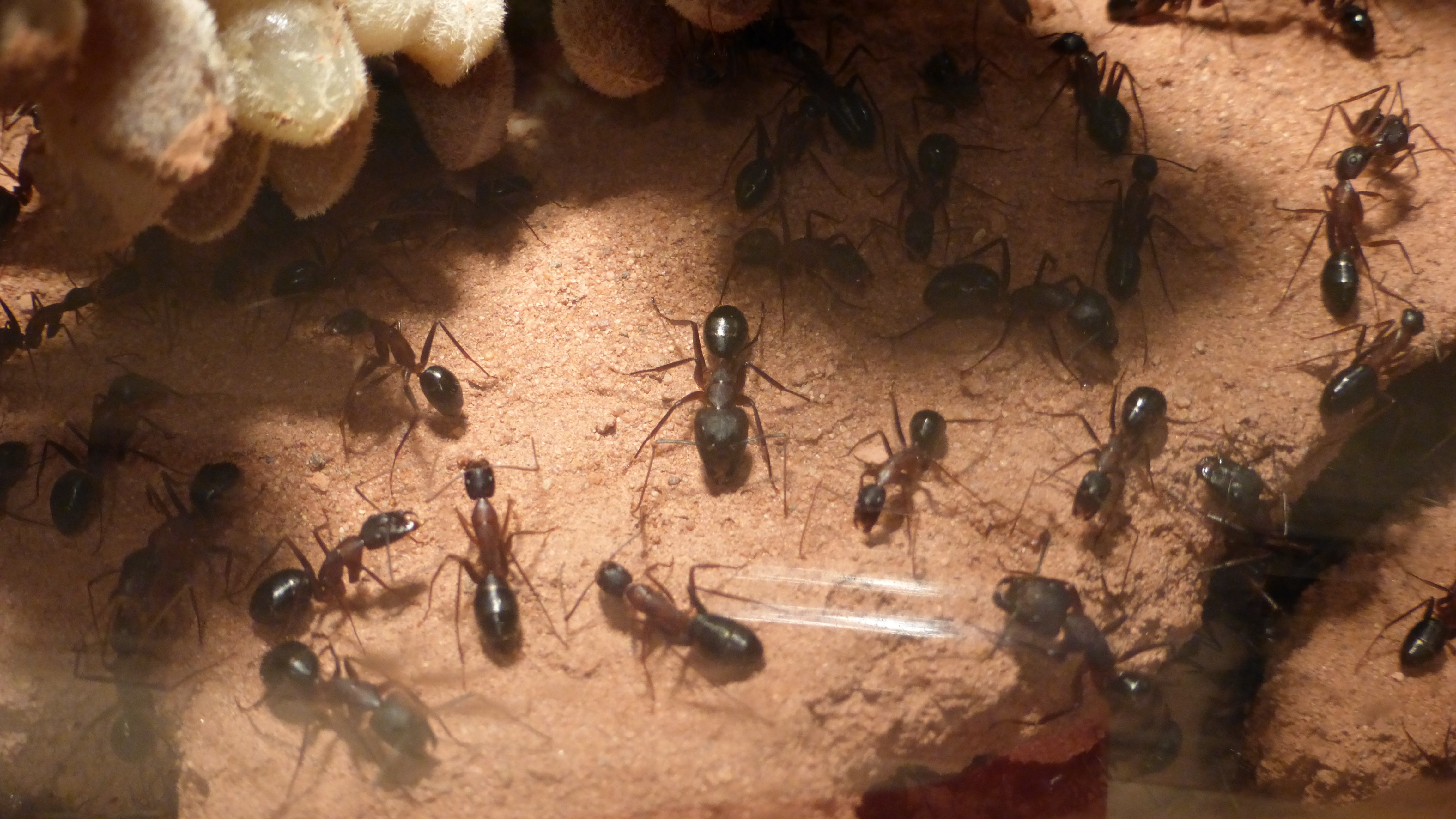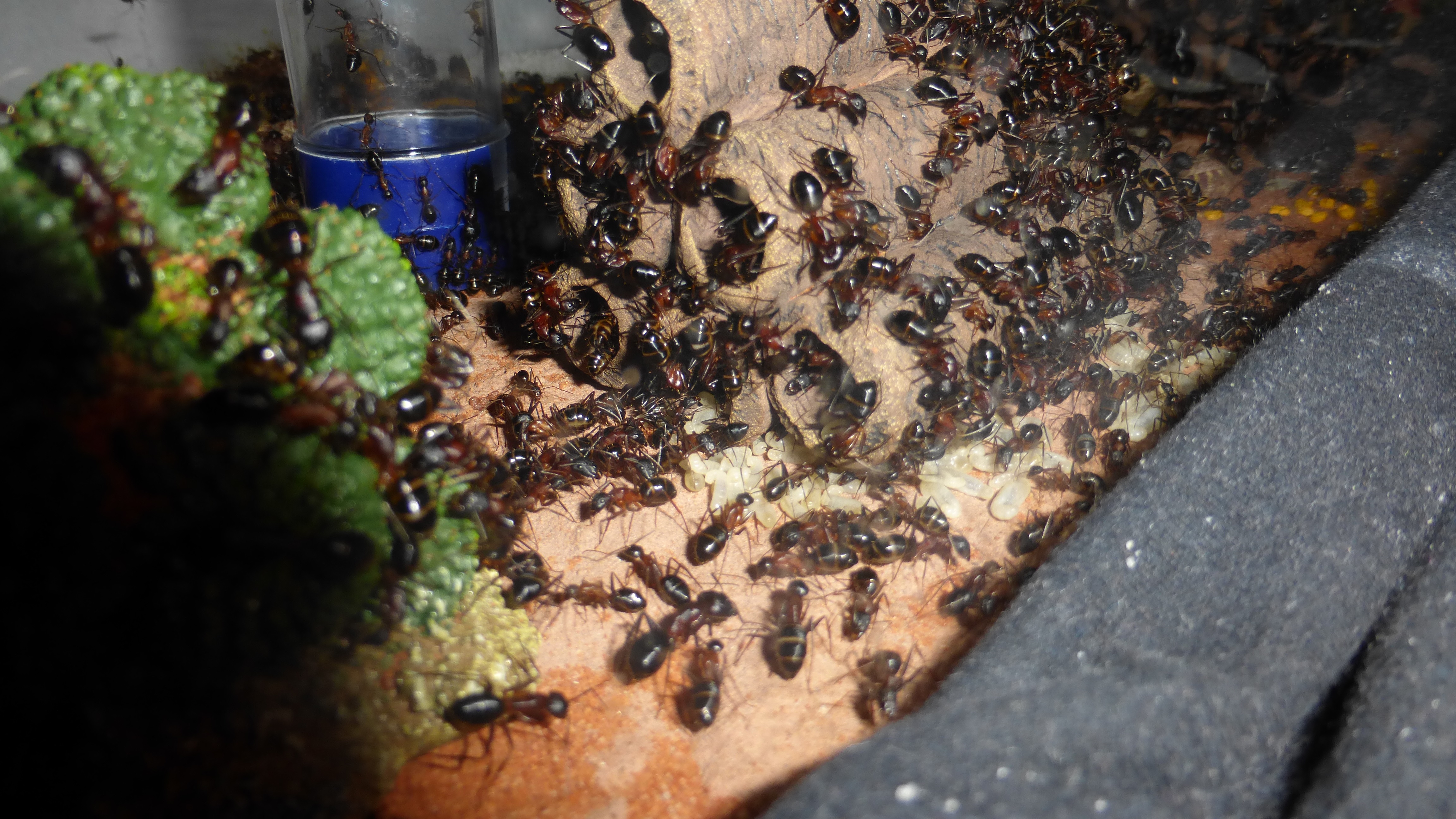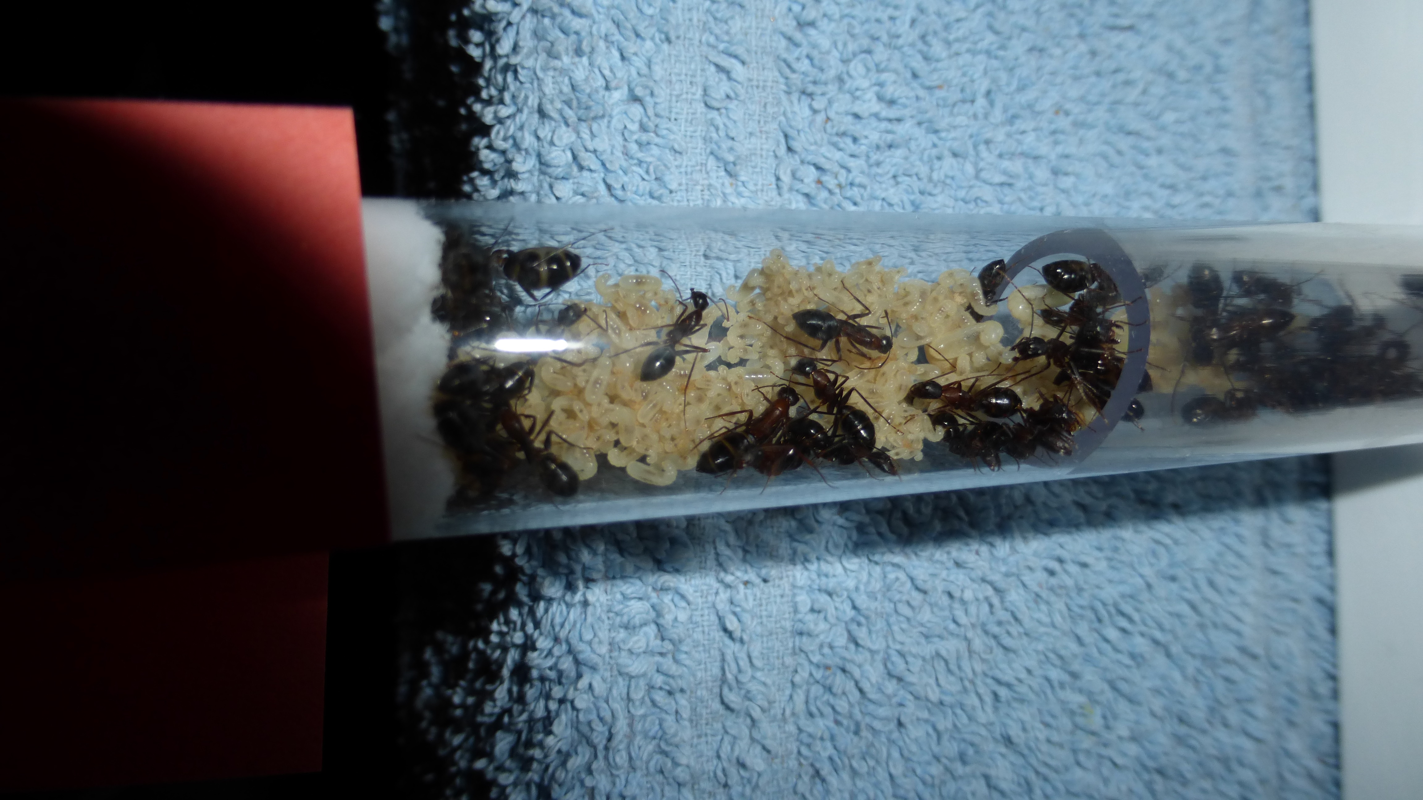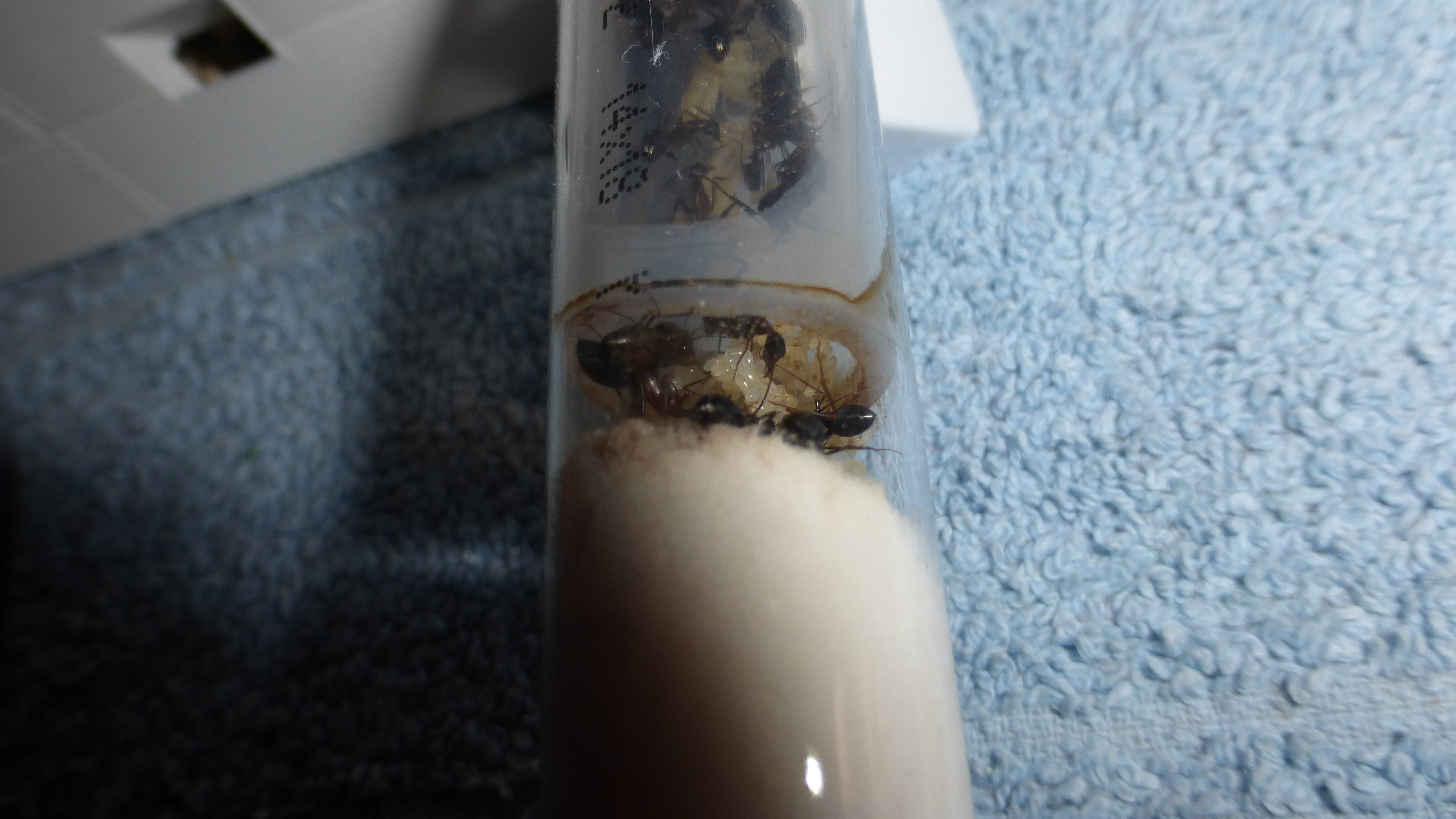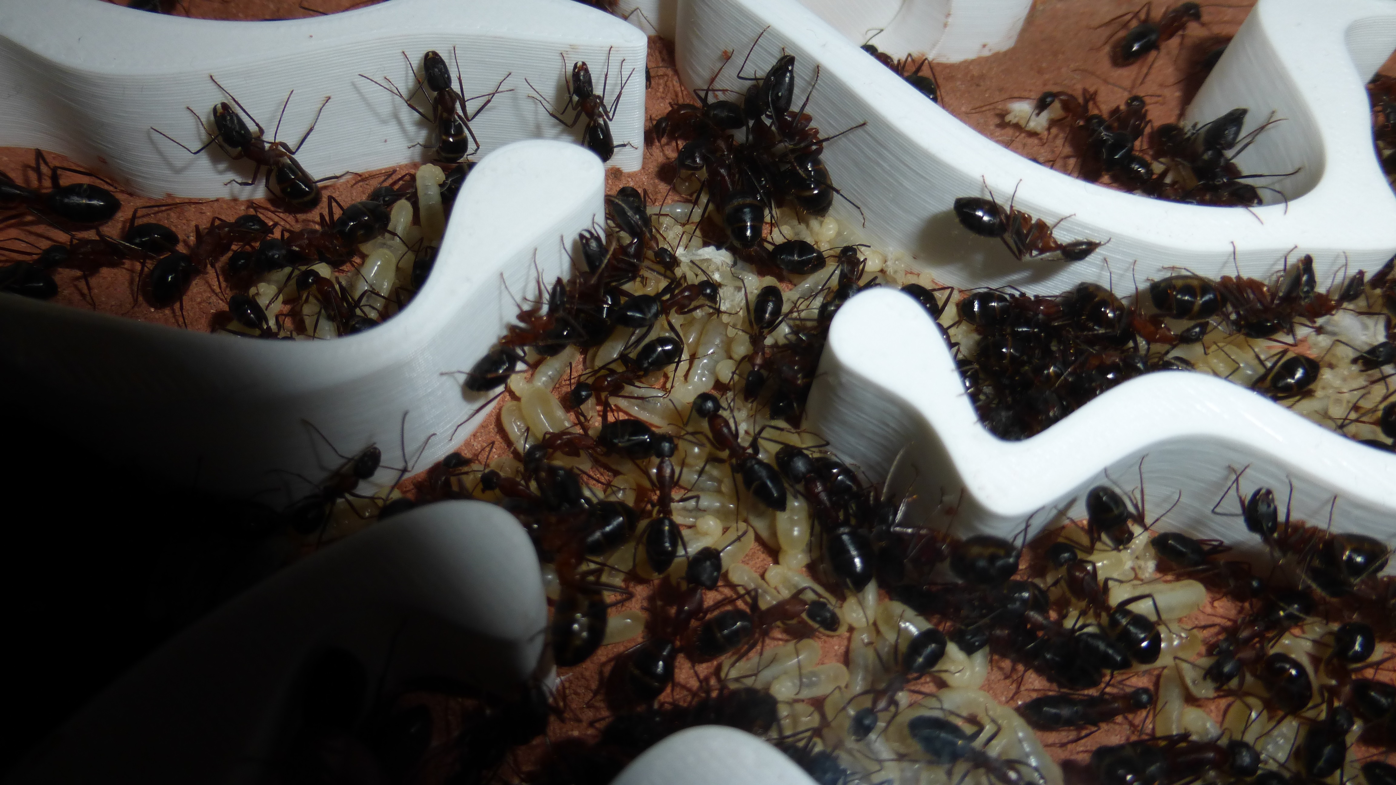 Erstaunlich viel Brut in der "Ende der Welt"-Box, wenn man bedenkt, dass ich noch nie gesehen habe wie sie Eier dorthin tragen. Bei Camponotus werden die Arbeiterinnen ja vom Eierlegen abgehalten, wenn sie regelmäßig in Kontakt mit Eiern der Königin kommen, deshalb sie die wohl da, aber keine Ahnung sie die dorthin kommen. Wahrscheinlich machen sie das irgendwann ganz spät, so um 4 Uhr nachts.