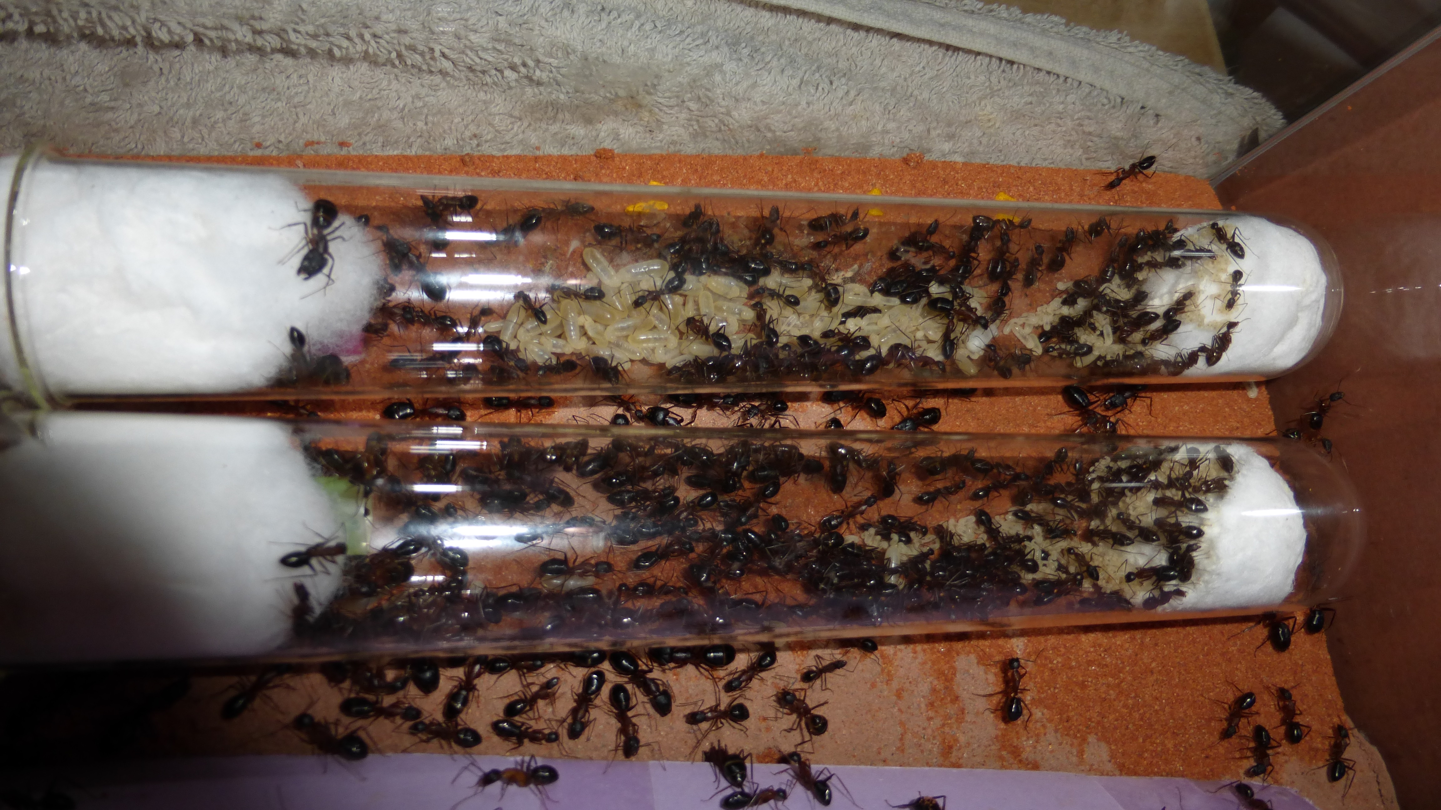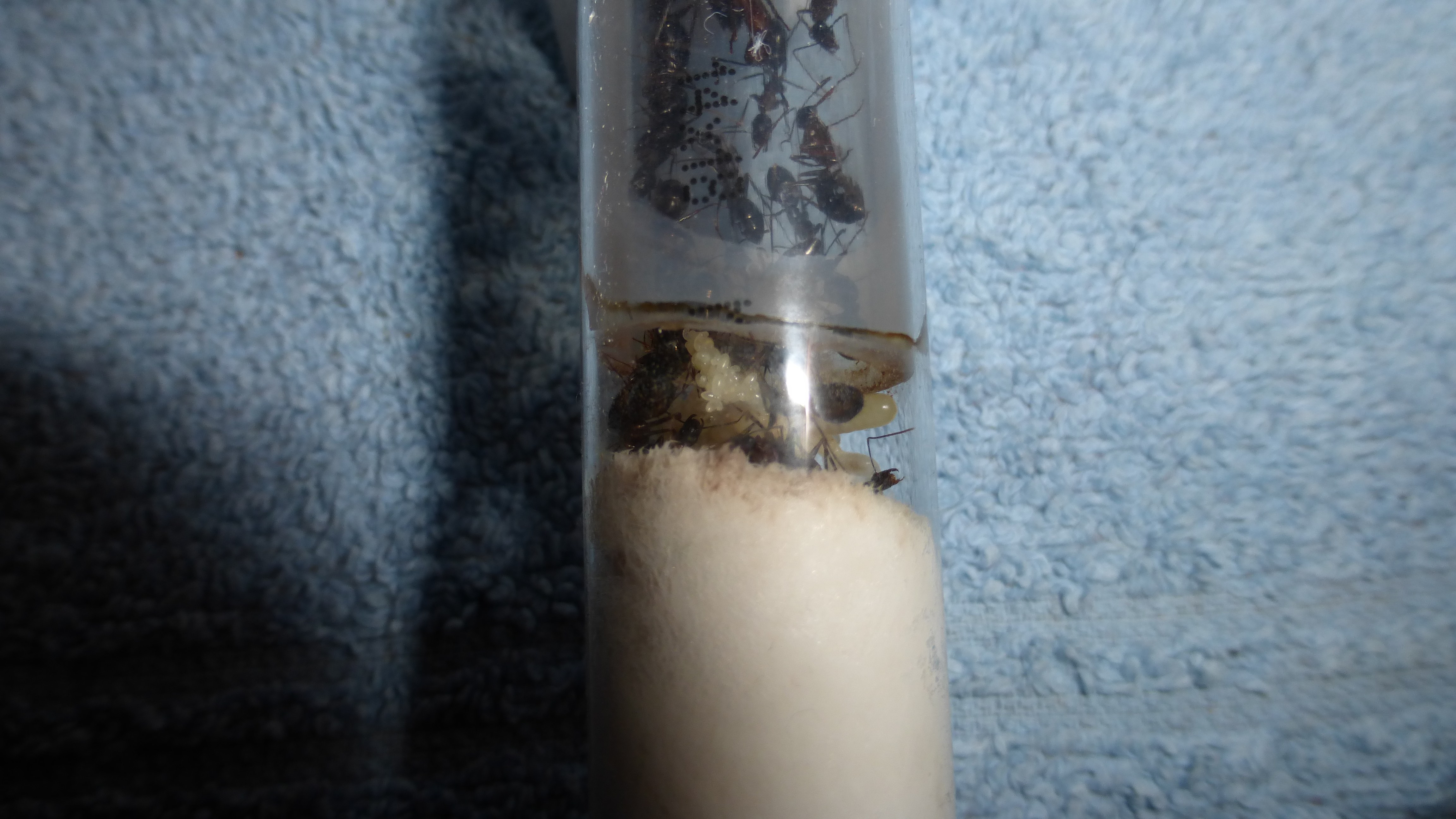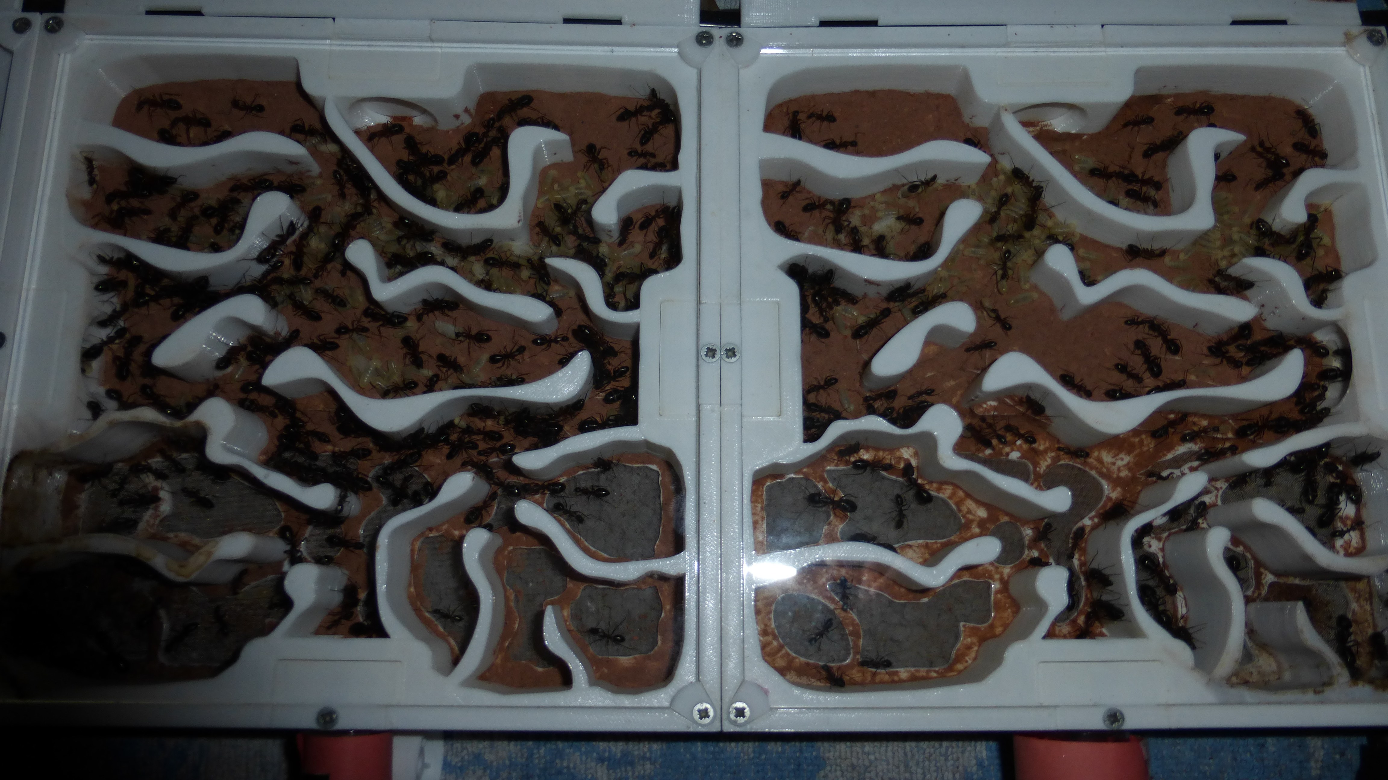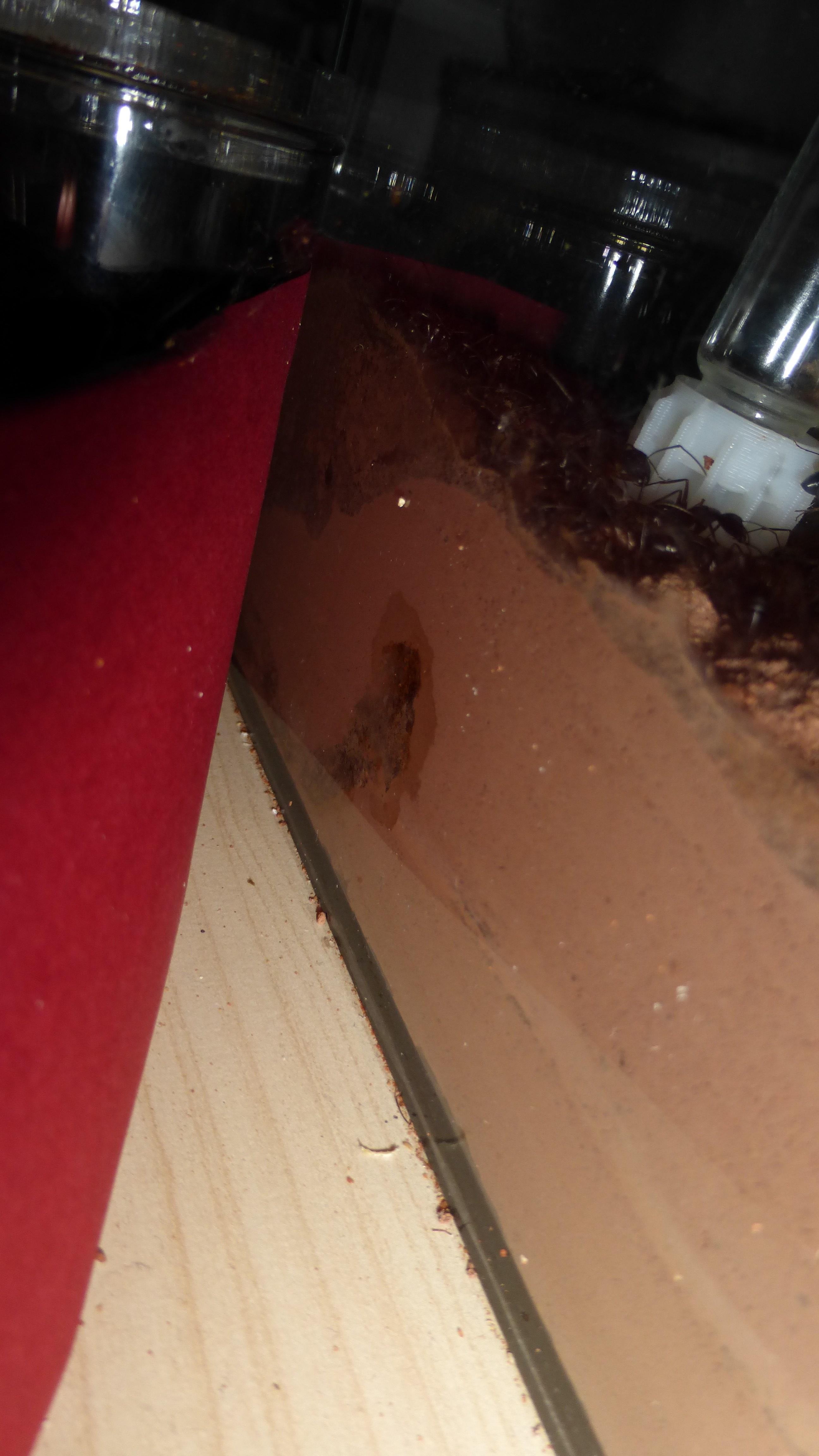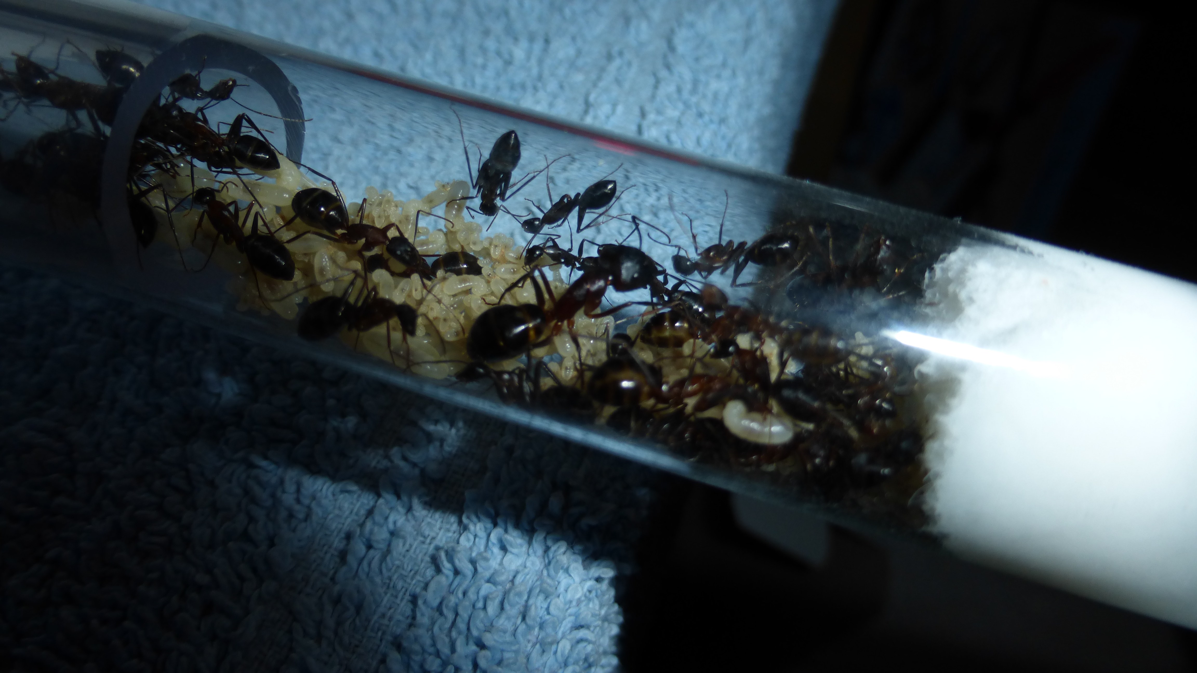 Erstaunlich viel Brut in der "Ende der Welt"-Box, wenn man bedenkt, dass ich noch nie gesehen habe wie sie Eier dorthin tragen. Bei Camponotus werden die Arbeiterinnen ja vom Eierlegen abgehalten, wenn sie regelmäßig in Kontakt mit Eiern der Königin kommen, deshalb sie die wohl da, aber keine Ahnung sie die dorthin kommen. Wahrscheinlich machen sie das irgendwann ganz spät, so um 4 Uhr nachts.