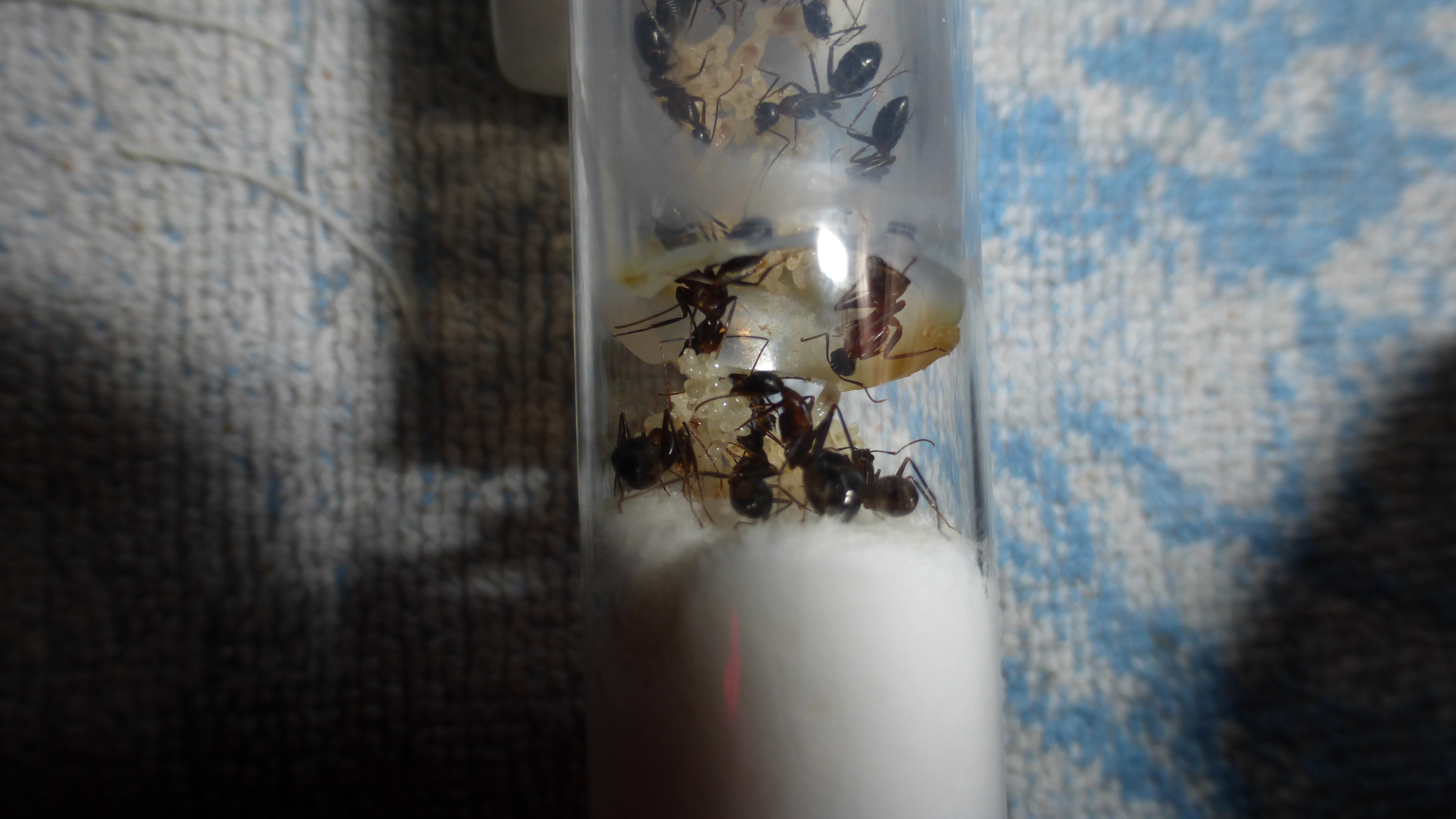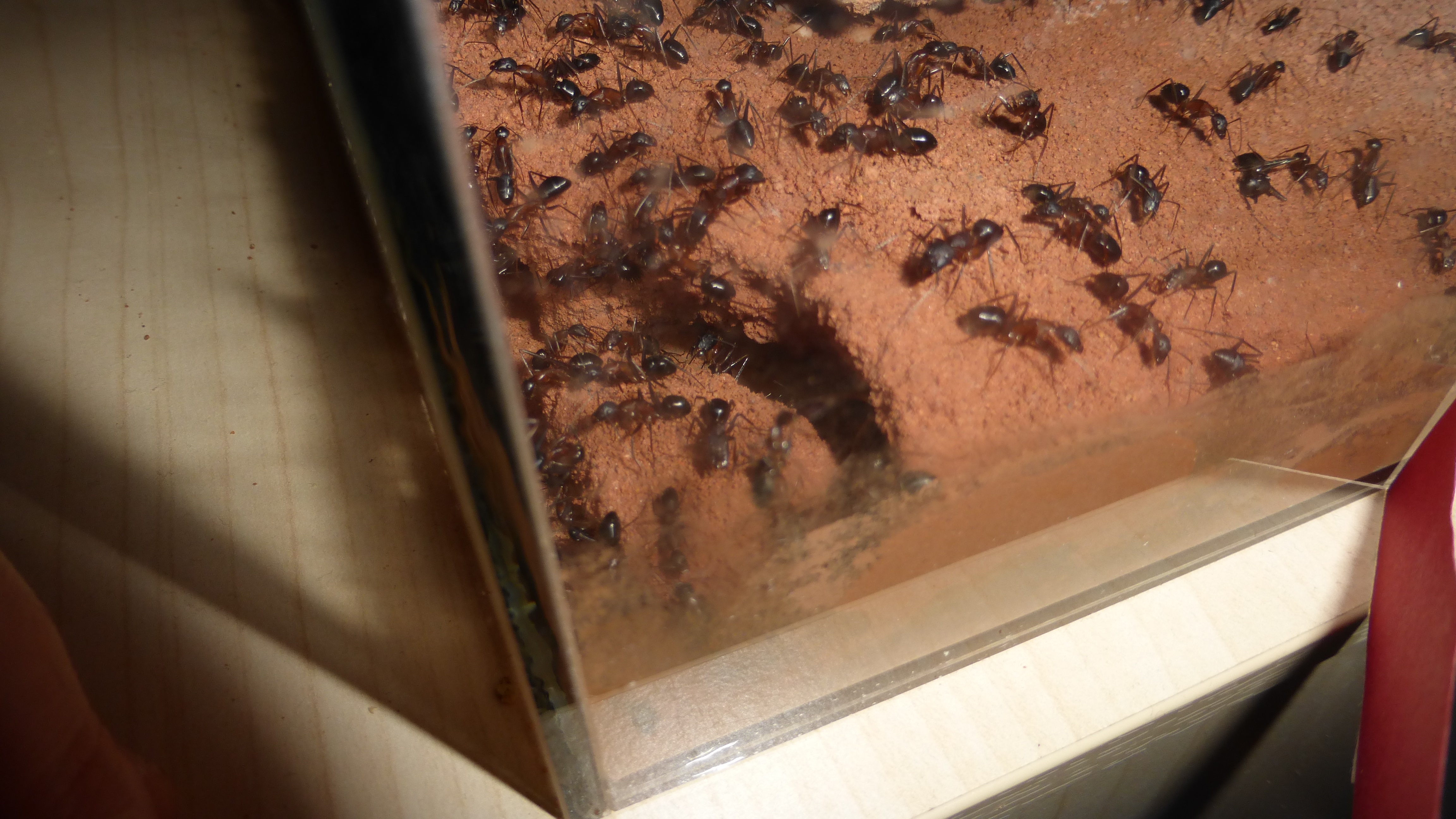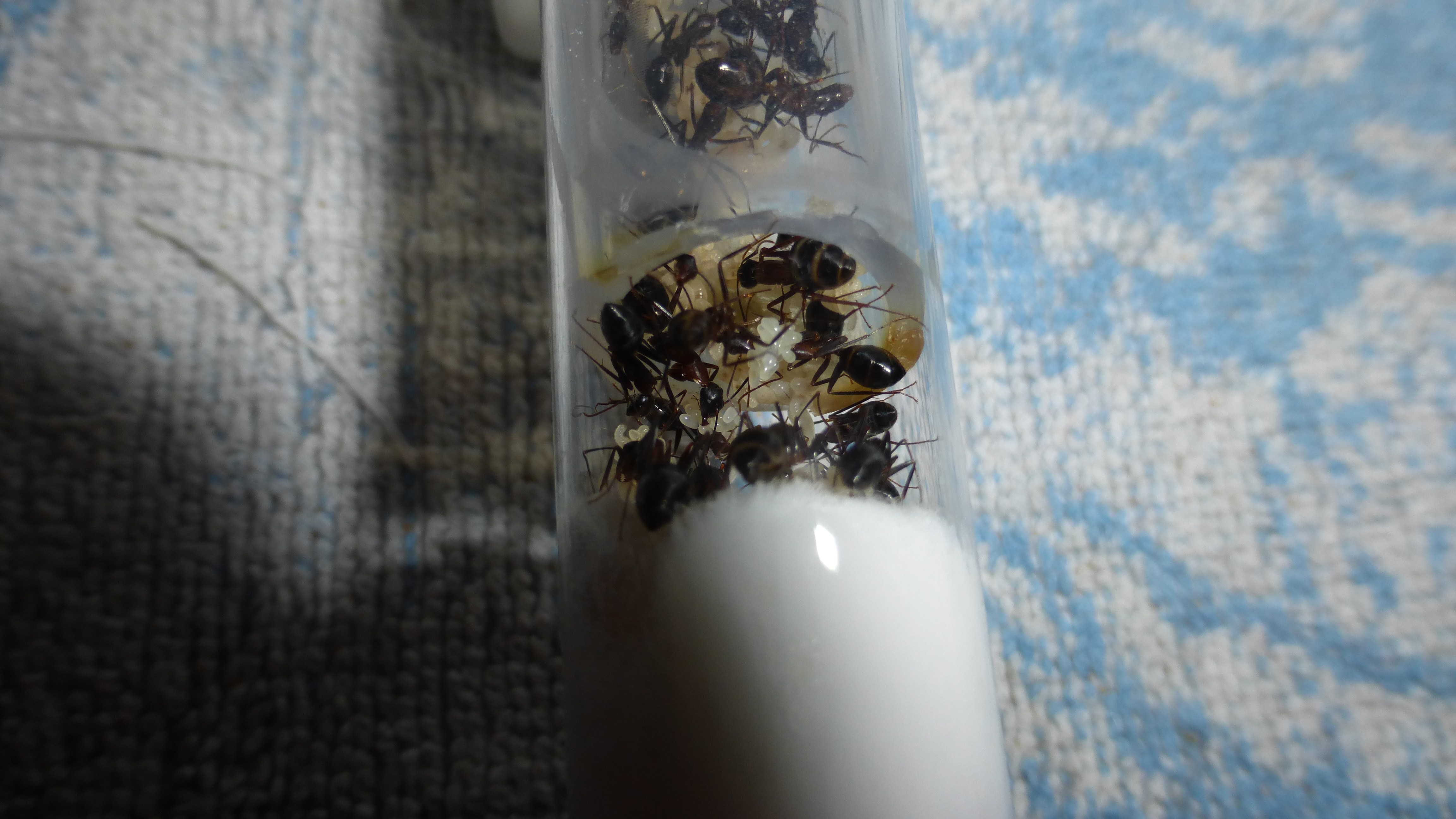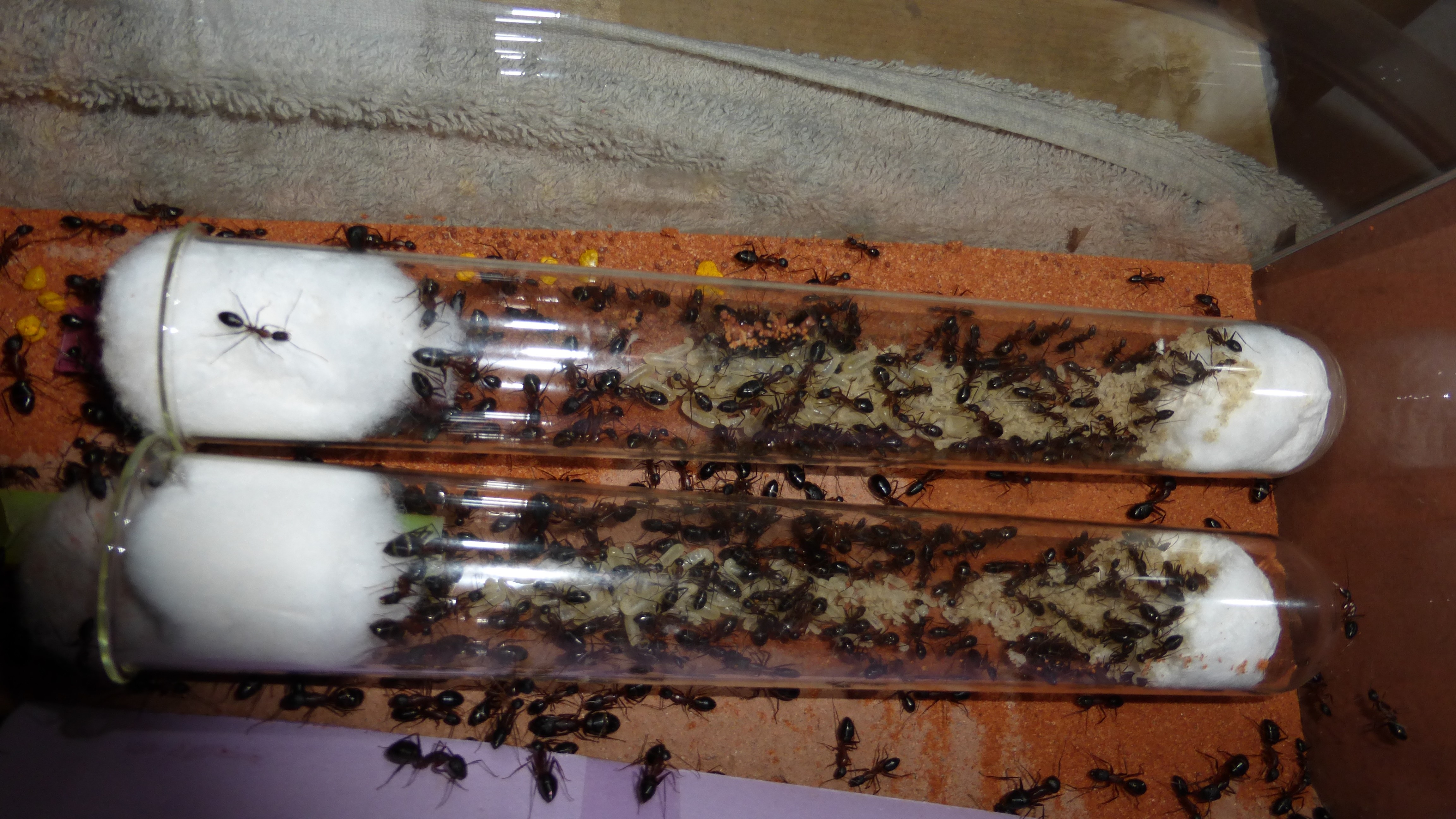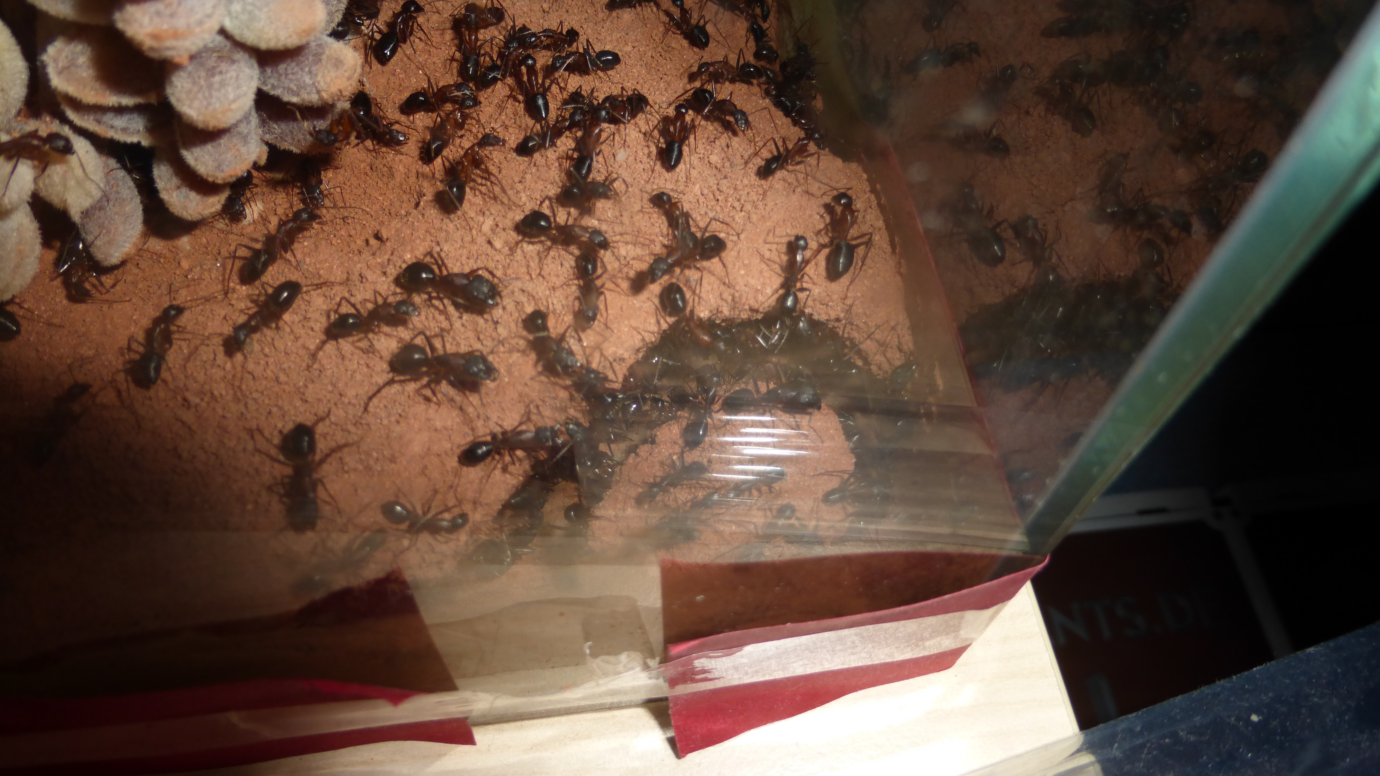 Erstaunlich viel Brut in der "Ende der Welt"-Box, wenn man bedenkt, dass ich noch nie gesehen habe wie sie Eier dorthin tragen. Bei Camponotus werden die Arbeiterinnen ja vom Eierlegen abgehalten, wenn sie regelmäßig in Kontakt mit Eiern der Königin kommen, deshalb sie die wohl da, aber keine Ahnung sie die dorthin kommen. Wahrscheinlich machen sie das irgendwann ganz spät, so um 4 Uhr nachts.