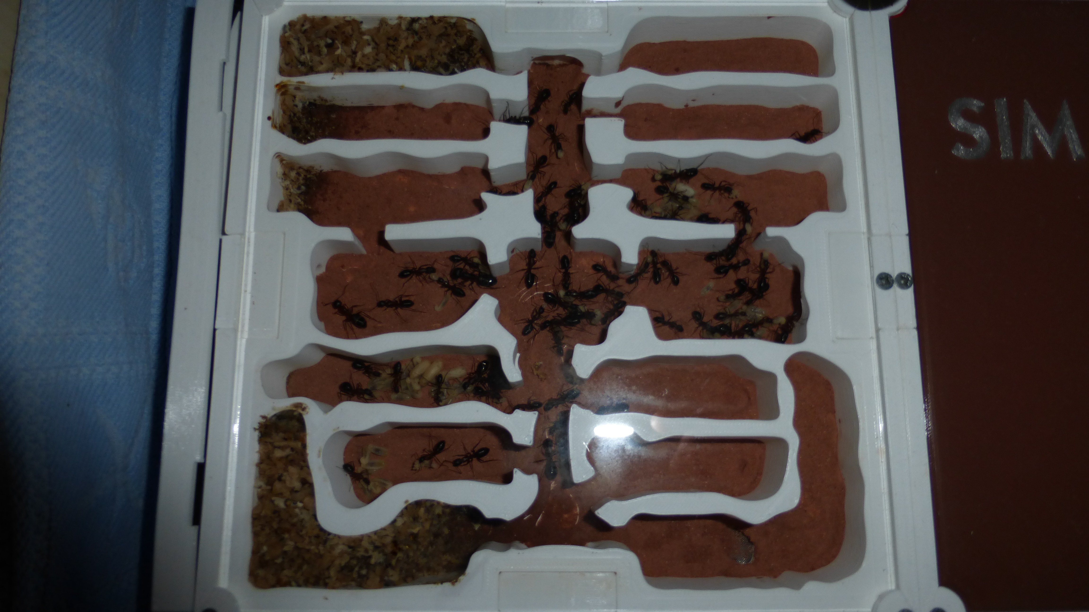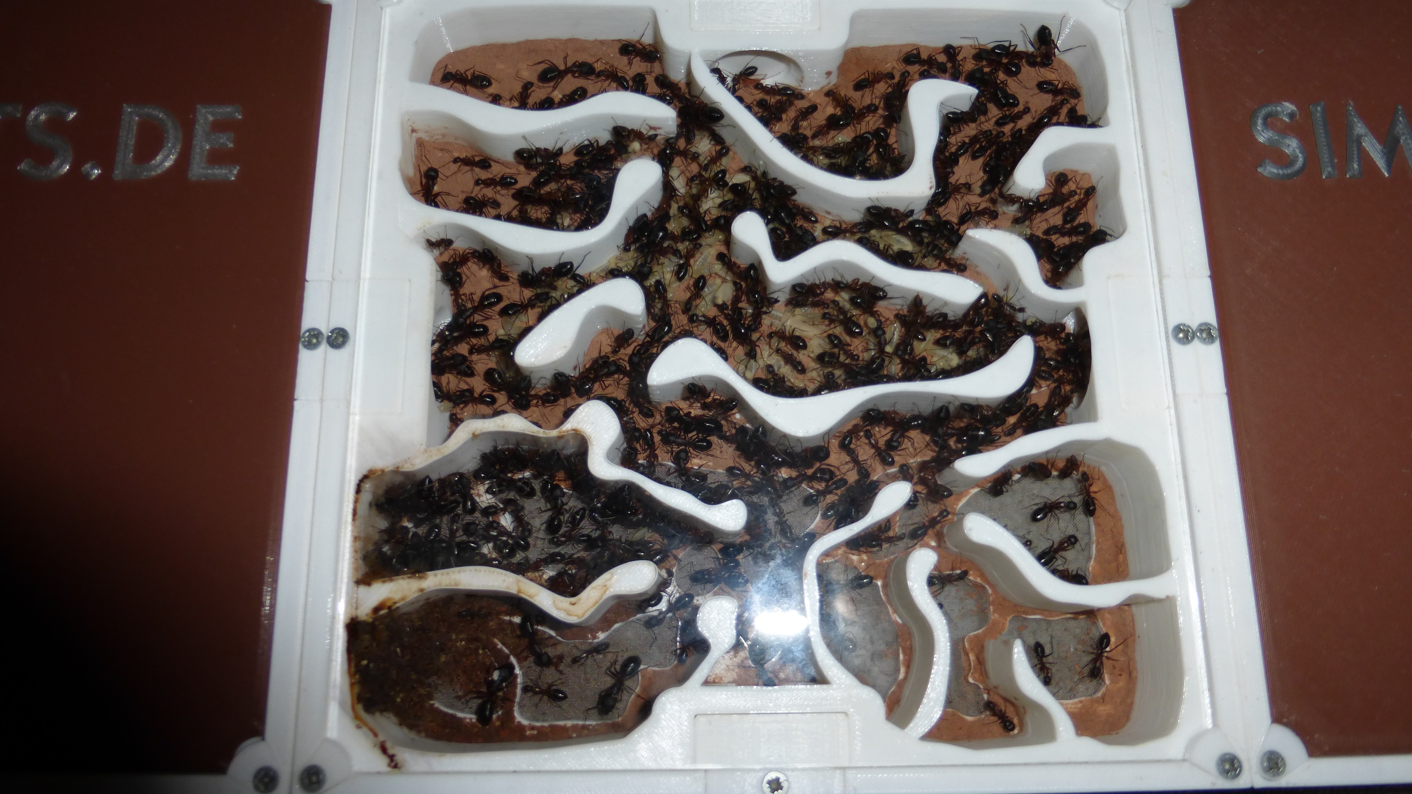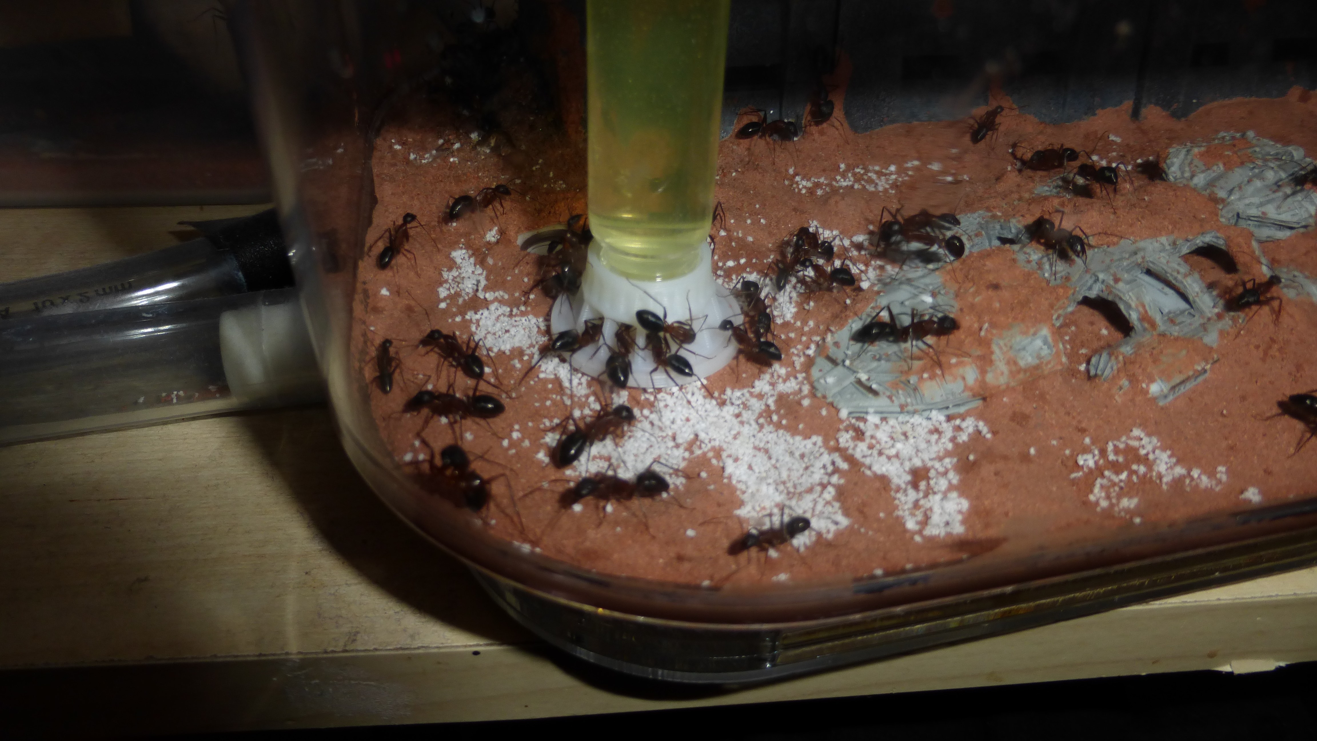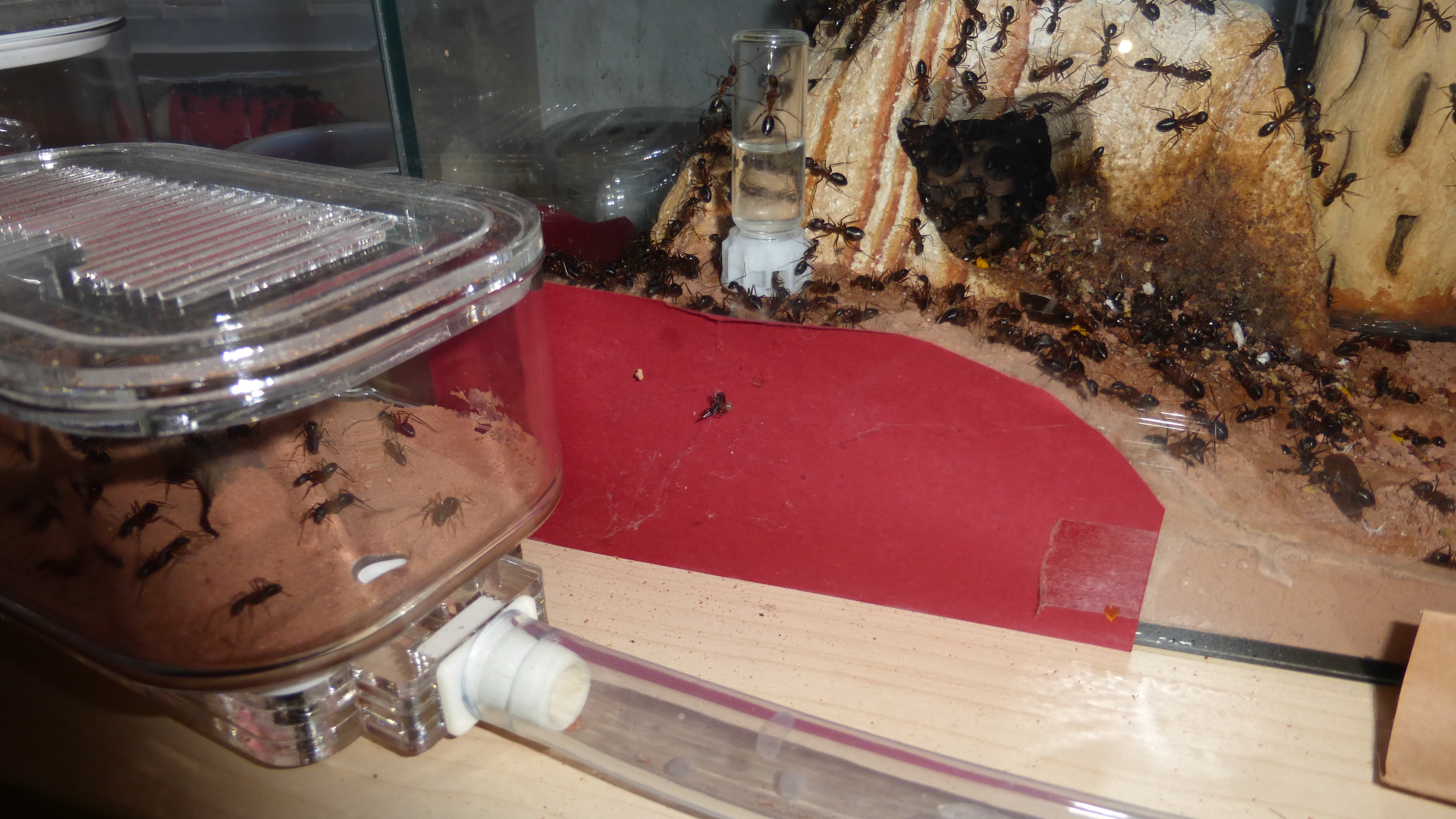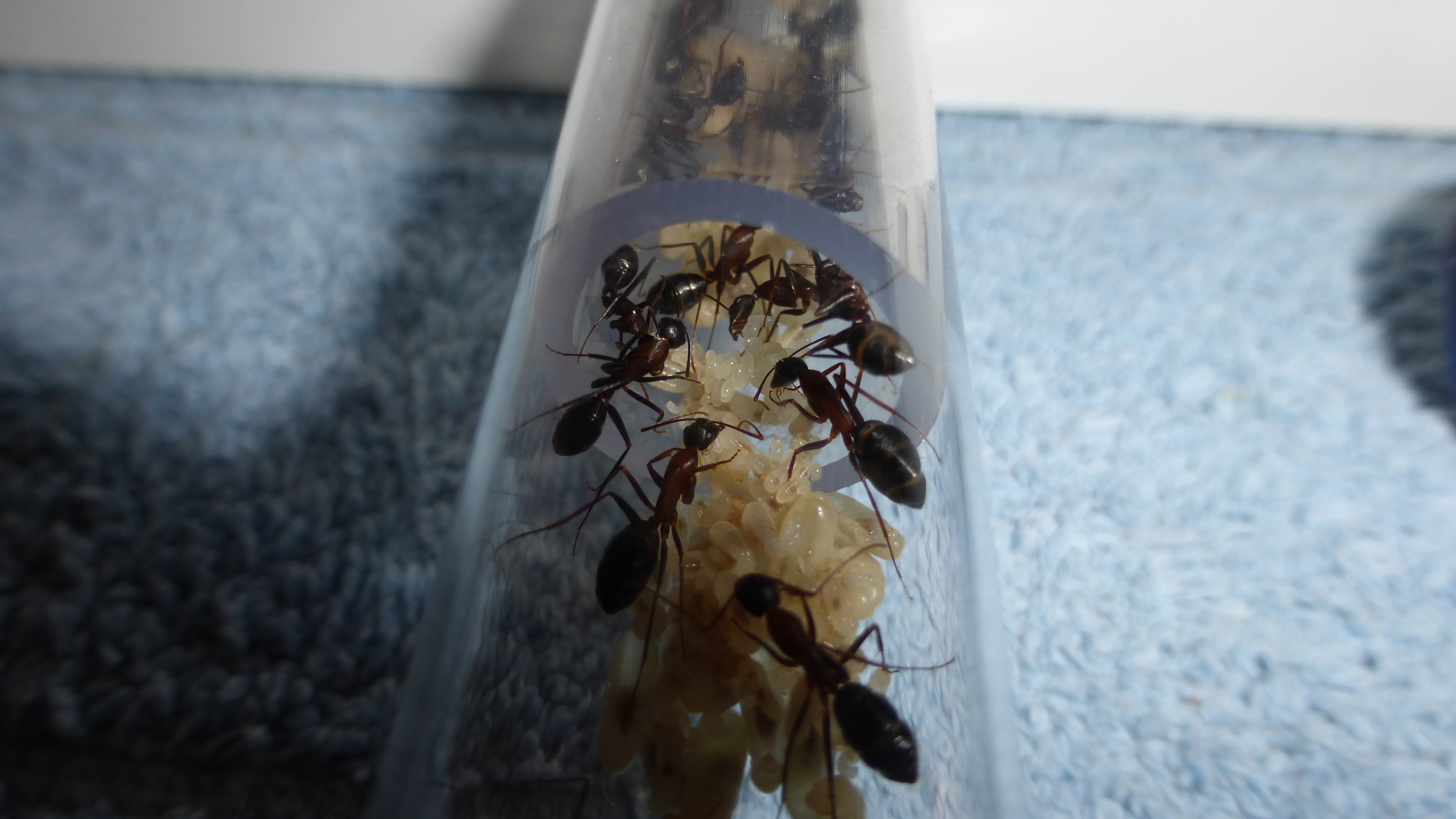 Erstaunlich viel Brut in der "Ende der Welt"-Box, wenn man bedenkt, dass ich noch nie gesehen habe wie sie Eier dorthin tragen. Bei Camponotus werden die Arbeiterinnen ja vom Eierlegen abgehalten, wenn sie regelmäßig in Kontakt mit Eiern der Königin kommen, deshalb sie die wohl da, aber keine Ahnung sie die dorthin kommen. Wahrscheinlich machen sie das irgendwann ganz spät, so um 4 Uhr nachts.