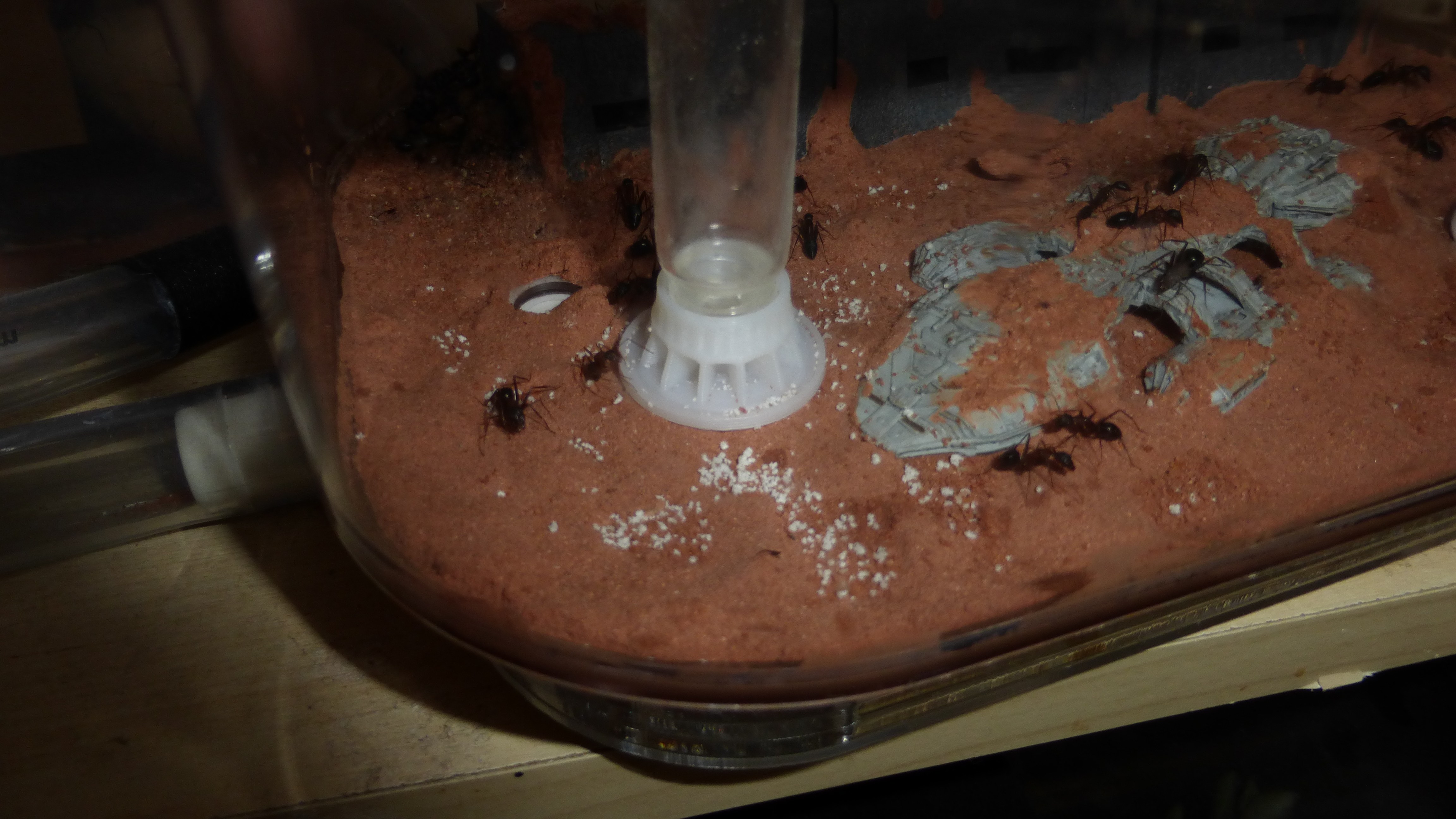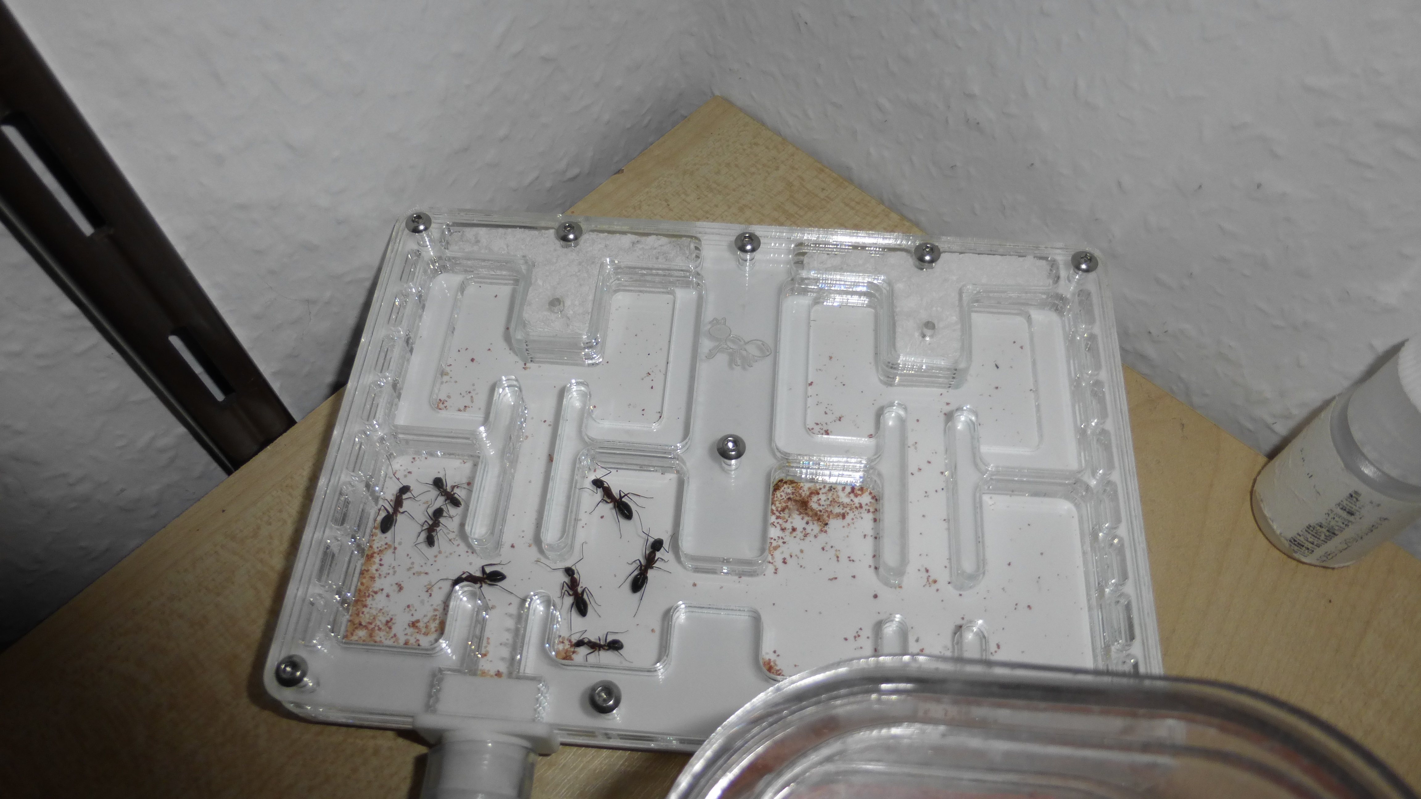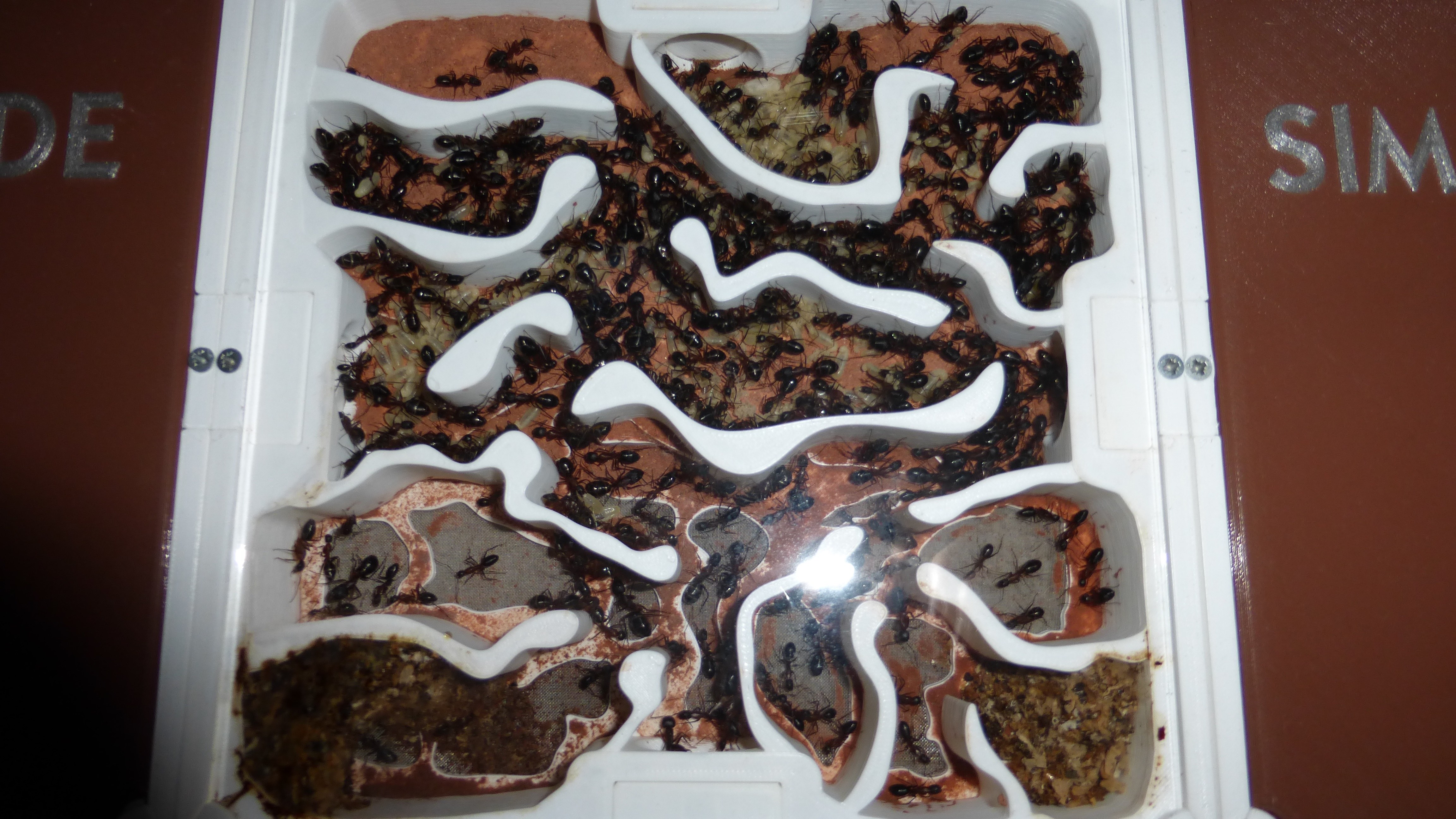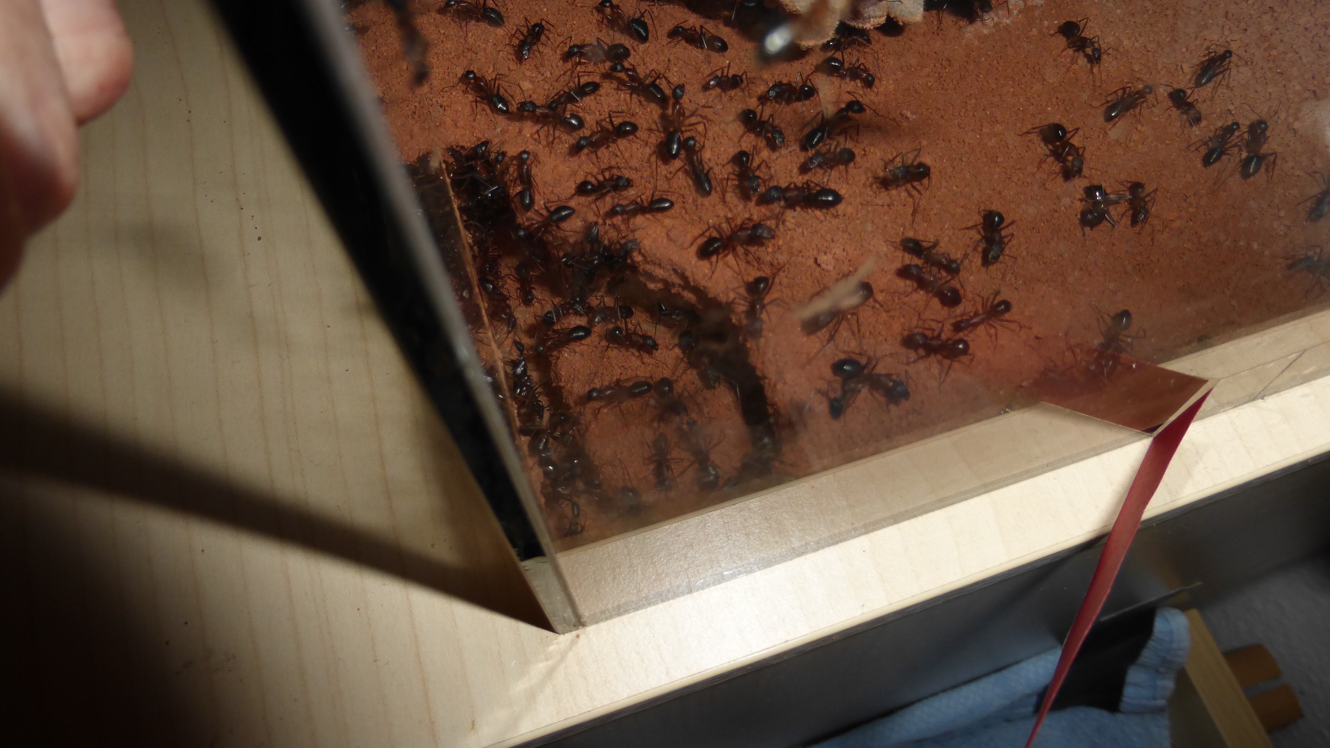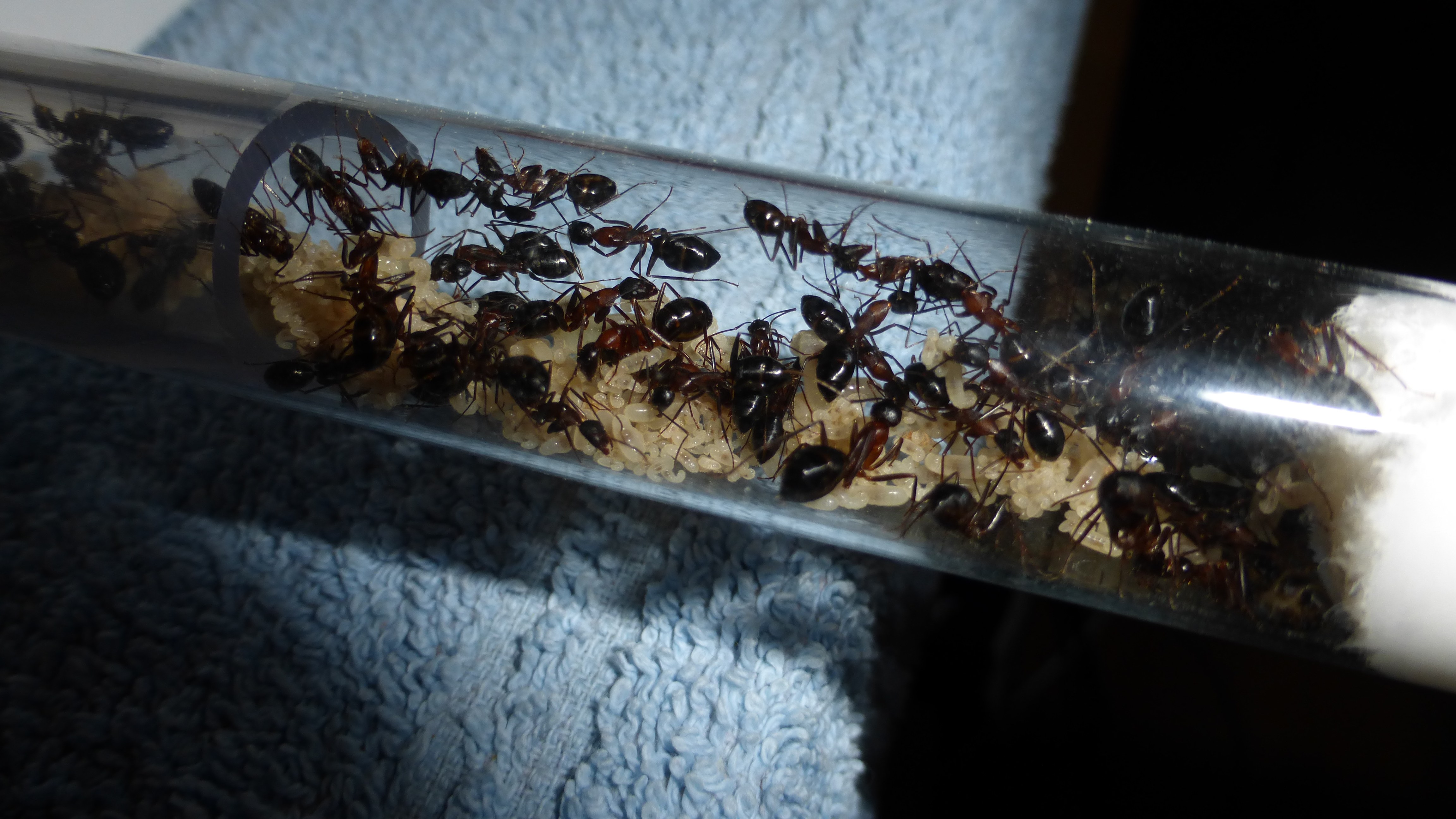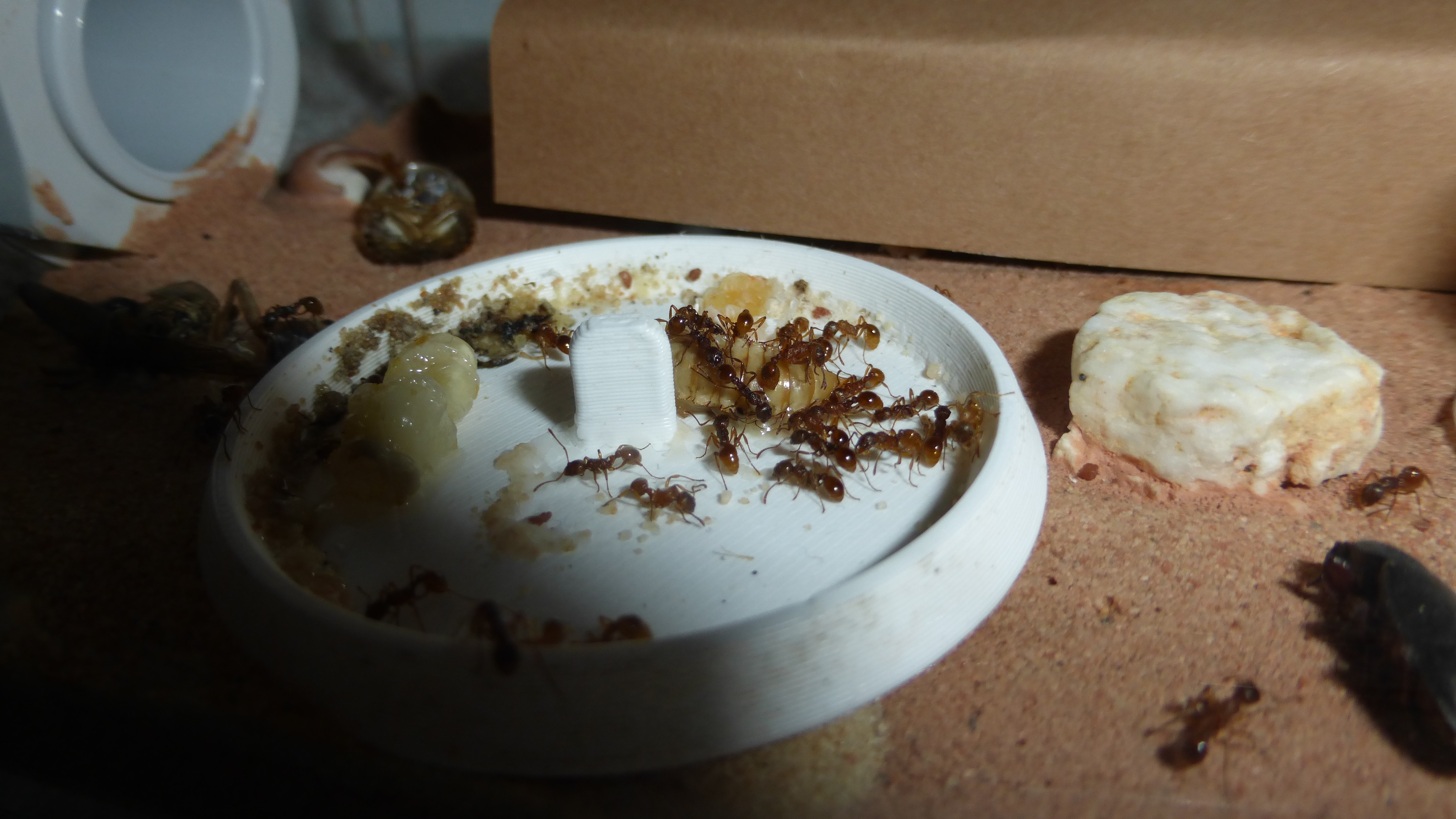 Erstaunlich viel Brut in der "Ende der Welt"-Box, wenn man bedenkt, dass ich noch nie gesehen habe wie sie Eier dorthin tragen. Bei Camponotus werden die Arbeiterinnen ja vom Eierlegen abgehalten, wenn sie regelmäßig in Kontakt mit Eiern der Königin kommen, deshalb sie die wohl da, aber keine Ahnung sie die dorthin kommen. Wahrscheinlich machen sie das irgendwann ganz spät, so um 4 Uhr nachts.