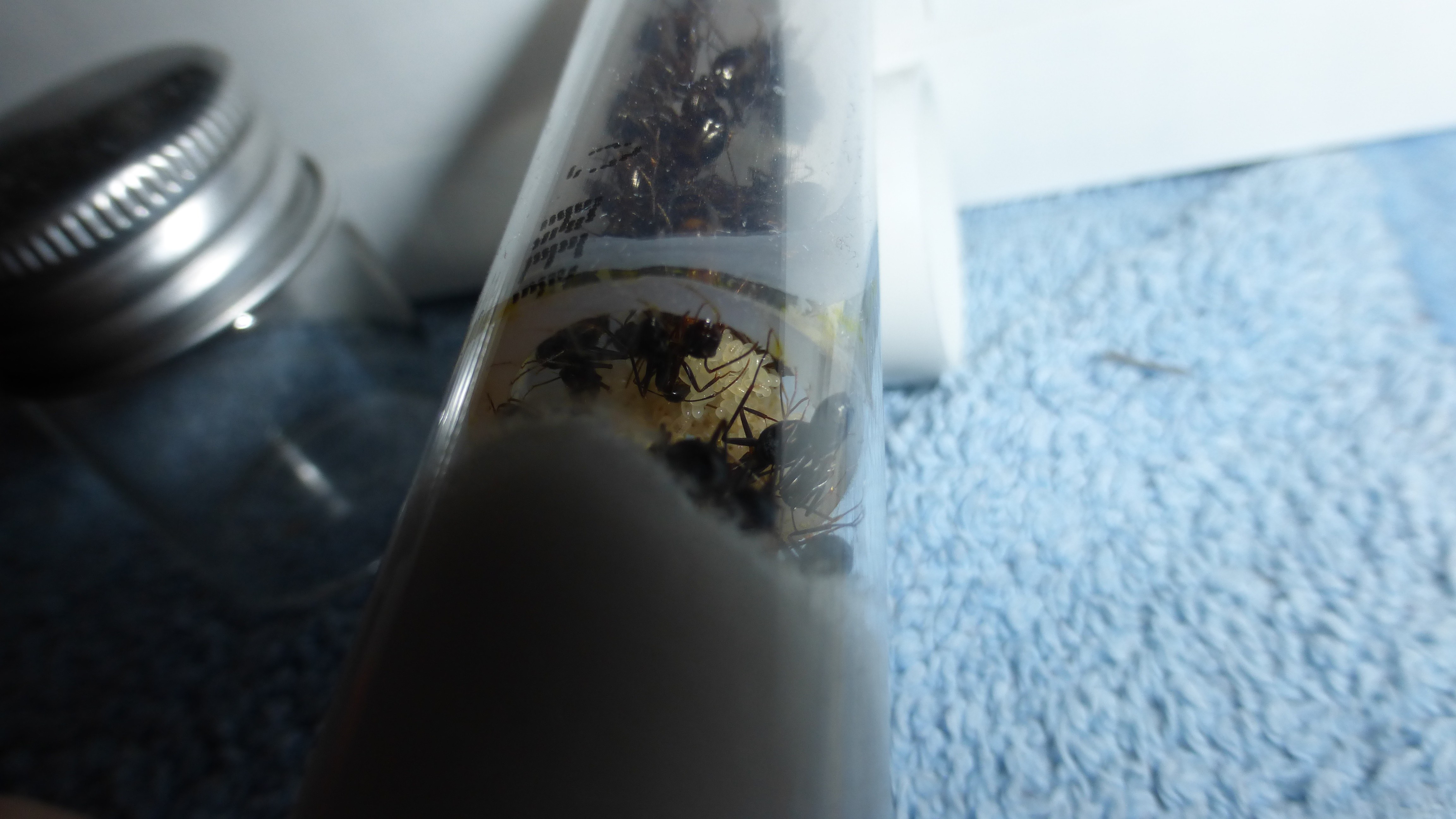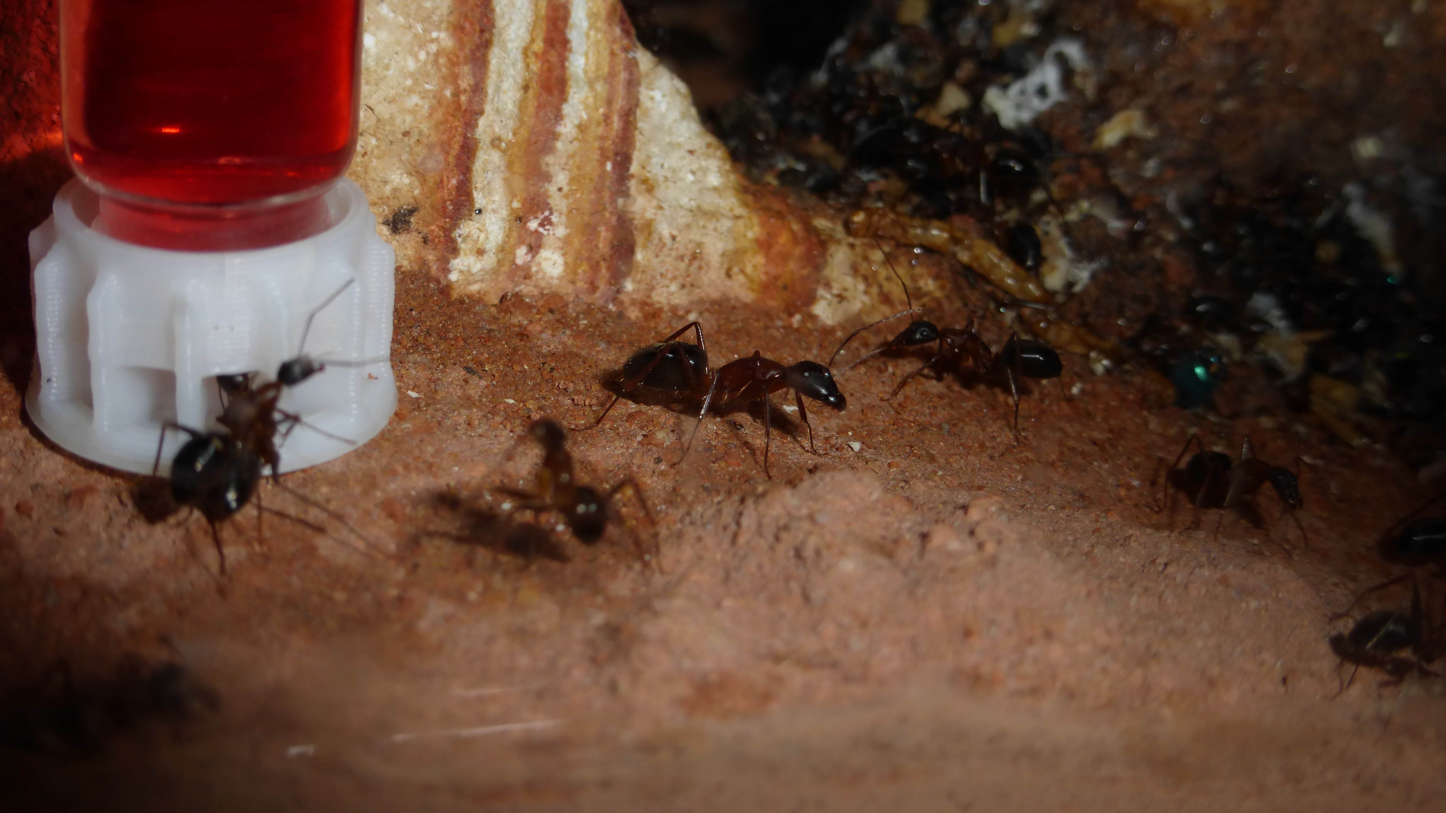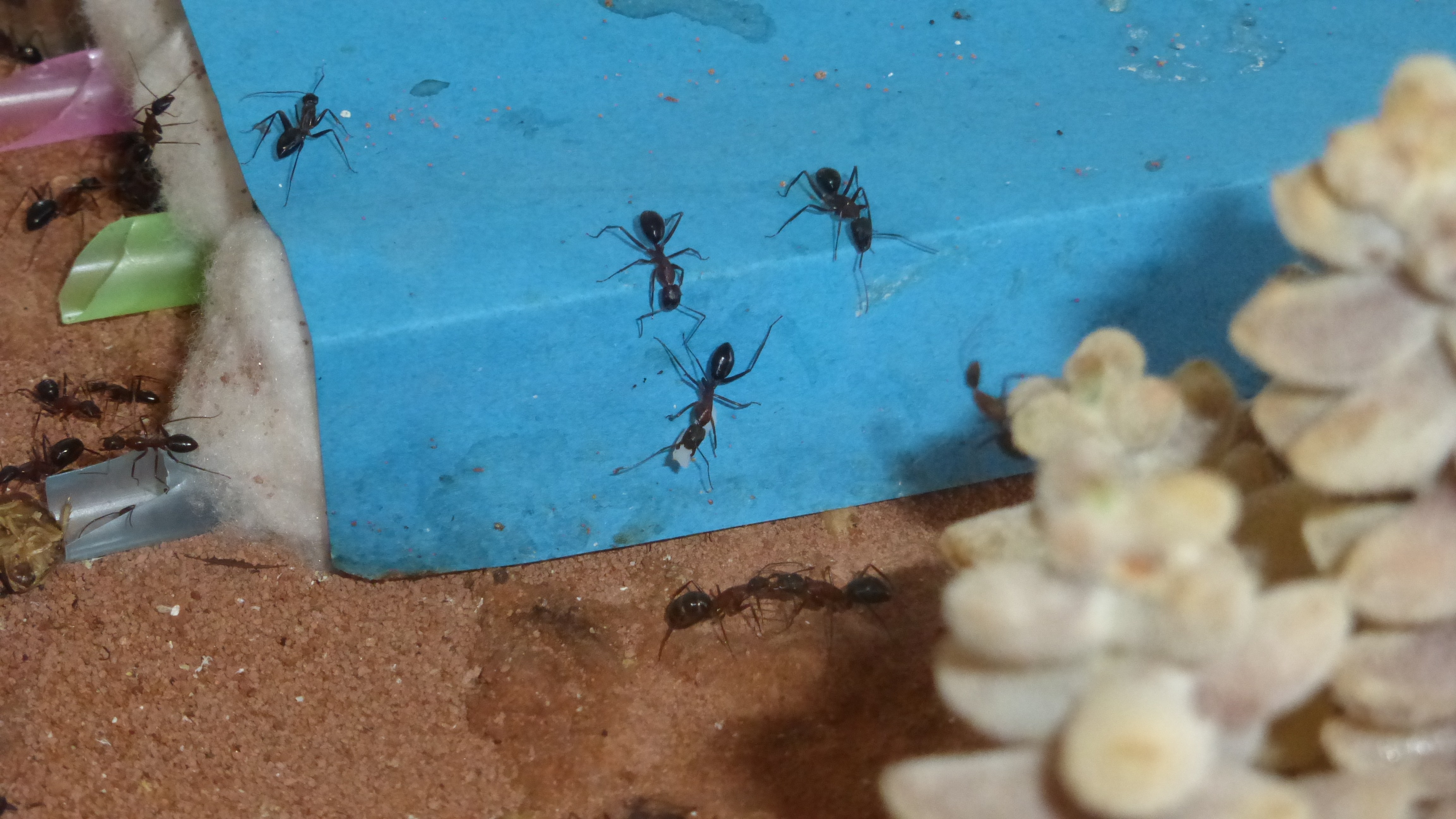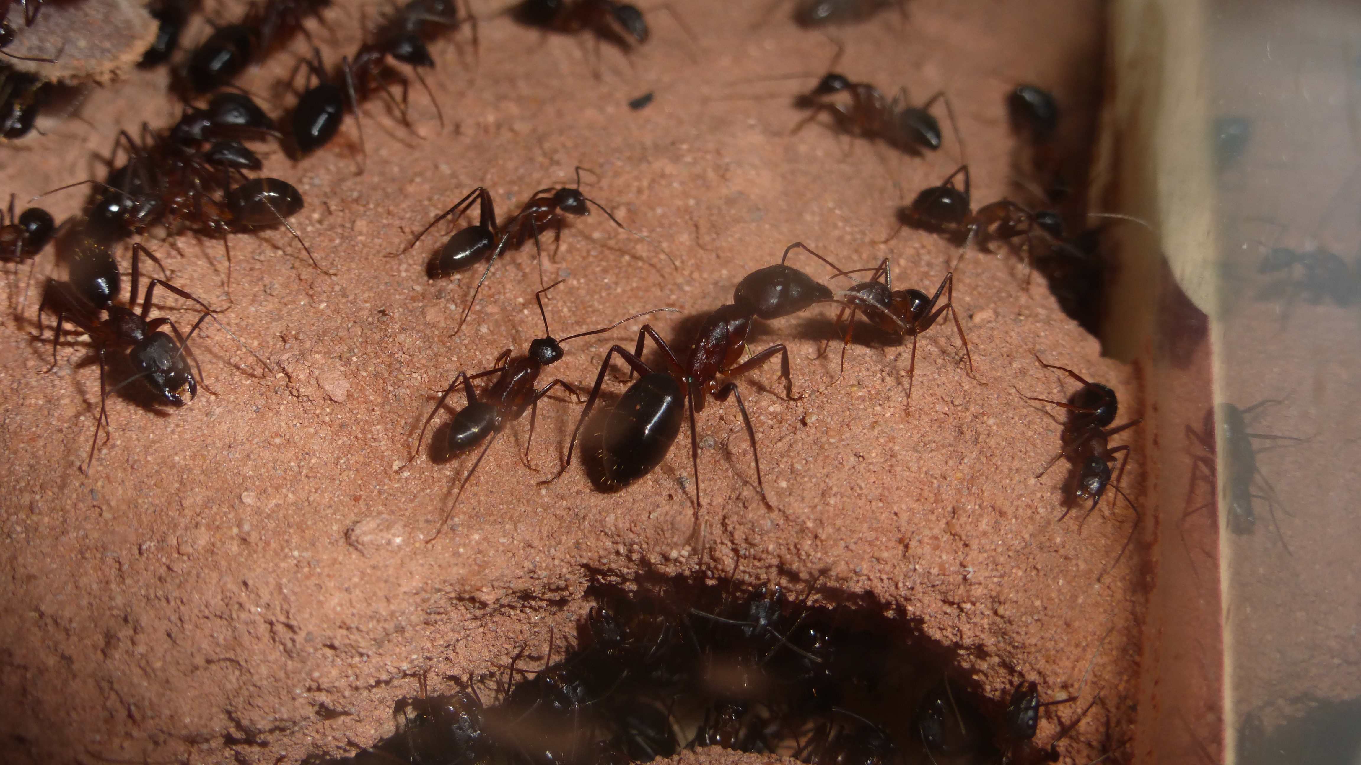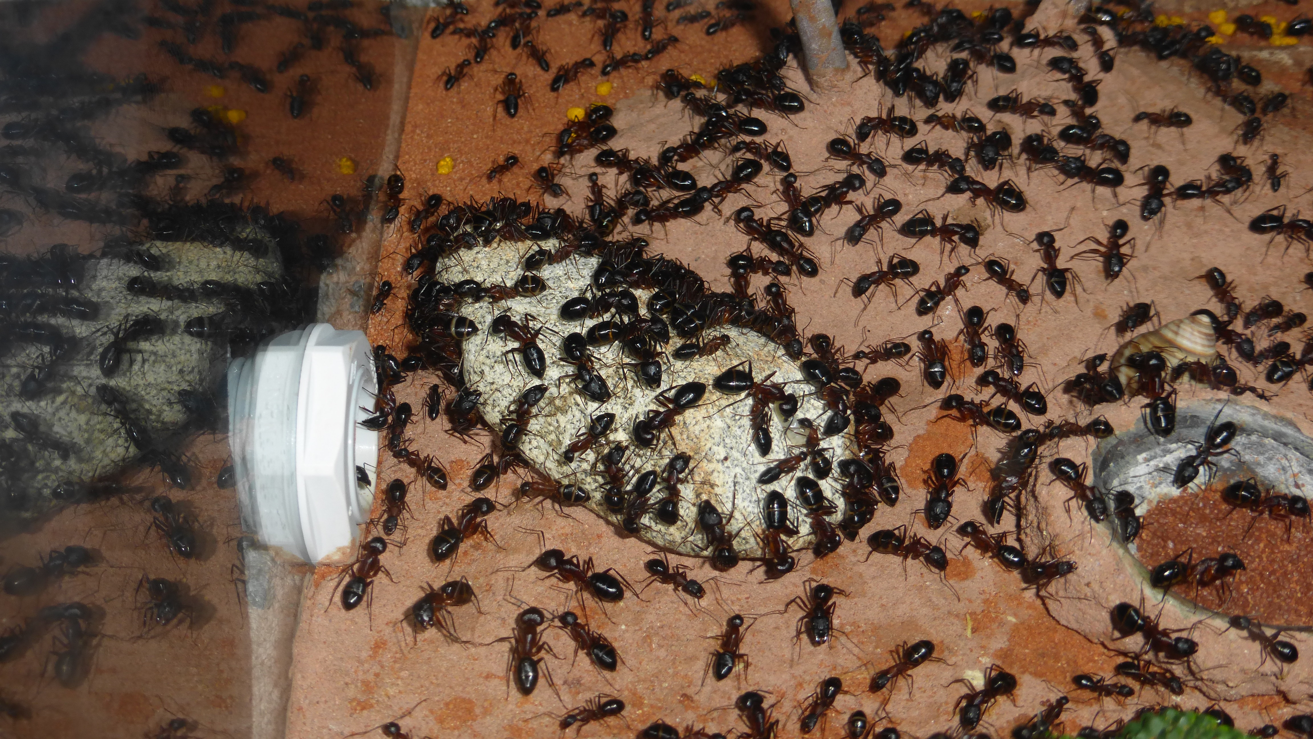Erstaunlich viel Brut in der "Ende der Welt"-Box, wenn man bedenkt, dass ich noch nie gesehen habe wie sie Eier dorthin tragen. Bei Camponotus werden die Arbeiterinnen ja vom Eierlegen abgehalten, wenn sie regelmäßig in Kontakt mit Eiern der Königin kommen, deshalb sie die wohl da, aber keine Ahnung sie die dorthin kommen. Wahrscheinlich machen sie das irgendwann ganz spät, so um 4 Uhr nachts.