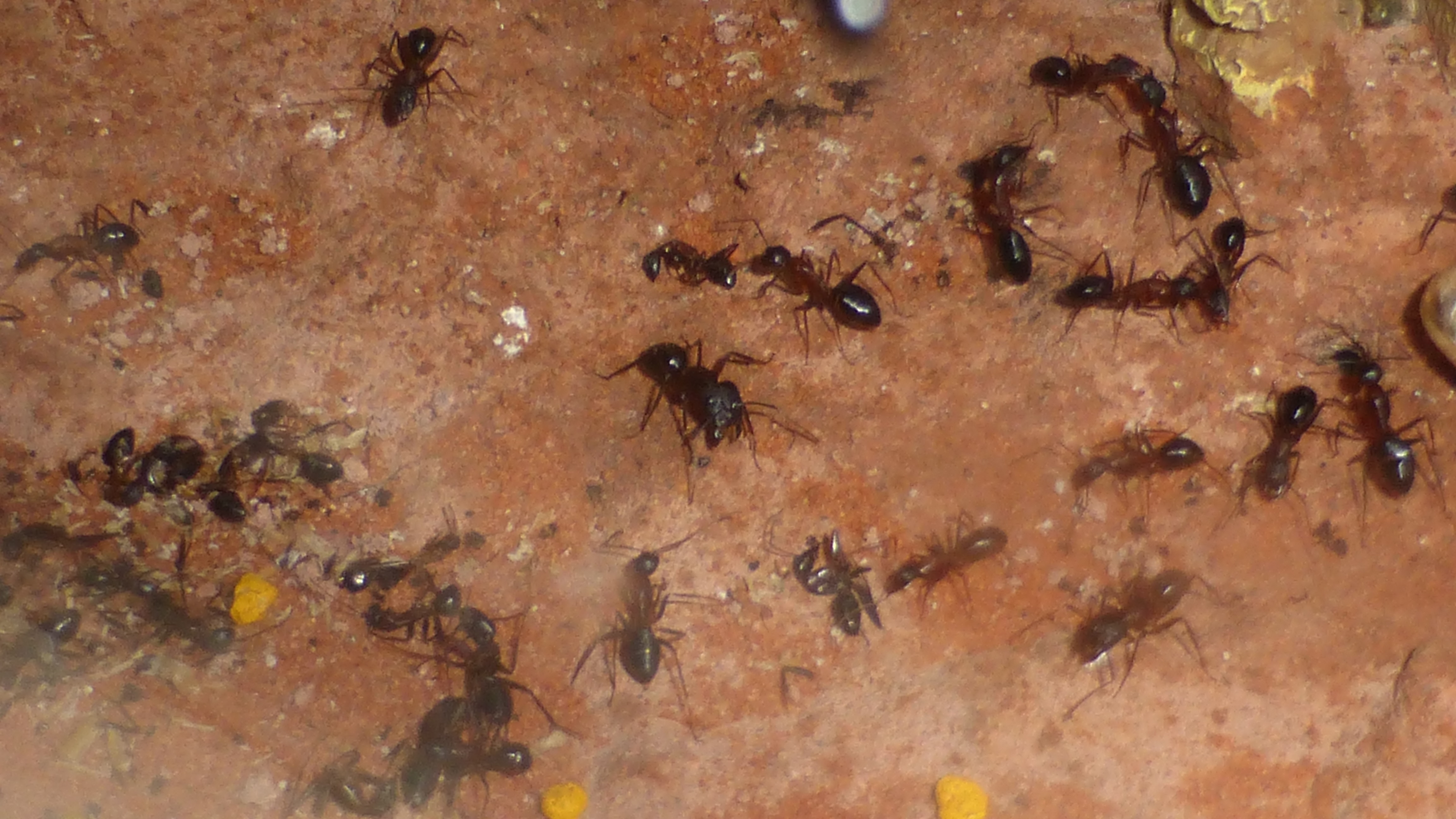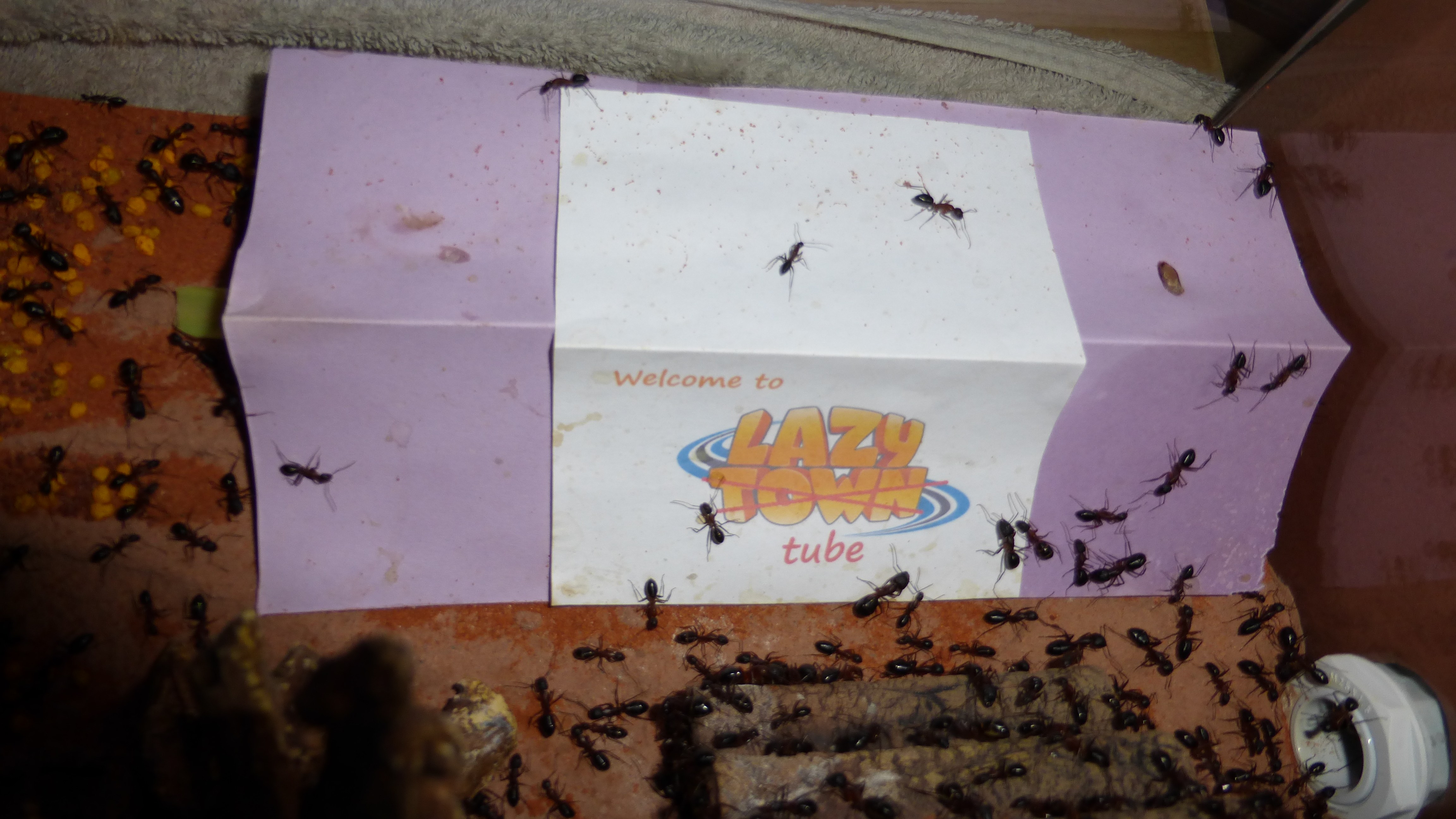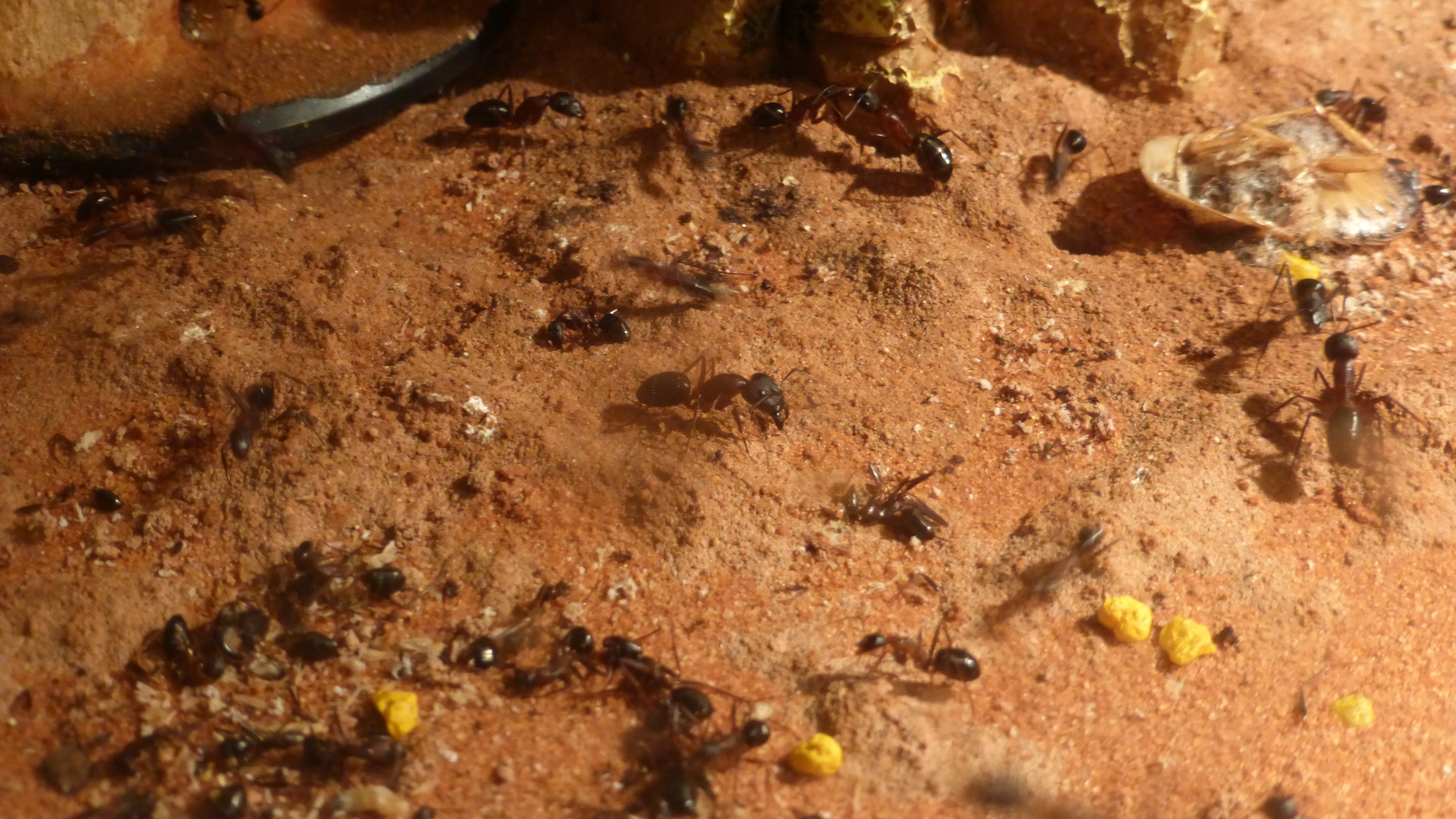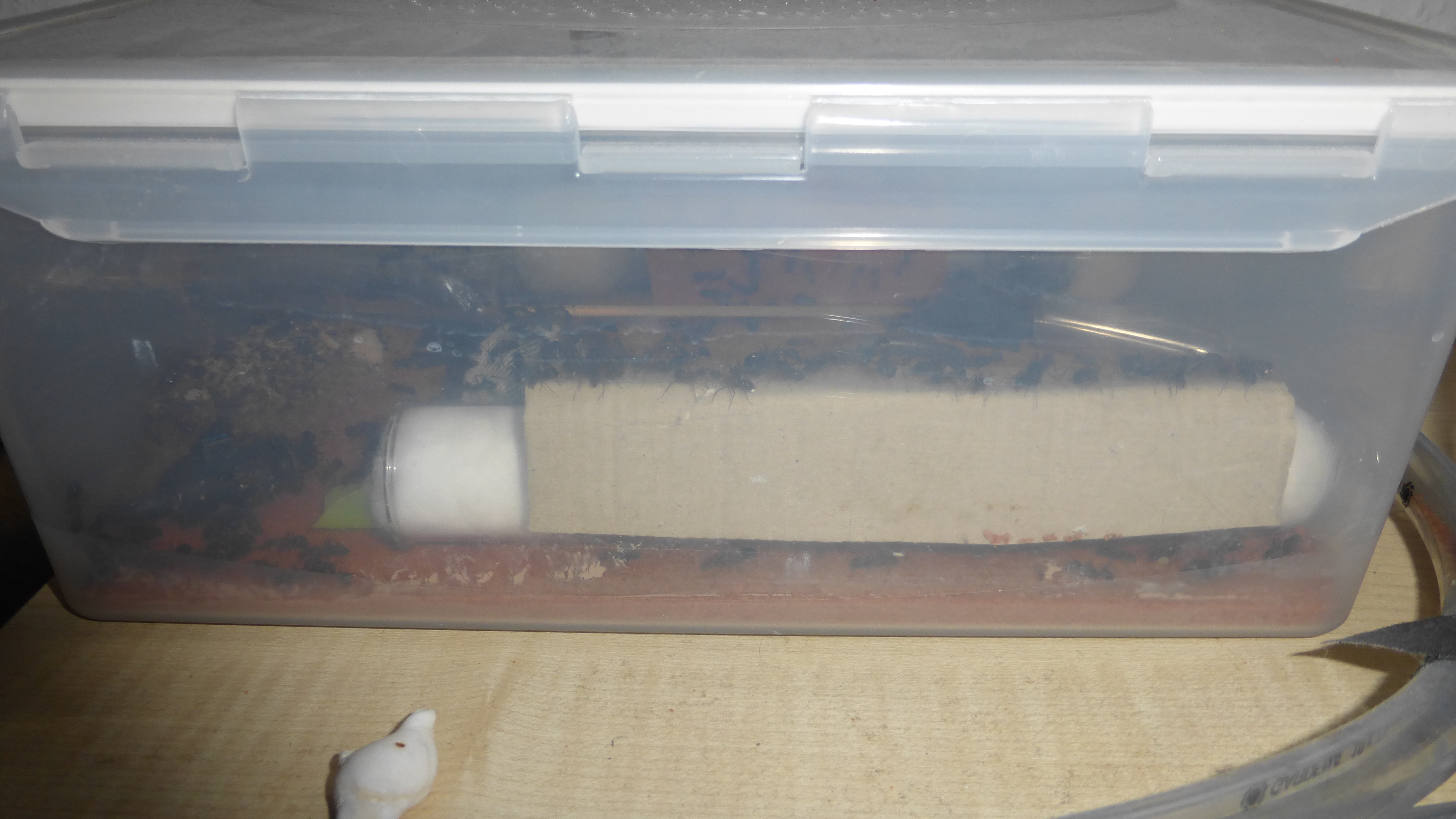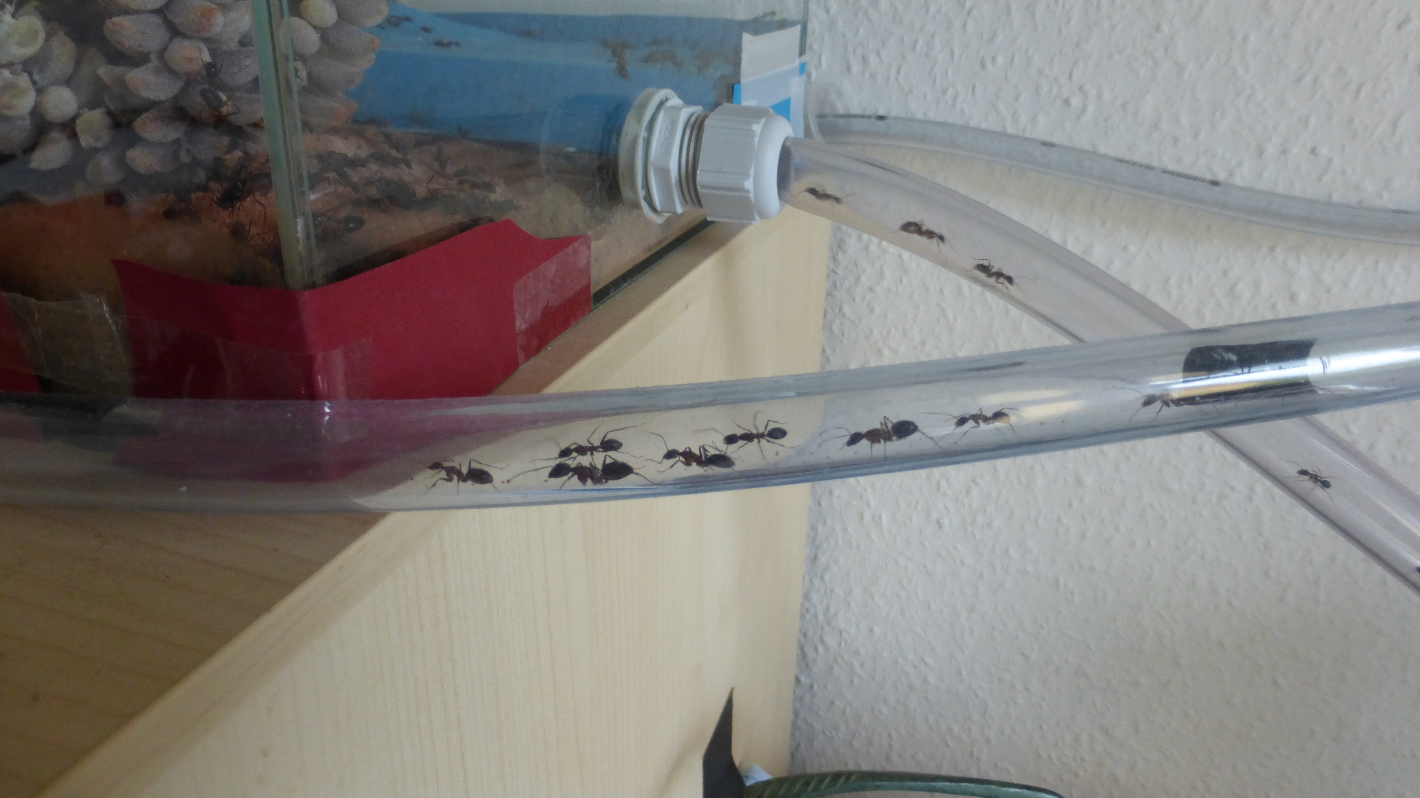 Erstaunlich viel Brut in der "Ende der Welt"-Box, wenn man bedenkt, dass ich noch nie gesehen habe wie sie Eier dorthin tragen. Bei Camponotus werden die Arbeiterinnen ja vom Eierlegen abgehalten, wenn sie regelmäßig in Kontakt mit Eiern der Königin kommen, deshalb sie die wohl da, aber keine Ahnung sie die dorthin kommen. Wahrscheinlich machen sie das irgendwann ganz spät, so um 4 Uhr nachts.
